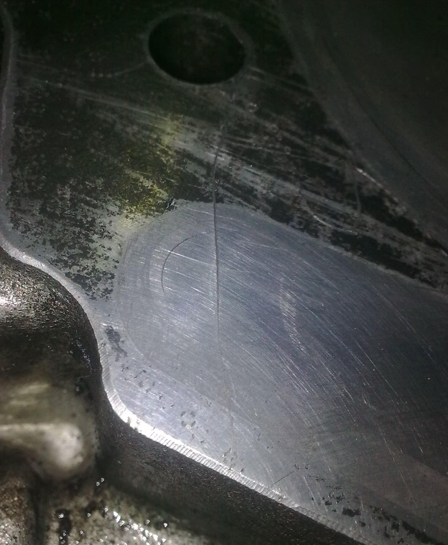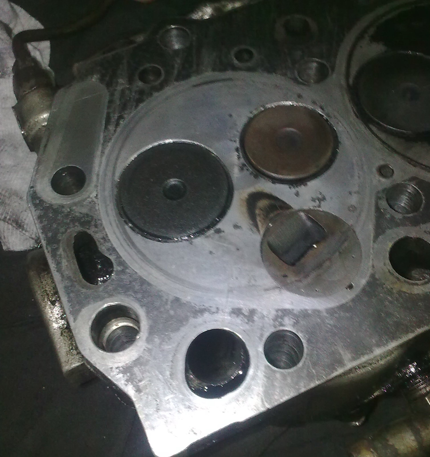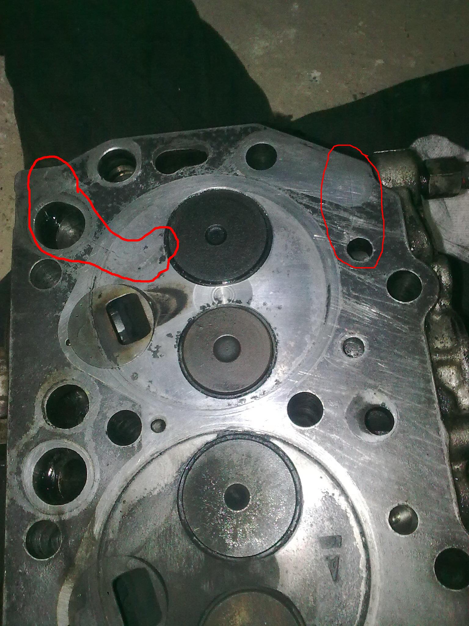 вот они чтоб глаза ненапрягать обвел трещина первая, уходит под седло клапана вспышка бликует, а без нее невидно трещина снаружи, через масляный канал бежит в рубашку охлаждения ну и общий ракурс, вроде тож трещины видно слушаю гипотизы..