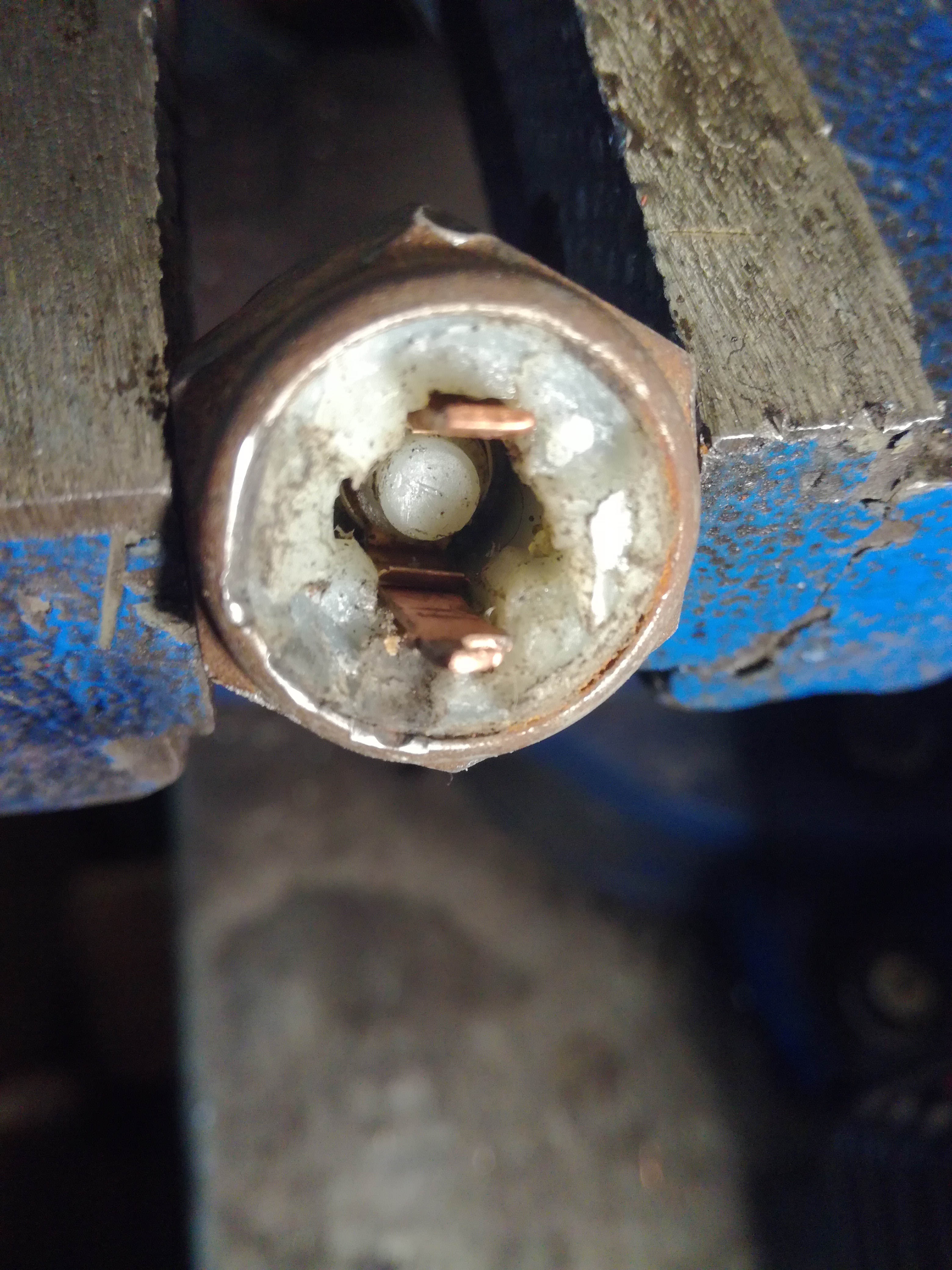 Вот так датчик выглядит внутри. Один контакт - корпус, второй - сигнал. К сигнальному и припаивается провод. Из 5 старых у одного был оборван провод, второй рассыпался в руках, третий рабочий полностью, четвертый имеет сопротивление 758 Ом, на пятом сопротивление 1,4 Ком. Короче – четыре нерабочие.