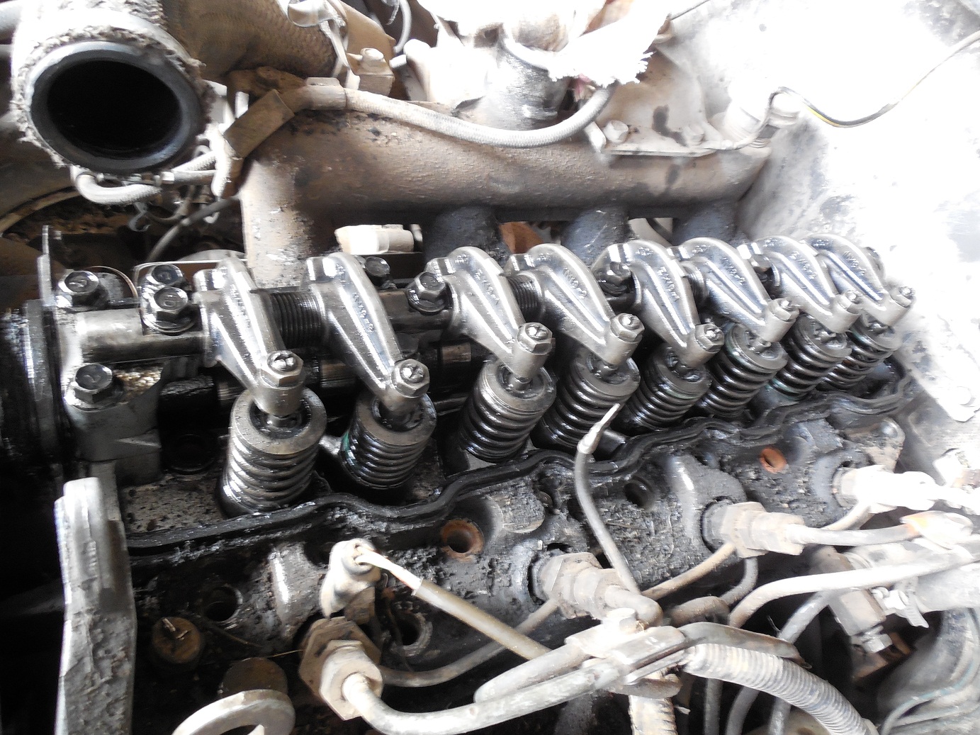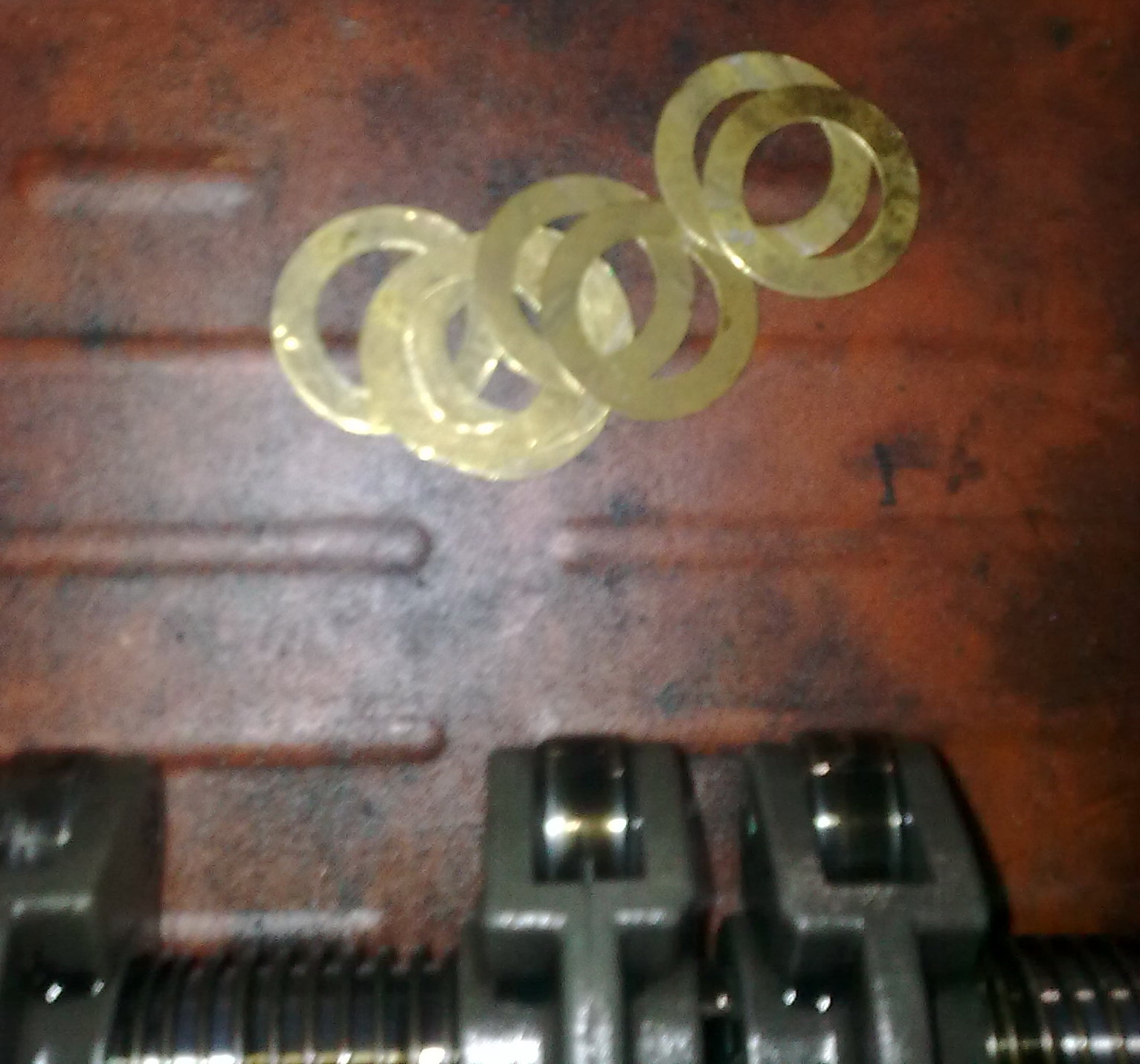 Скинул ось коромысел, снял рокера..точно, на каждом выпускном - выработка полумесяцем.. Все восемь колечек вставить неудалось)) места нехватает..или нада немного пружинку подтачивать..а потому поставил только на выпускные..