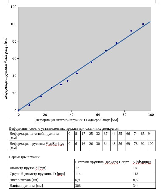Но т.к. ответа небыло, а пружины от Влада были, я решил, что проще самому найти эту нелинейность. Сжал домкратом две соосно расположенные пружины. Одна простая штатная линейная, от Паджеро спорт, а другая от Влада. Построил график... и не увидел никакой нелинейности на участке деформаций от 0 до 100мм. Пружина как пружина, сталь чуть менее жесткая, чем Паджеровская. И все. Прорыва в технологиях обработки стали что-то не наблюдалось.