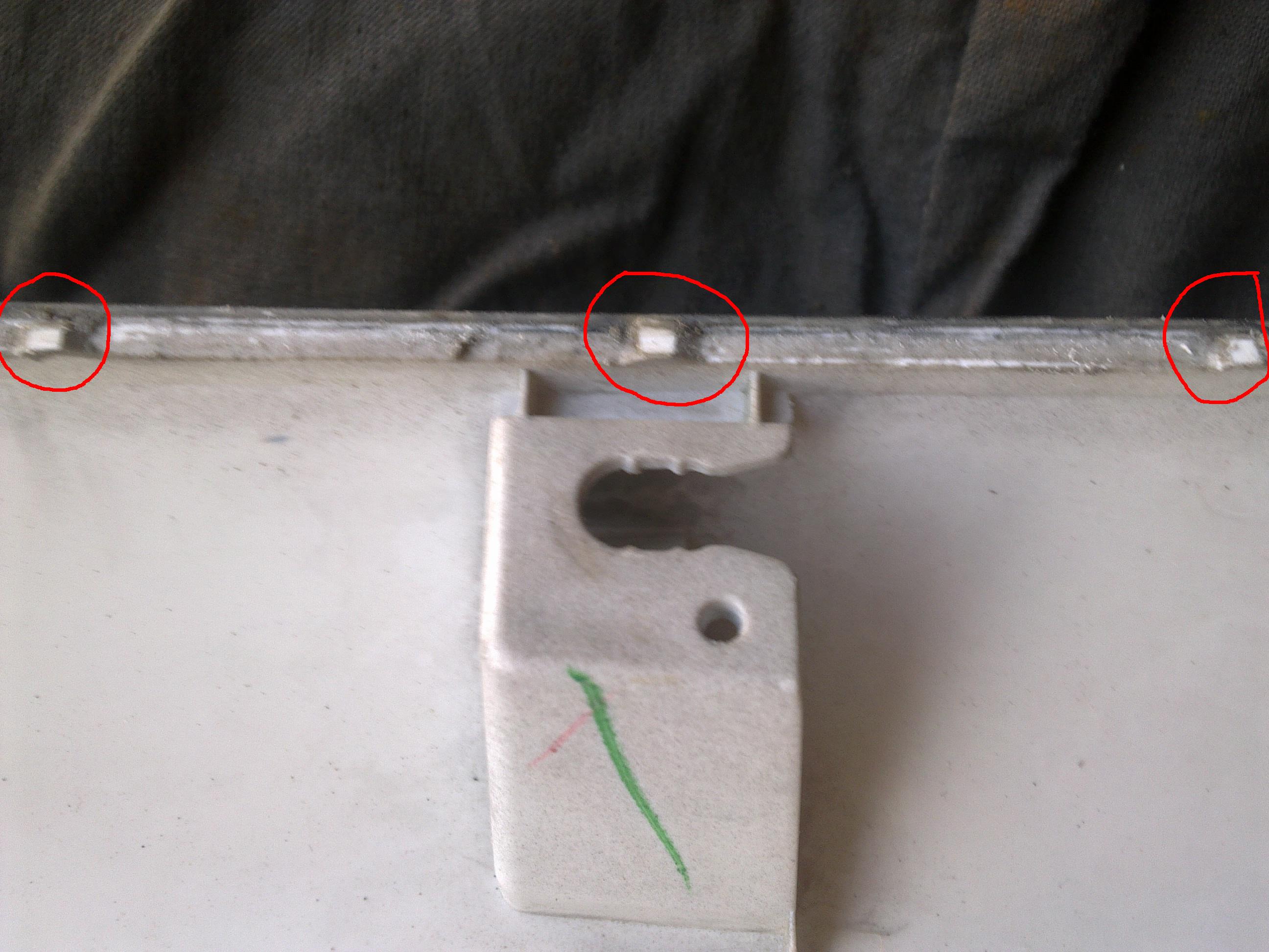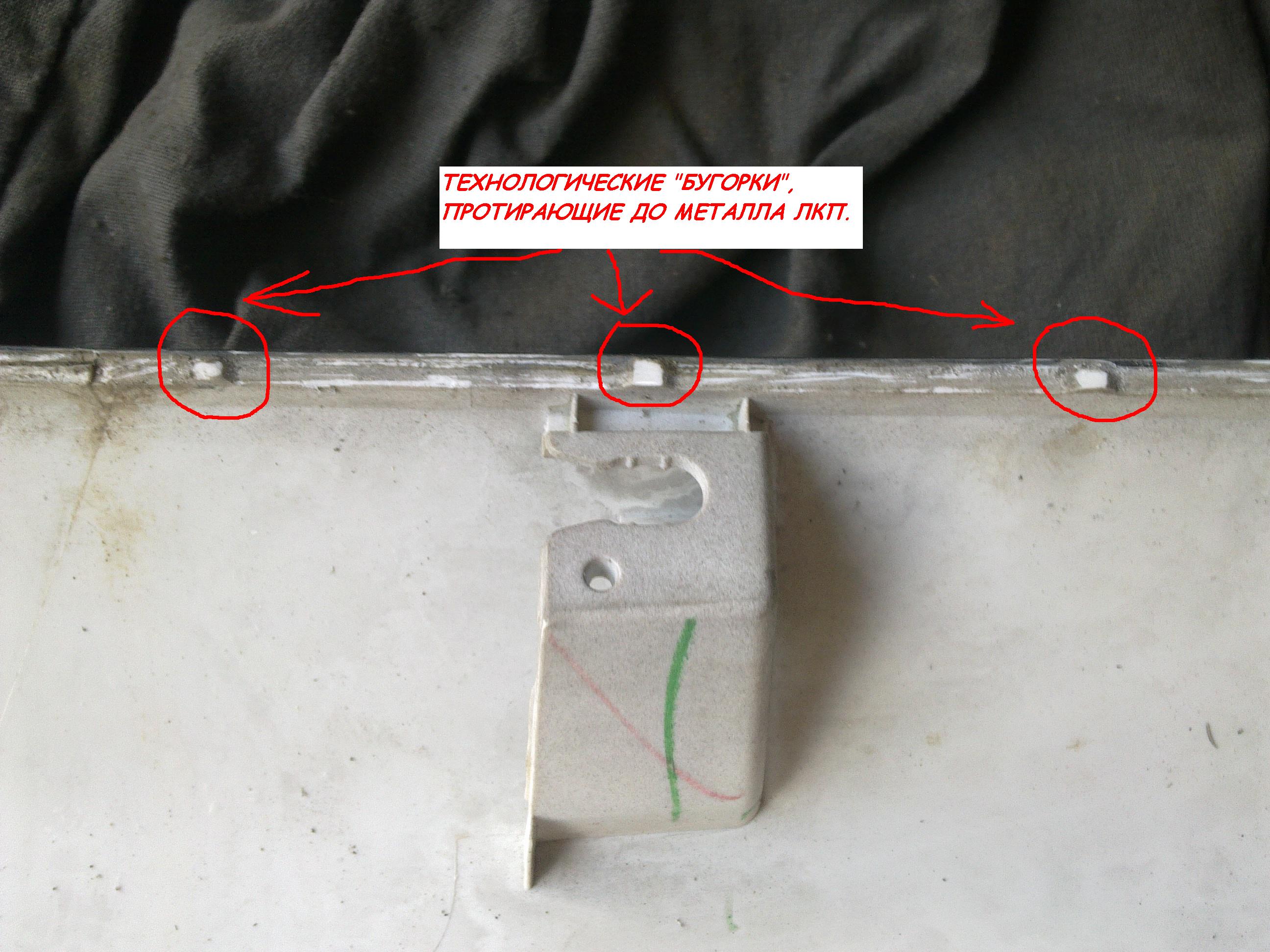 Далее убираем остатки скотча с двери задка и с панели. Скотч качественный, так что помучаться с ним придется. С двери остатки скотча оттирал с помощью куска толстой резины. «Химией» - растворителем, уайт-спиритом он очень хреново убирается, к тому же можно протереть краску. Решение попробовать резиной пришло спонтанно, результатом остался доволен. ЛКП резина не царапает совсем. С панели скотч удалял с помощью отвертки. Далее, я надфилем удалил с привалочной поверхности бугорки (см. фото) – «подарок» тайцев. Их там 6 штук, по 3 слева и справа, как раз там, где появляется коррозия на двери. Наждачной шкуркой прошел всю привалочную поверхность панели с целью удаления всяких заусенцев и неровностей. Устранил очаги коррозии, подкрасил, обезжирил места сопряжения двери задка и панели, на привалочную плоскость панели по периметру положил черный силиконовый герметик (ABRO), установил панель на дверь, защелкнул все клипсы, прикрутил на болты, удалил излишки герметика.