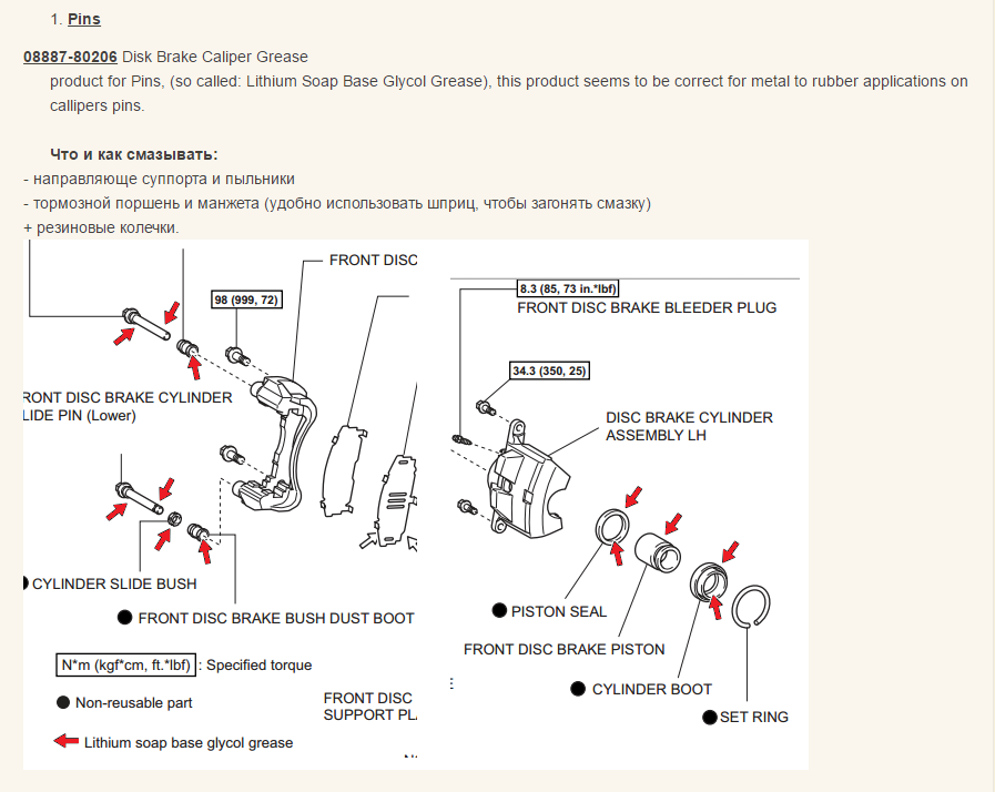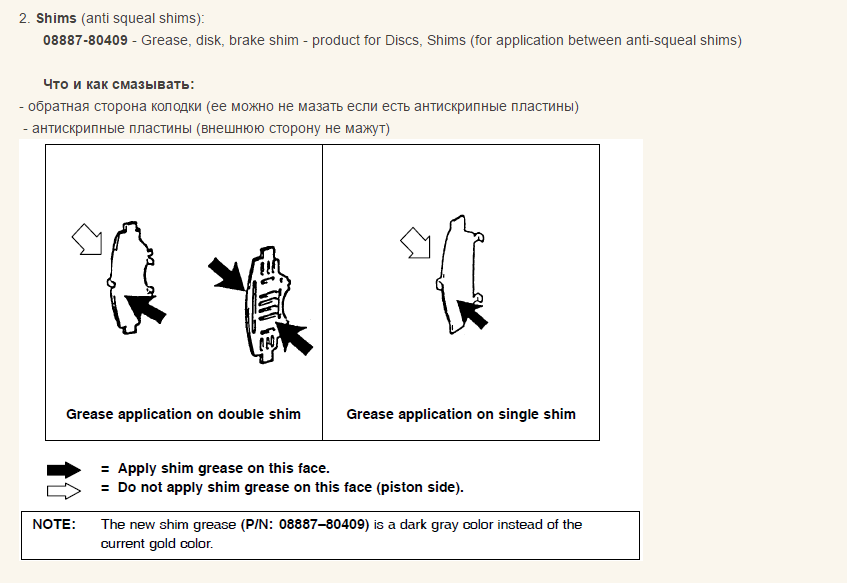 колодки. При осмотре ни чего криминального в переднем тормозном механизме не обнаружено. У оригинальных колодок износ 50%, на дисках слегка ощутимый пальцем бортик износа присутствует, все резинки целые и в хорошем эластичном состоянии, смазка на направляющих была уже темно-серого цвета, хотя на кончиках направляющих болтов виден остаток смазки белого цвета. Колодки заменены на Nisshinbo PF3414, смазка для направляющих использована из ремкомплекта передних суппортов FEBEST 0475V75F (смазка оранжевого цвета).