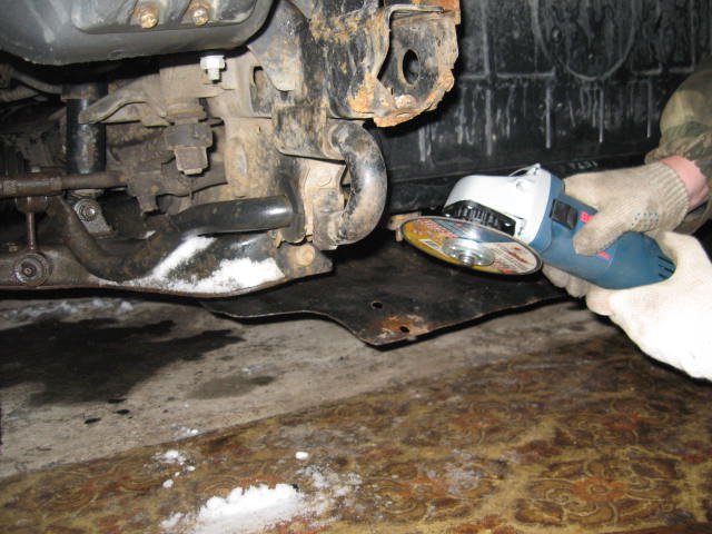 Вернее даже не в бампер (даже резать его не пришлось), а под него. За целый день практически всё успели, осталось доделать мелочи! Много времени, естественно, ушло на изготовление площадки из 20-го швелера (резка, сверление, примерка, покраска). Прикрепили площадку с лебедкой на болты, ничего не варили. Засада оказалось с установкой защиты (переднего листа). Купил новую Шерифовскую, а она не подходит по креплениям, так как крепления там совсем другие, чем у штатной и после установки площадки с лебедкой, места куда должна прикручиваться защита, закрыты самой площадкой и ни как к ним не подобраться не кромсая площадку. Было принято решение что-нибудь мутить со штатной (её тоже надо будет доробатывать, но уже не так критично).