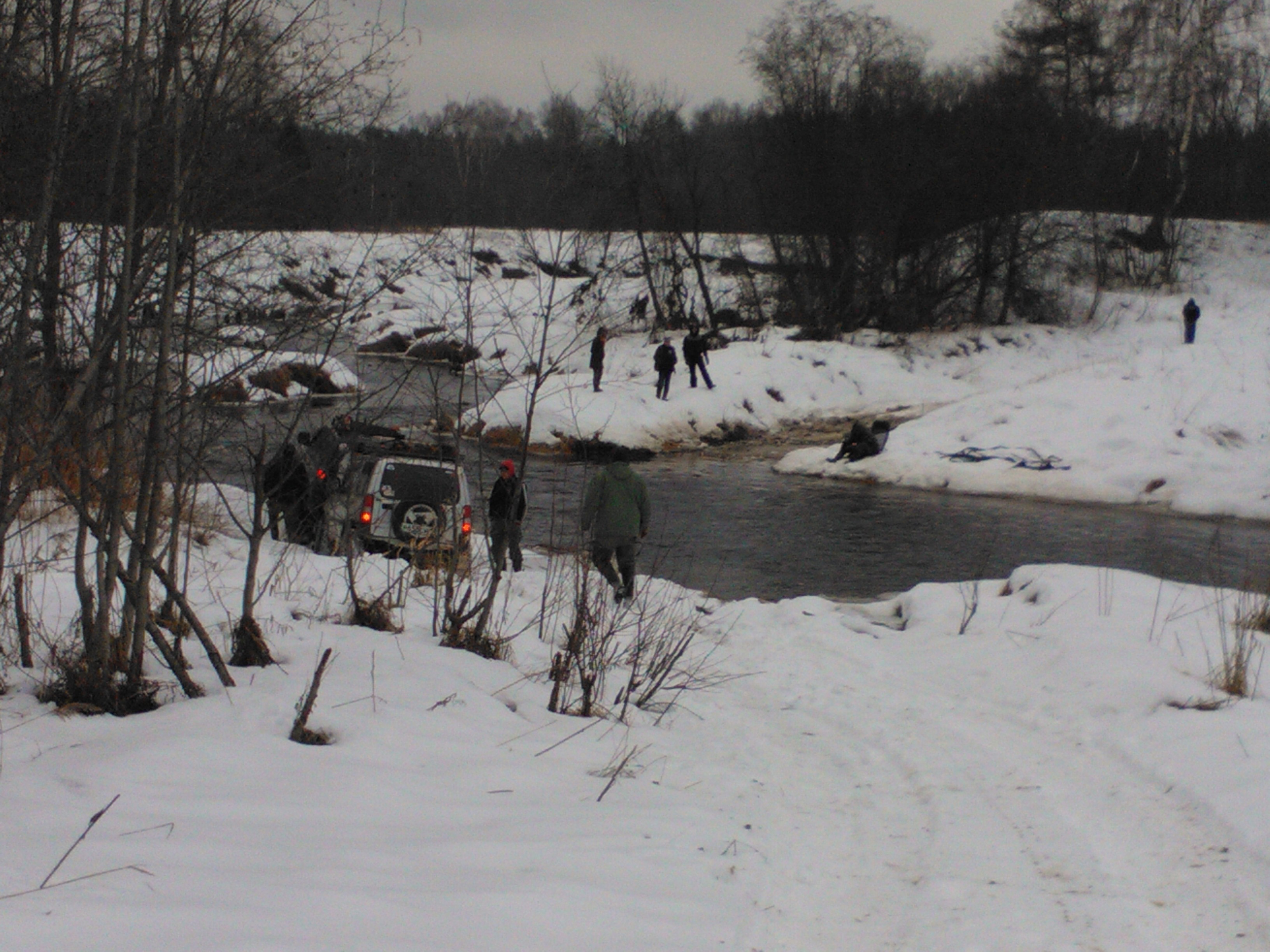 Потихоньку начал приходить в себя, руки стали слушаться, поэтому решил поделиться своими впечатлениями. Началось всё достаточно предсказуемо: по старой доброй традиции первую точку лагеря Ромик поставил в таком месте, что до неё он сам добирался полтора часа на лебёдке, при этом разбортировав 35 симекс. Скажу Вам по секрету это он так пытался напугать тех, кто приехал на машинах не соответствующих требованиям экспедиции, короче у него ничего не получилось, мы его просто объехали, помогли поменять запаску и все дружно оказались в лагере. Думаю не для кого не секрет, насколько дружно и весело Паджеро клуб умеет отмечать свои встречи, тем более после Нового года, поэтому на следующий день вместо 11.00 мы выдвинулись в 14.00. Маршрут получился средней сложности, шли достаточно слаженно без особых проволочек, но когда стемнело упёрлись в болото, предварительно его размесив до состояния однородной массы несколько экипажей пробились вперёд, все проходили его исключительно на лебёдке, я шёл последним, передо мной лебедили Фею, её машина вообще не хотела двигаться как будто её заякорили, часа через два неимоверными усилиями её всё таки удалось вытащить на свободу. Потом мне пришлось достать лопату и срывать колею через каждый метр иначе лебёдка отказывалась тянуть, короче говоря примерно через час я выбрался, к этому моменту ребята уже разбили лагерь и через час всю усталость как рукой сняло. Спасибо Тимохе за блины и глинтвейн (он был нереально вкусный), Юле за трубочки в лаваше, Диме за обалденный гороховый суп с копчёностями, короче всем огромное спасибо за компанию, в итоге зажгли мы не по детски, утром я вынимал себя из спальника по частям… Думаю даже не надо объяснять во сколько мы на следующий день стартанули из лагеря. Маршрут был достаточно лайтовым и все без труда добрались до дороги с твёрдым покрытием, далее мы попрощались с большей частью состава нашей экспедиции и в составе трёх экипажей (Ромик, я и Лёня) двинулись покорять неизведанное… Добравшись до Писцово мы затарились жизненно необходимыми продуктами для экспедиции (коньяк, пиво, вода) и тронулись в сторону урочища Чистое, в начале ничего не предвещало неприятностей трасса полностью лайт, небольшой ручей в котором я немного закопался, дальше поле, вполне проходимое, подъезжаем к лесу, Ромик спокойно продолжает движение и вдруг резко проваливается в колею практически до уровня окон, лебёдка не помогает, через блок с большим трудом вытаскиваем его, Лёня решает ехать через лес, ломая молодняк, ему это удаётся, но в конце всё равно приходится лебедиться, я в раздумьях по какой дороге поехать, принимаю решение ехать по следам Ромика только в разрез колеи, миллиметр за миллиметром под чутким руководством Ромы, мне удаётся проехать, не соскочив в колею. Наступает чувство свободы и я получаю хорошую порцию адреналина. Дальше двигаемся без особых проблем, но приходится очень много пилиться, вдруг обрывается цепь у пилы, наступает чувство оцепенения, неужели из за такой мелочи экспедиция провалена, я начинаю корить себя, что не взял свою бензопилу, но Ромик знает, что в нашем деле мелочей не бывает и с улыбкой на лице достаёт новую цепь. Едем дальше дорога сложная, но вполне проходимая. В очередной засаде Рома в прыжке падает задними колёсами на бревно и блокировка ломает ему полуос