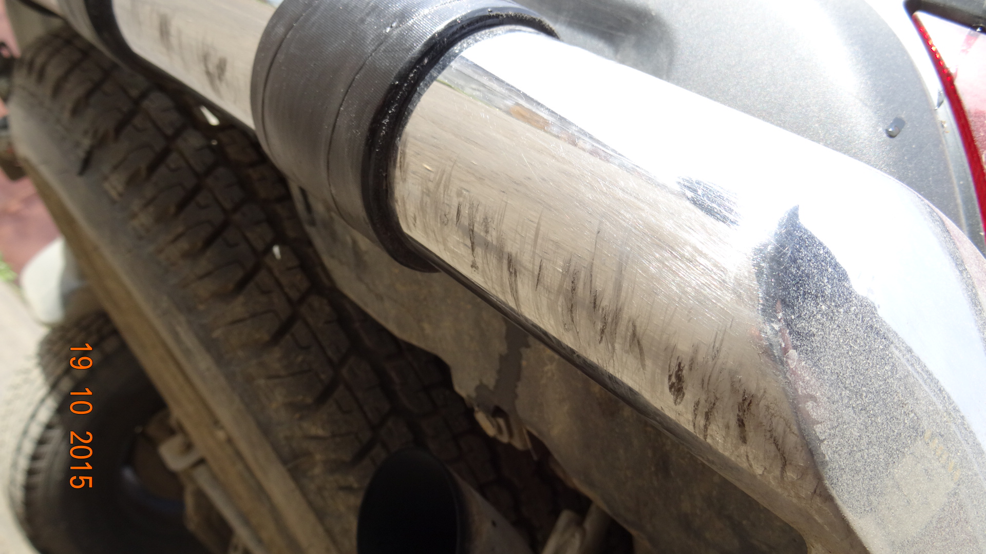 Возможно, но не всегда. Если взглянуть на фото, то видно, что труба заднего бампера, имеет царапины повреждения не в средней части, где запаска, а ближе к правому борту, где никакой защиты уже и нет, да и запаску жалко драть, она ведь то же денег стоит, соизмерима стоимости самой трубы.АлександрК писал(а):Сзади бампер наиНМПСе при "сползании" с препятствия не страдает, так как роль опоры в таком случае играет запаска, без всякой трубы.