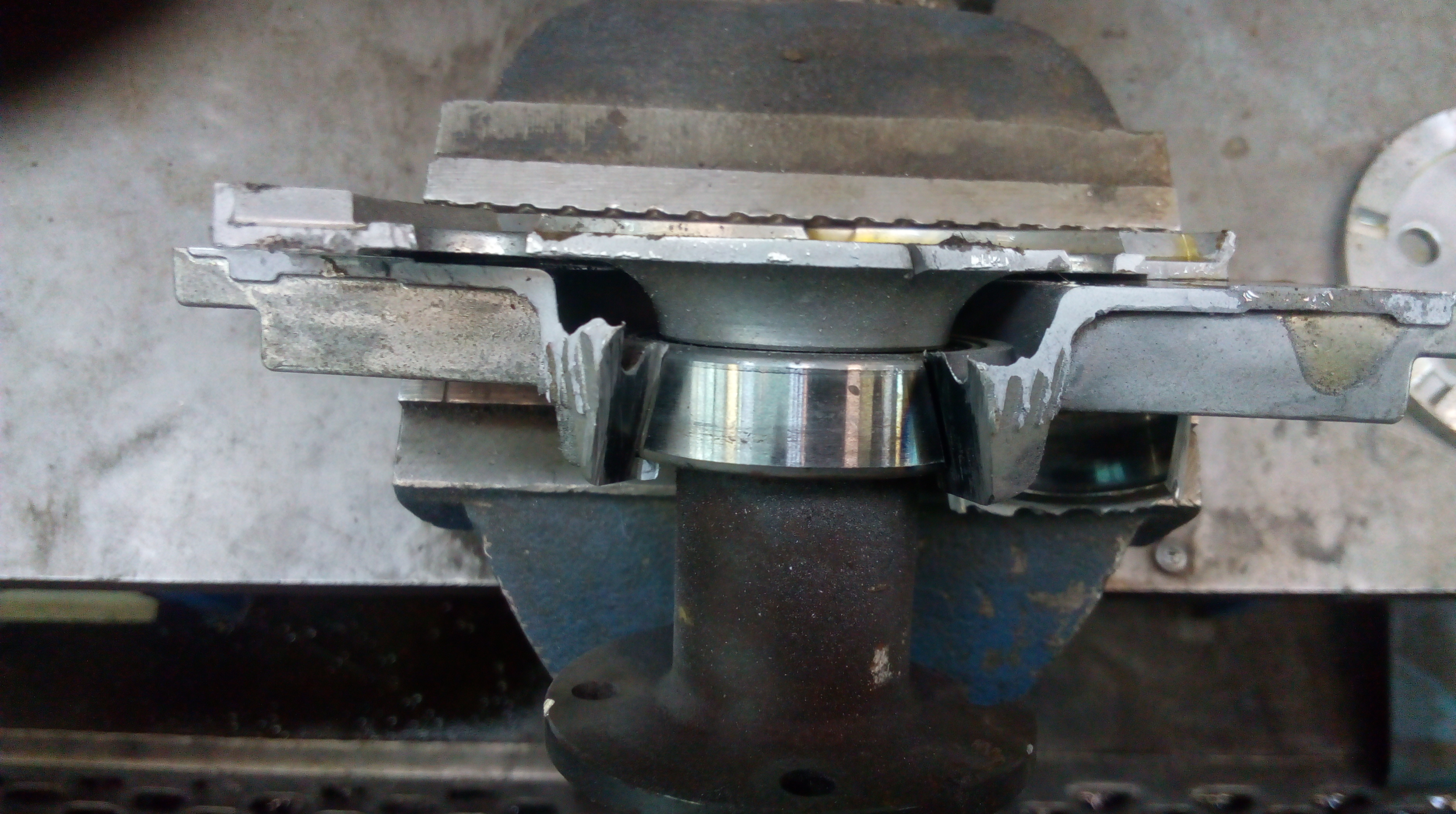 После снятия развальцовки, спресывываем центральный вал. Нарезаем резьбу. Выпресовываем подшипник из корпуса. Нужно будет повозится с наружкой обоймой)))