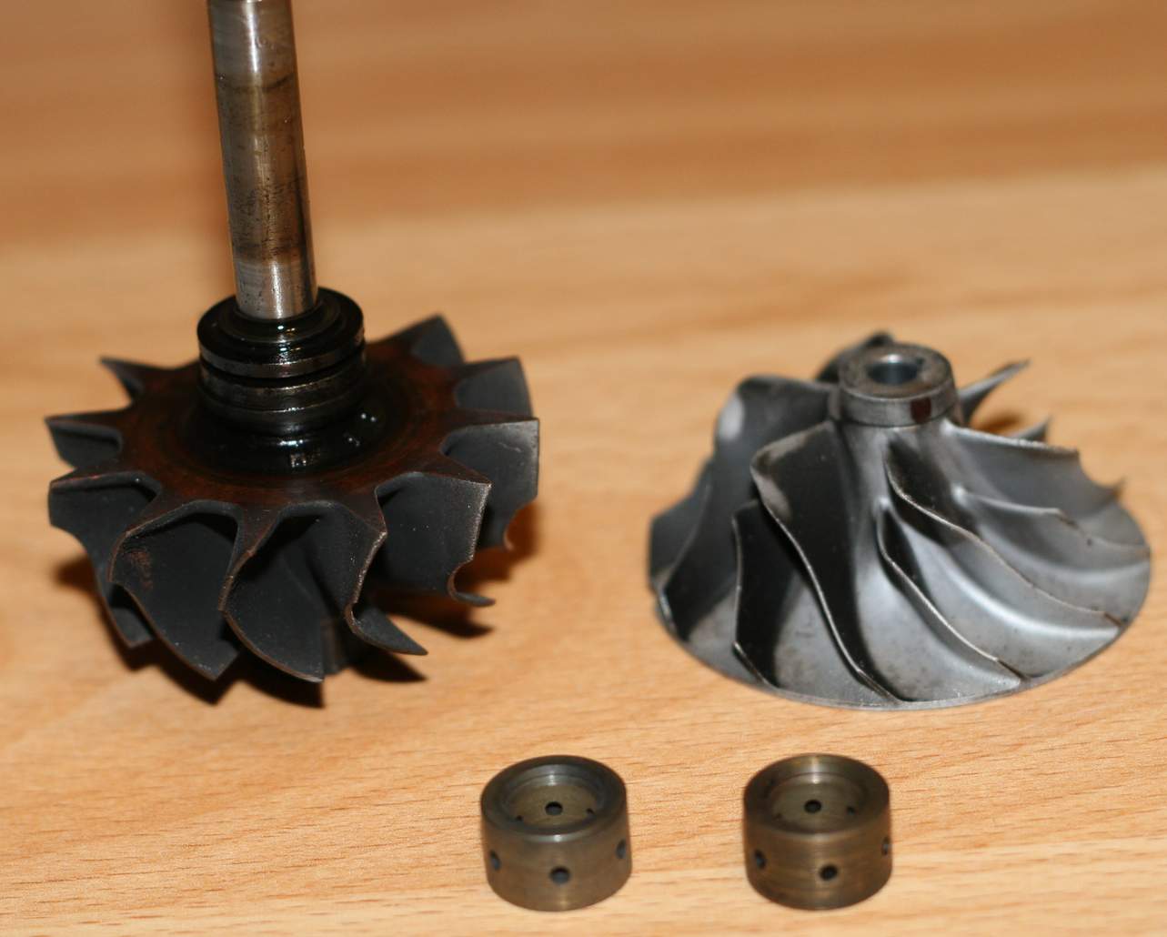 2. разбор турбины показал: вал с небольшой выработкой, нагар небольшой присутствовал, в районе уплотнительного кольца со стороны турбины побольше, очистился без проблем. Уплотнительные кольца: со стороны турбины - поджареное, не пружинит, заменено! Со стороны компрессора - норма, не менял (Наверное зря, об этом ниже). "Желтенькое" полукольцо имеет следы подточки - заменено. На нём стальная упорная втулка, имеет следы потертости, была заменена. Упорная втулка, на которую крепиться маслоотражающая жестянка потертостей и выработок не имела, оставил старую. Стальную крышку тоже не менял. Резиновые колечки облеглись по месту, потому тоже заменил. Стопорные кольца не менял.