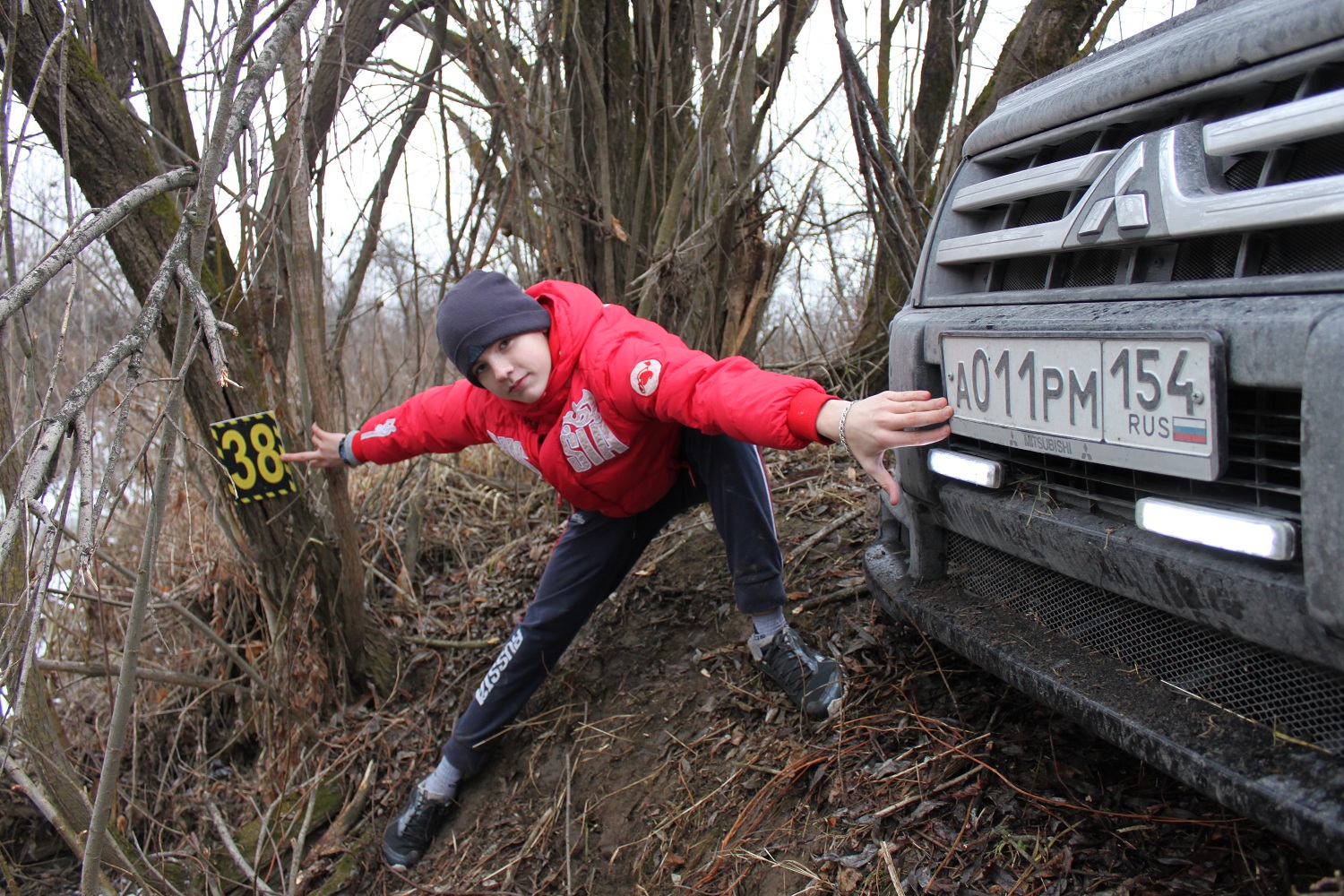 визуально кажется пологая дорога но там спуск, машина поползла, пришлось привязать к дереву, стравливаться и УАЗом вытягивать обратно, т.к. в самом низу овраг оказался была вероятность без остановки уйти в него и сделать "уши"