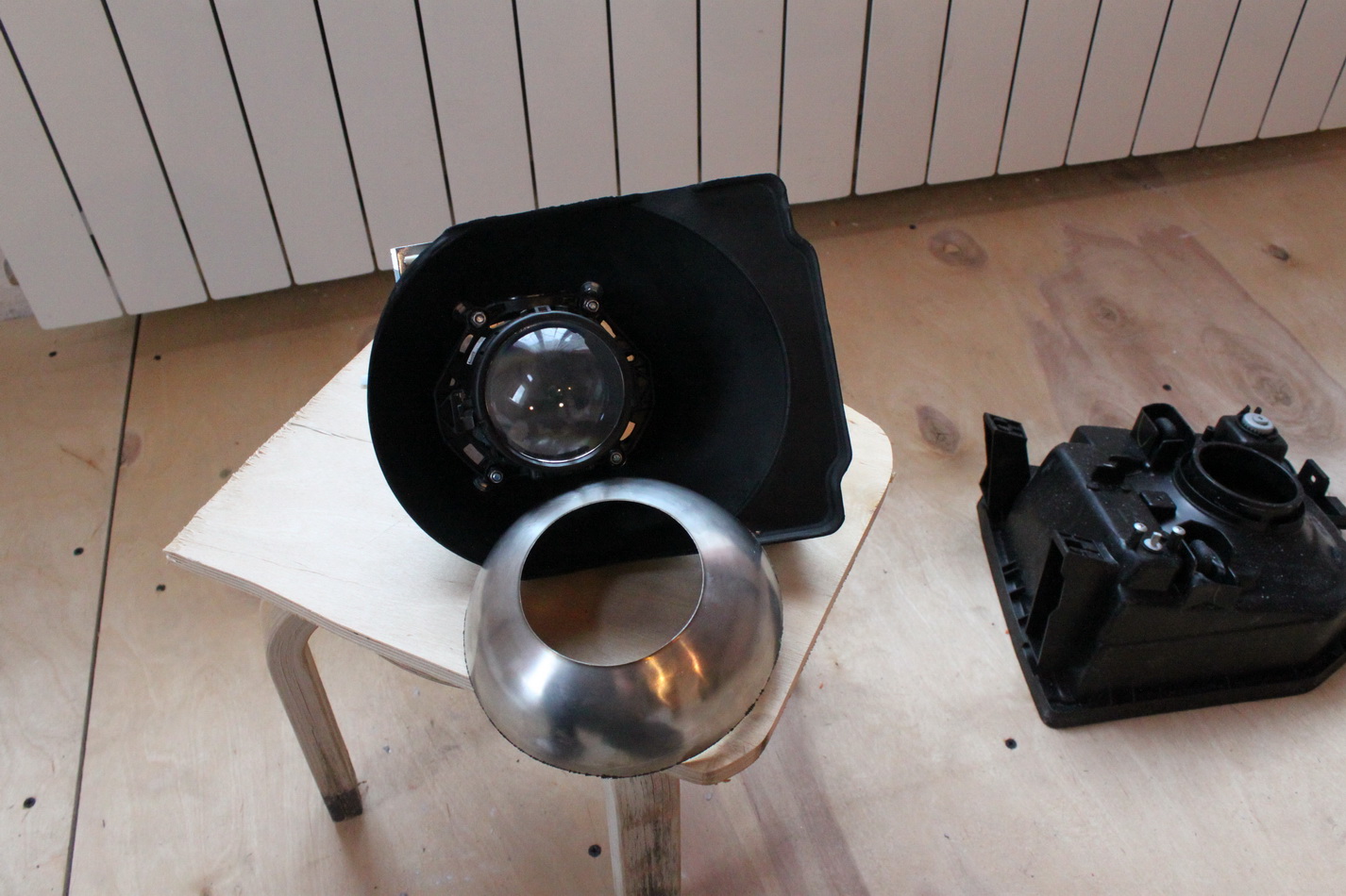Я на П2 крепил интемо на винты м4 длинной 40мм, центральное отверстие около 50мм- не критично, главное , чтоб модуль не касался отражателя хвостовиком , все соединения сажал на фиксатор резьбы Локтайт, в качестве бленды использовал миску из нержавейки, сверху все стеклоструил в гидроабразивке и красил черным (до сборки естественно), свет выводить по левому горизонту , центр фары ориентировал на угол первого подъема вправо от горизонта. Может Фокс поправит.