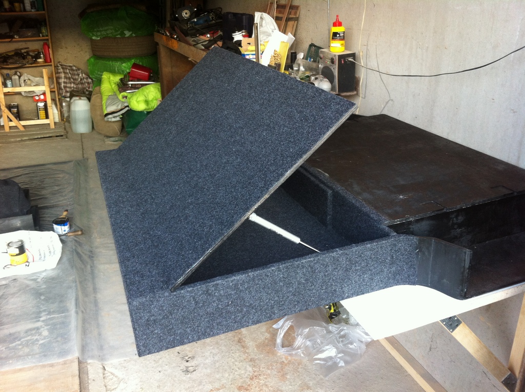 да и зазор у корманчиков будет неэстетично ( штатного резинового коврика в багажник у меня пока нет) . передний отсек (который без ящиков) решил делать без разделения брусом надвое (как у Тундера разделено) а для необходимой опоры крышки поставлю только два вертикальных столбика. тогда в отсек удобнее будет складывать стальные тросы- удлинители, например, или другое габаритное, чтоб не ограничиваться перегородкой посредине второго отсека.