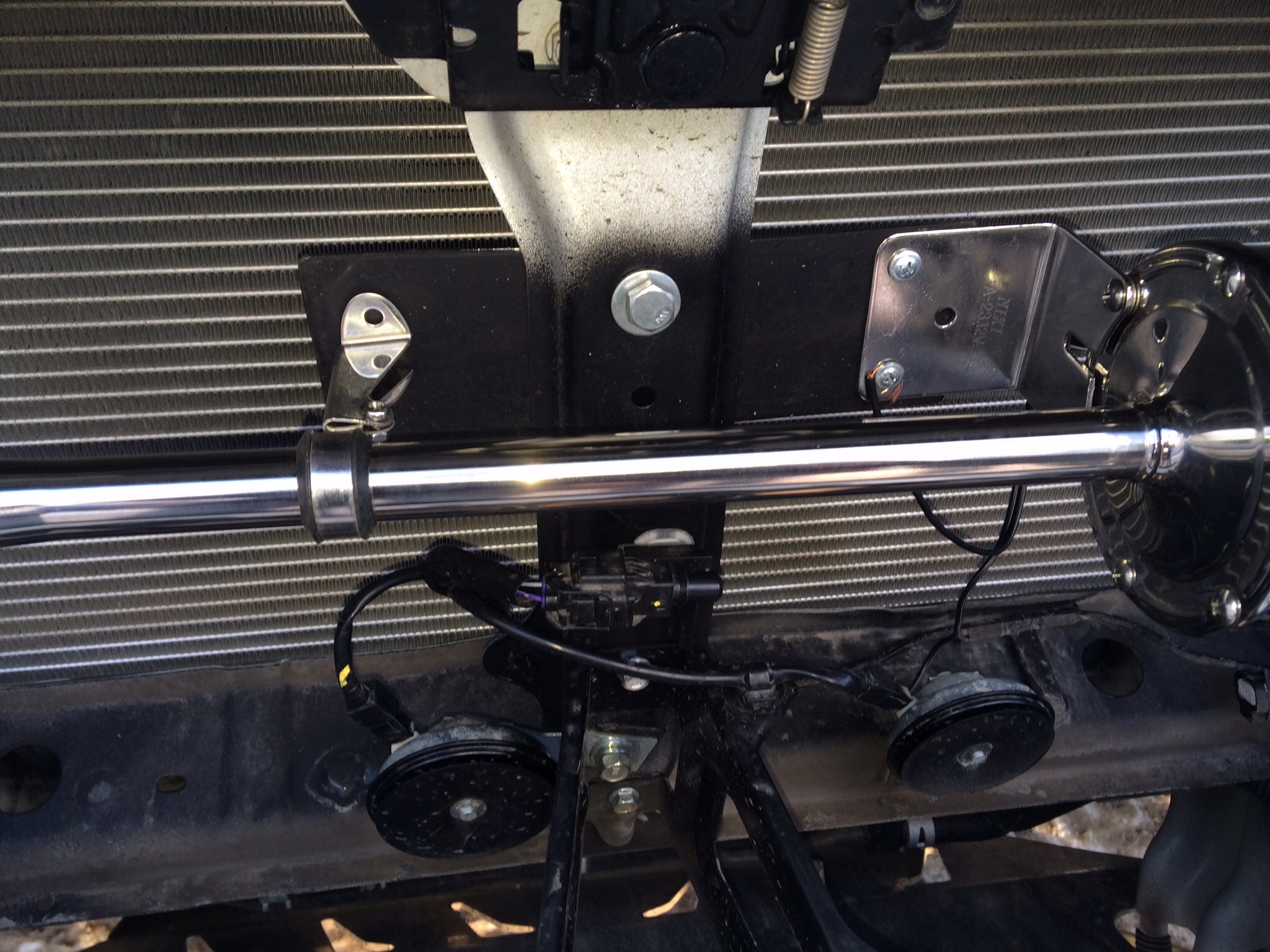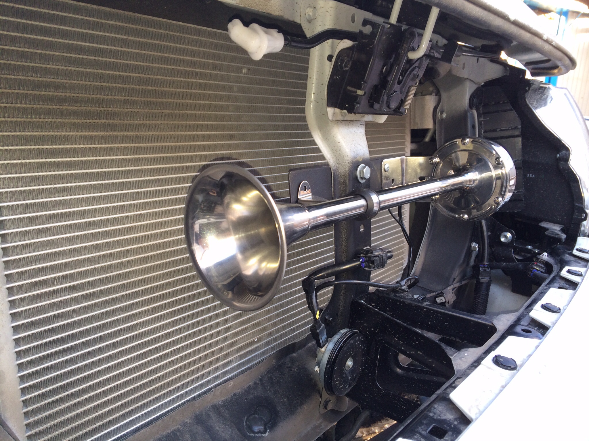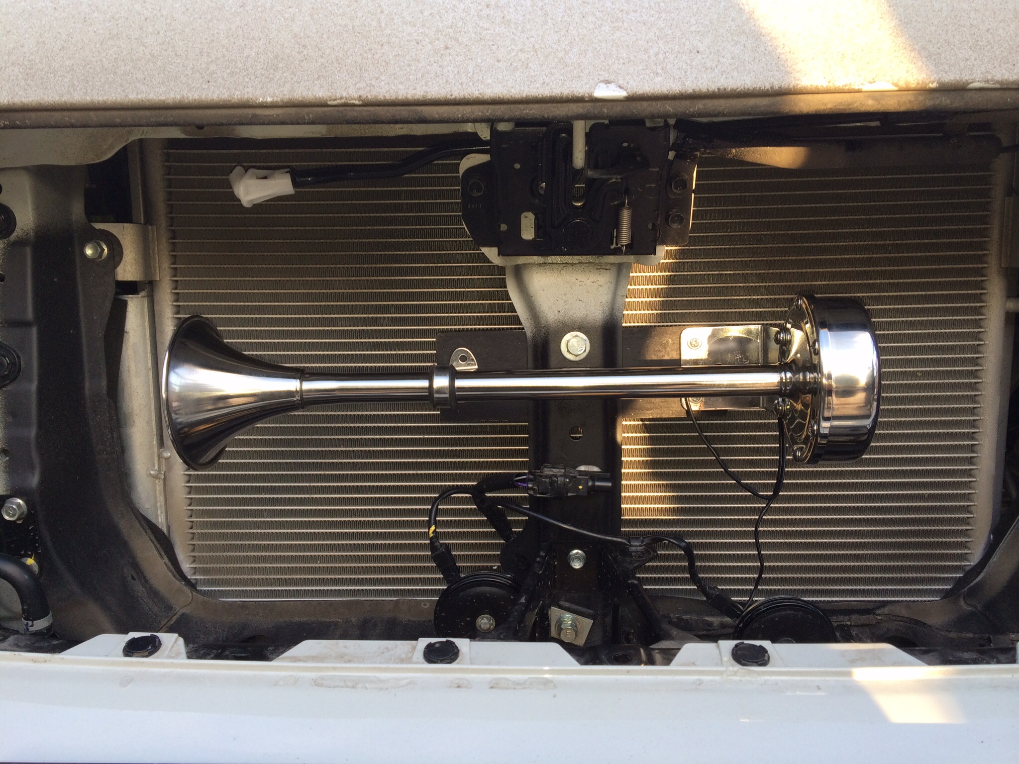 Сфотографировал. И сигналы на авто, и коробку из под них. Фото с рулеткой для тех, у кого имеется допрадиатор. Ракурс постарался взять по вертикали. В моём варианте монтажа и при его (радиатора) наличии, думаю проблем не будет. За беспорядок в проводах сорри, пока не прибрался))) Стяжки уберу, пока являются маяками. По грязьке видно всё будет))) Скорее всего, для нижнего сигнала поставлю ещё одну точку крепления на кузов.