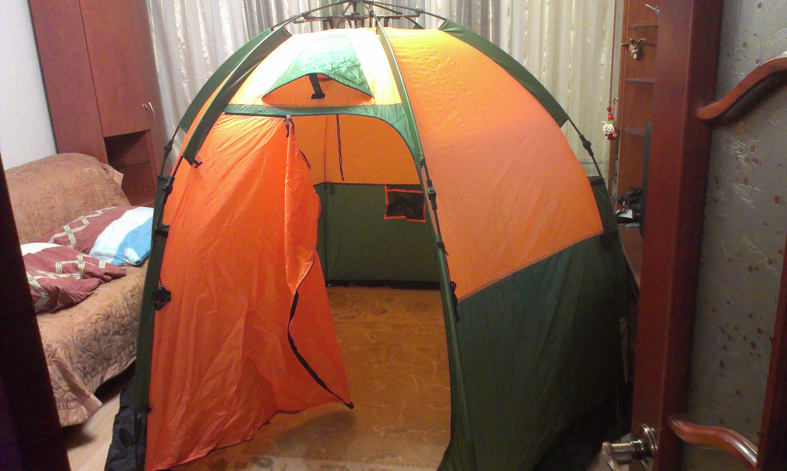 Палатка прикольная. Просторная. Моно поставить столик, на него бутылочку - красота. Сбоку луночку.