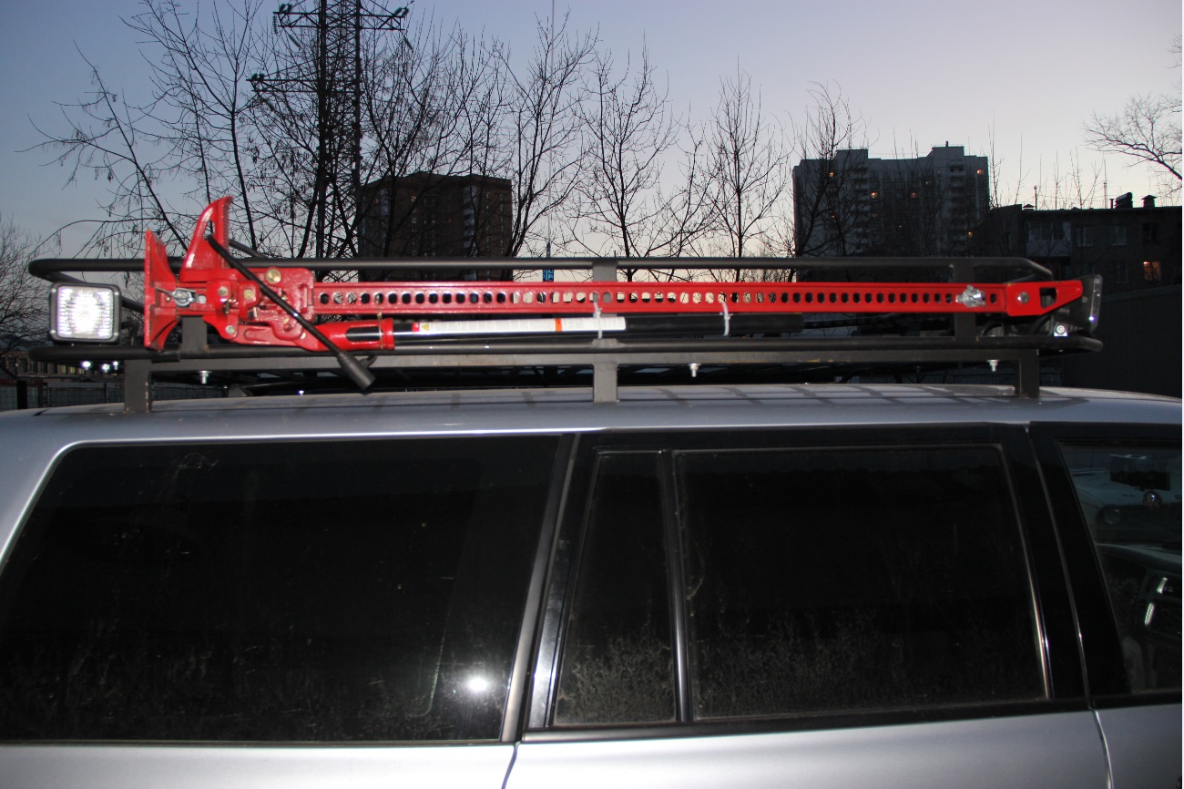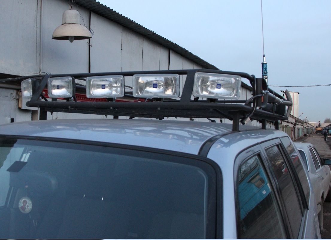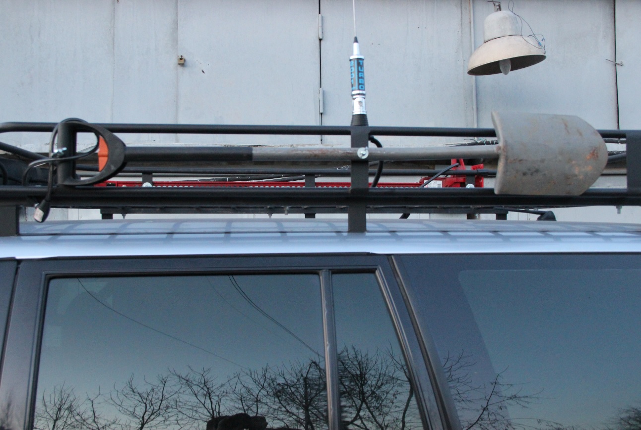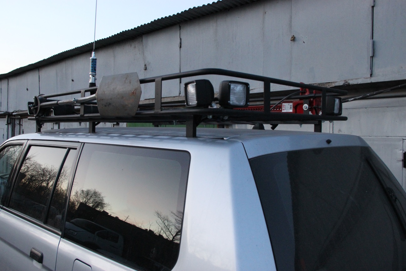 Силовые рейлинги и корзина от Winns, 5 фонарей Hella Comet 550 спереди, 2 рабочих света Hella сзади, по одному фонарю рабочего света Hella по бокам в задней части автомобиля, реечный домкрат Hi-Lift 605 (147 см), антенна для рации Lemm AT-2001 Turbo (Коэффициент стоячей волны настраивал Б-168), рация MegaJet MJ-600 Turbo, лопата Fiskars, силовые пороги от МШУ.