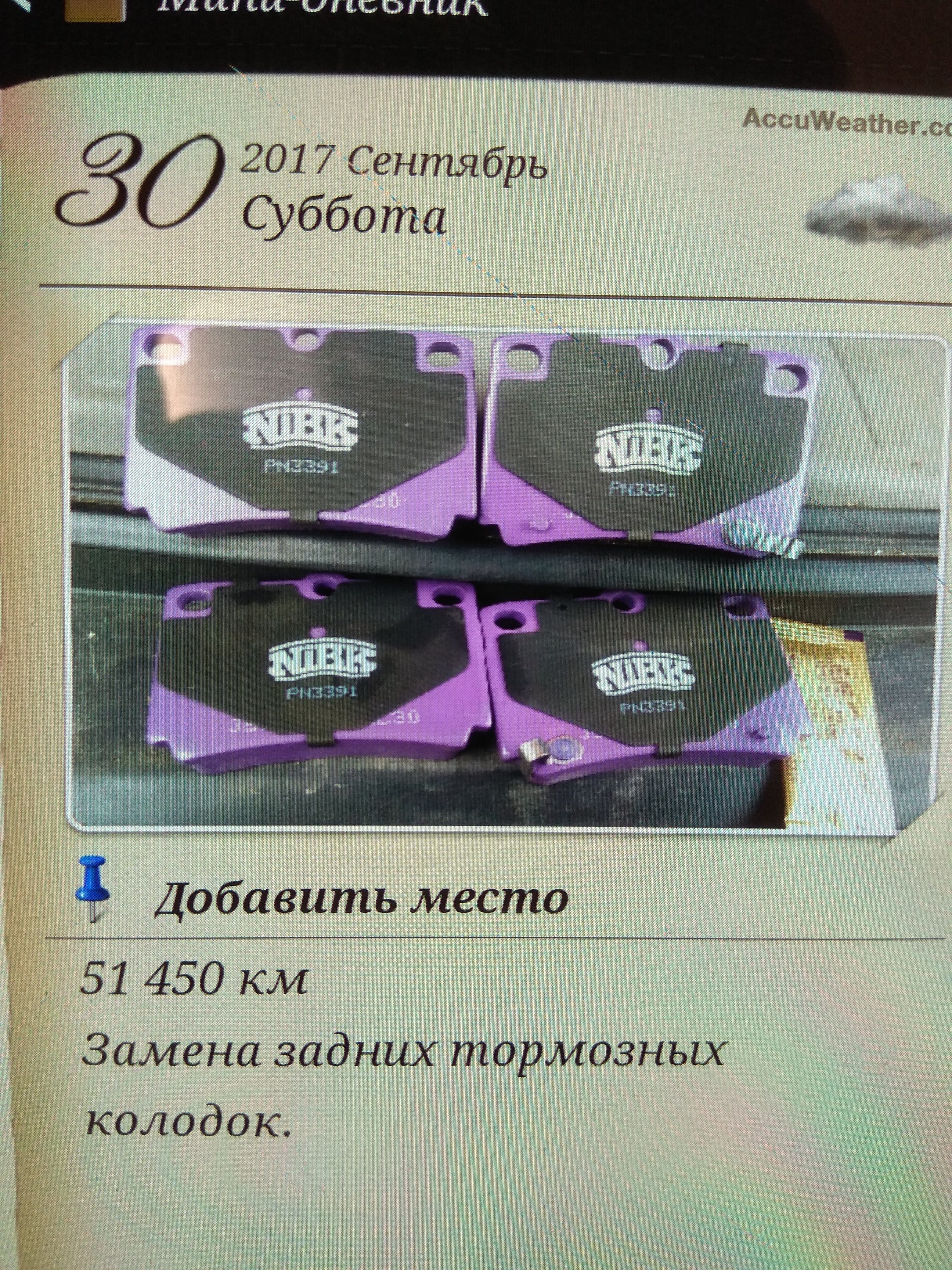 30.09.2017 пробег 51450 км задние тормозные колодки были заменены. Поставил NIBK.