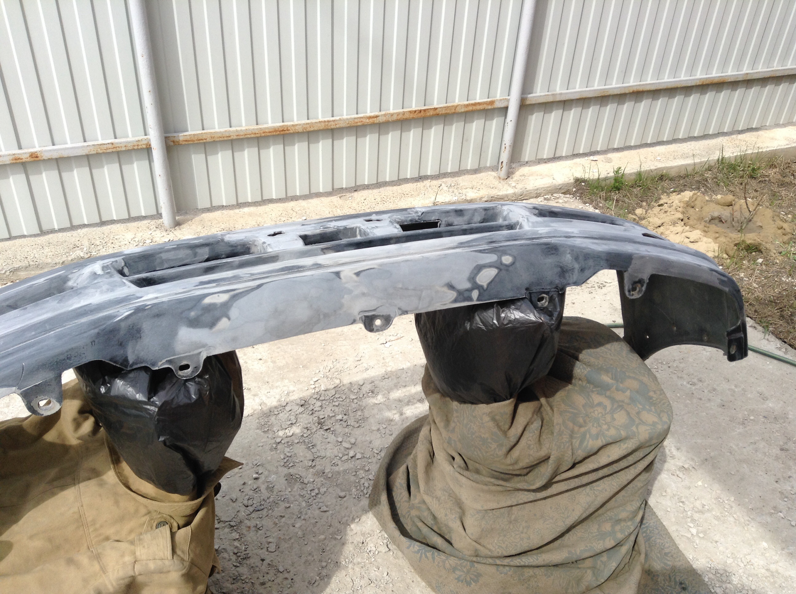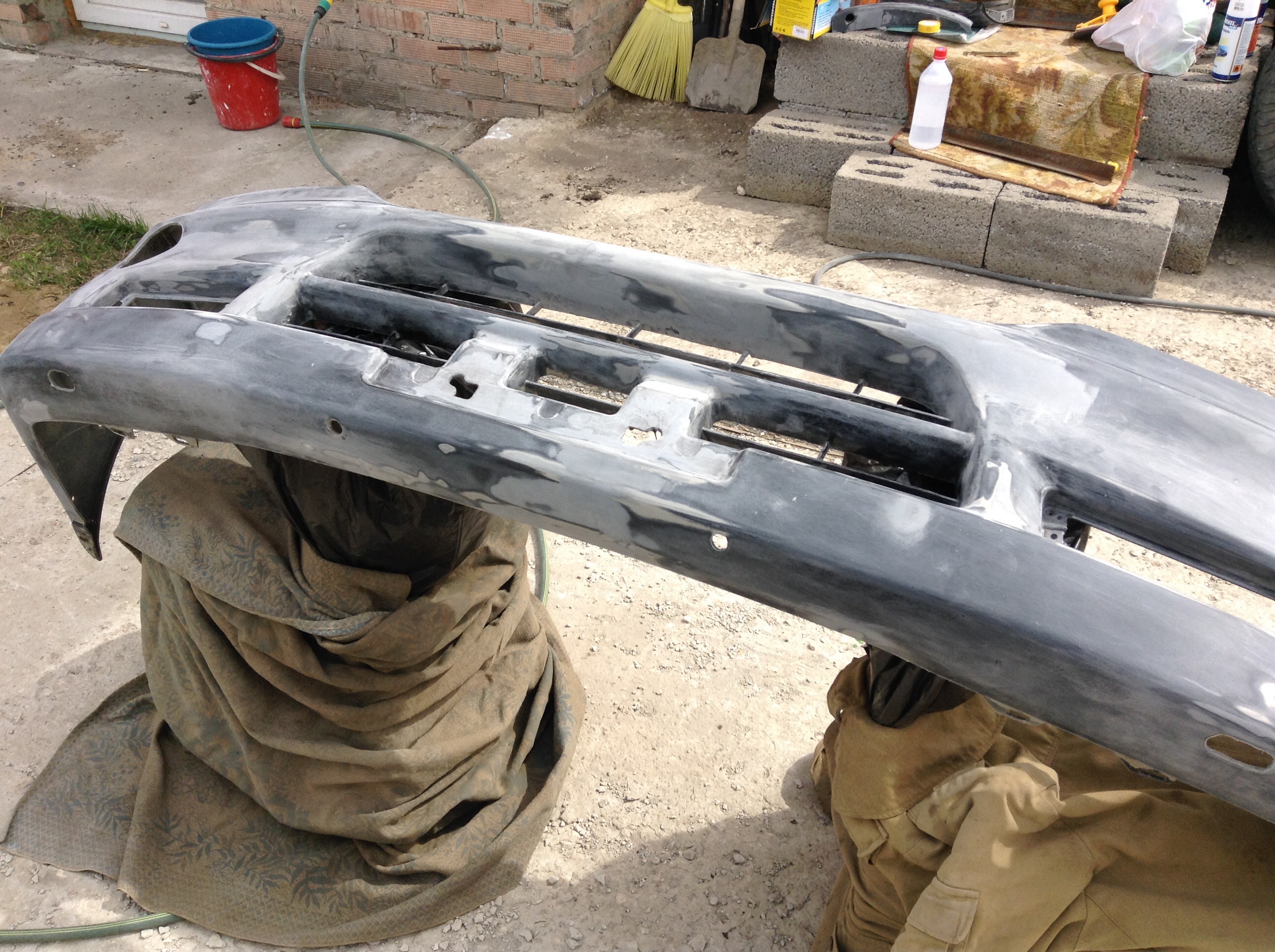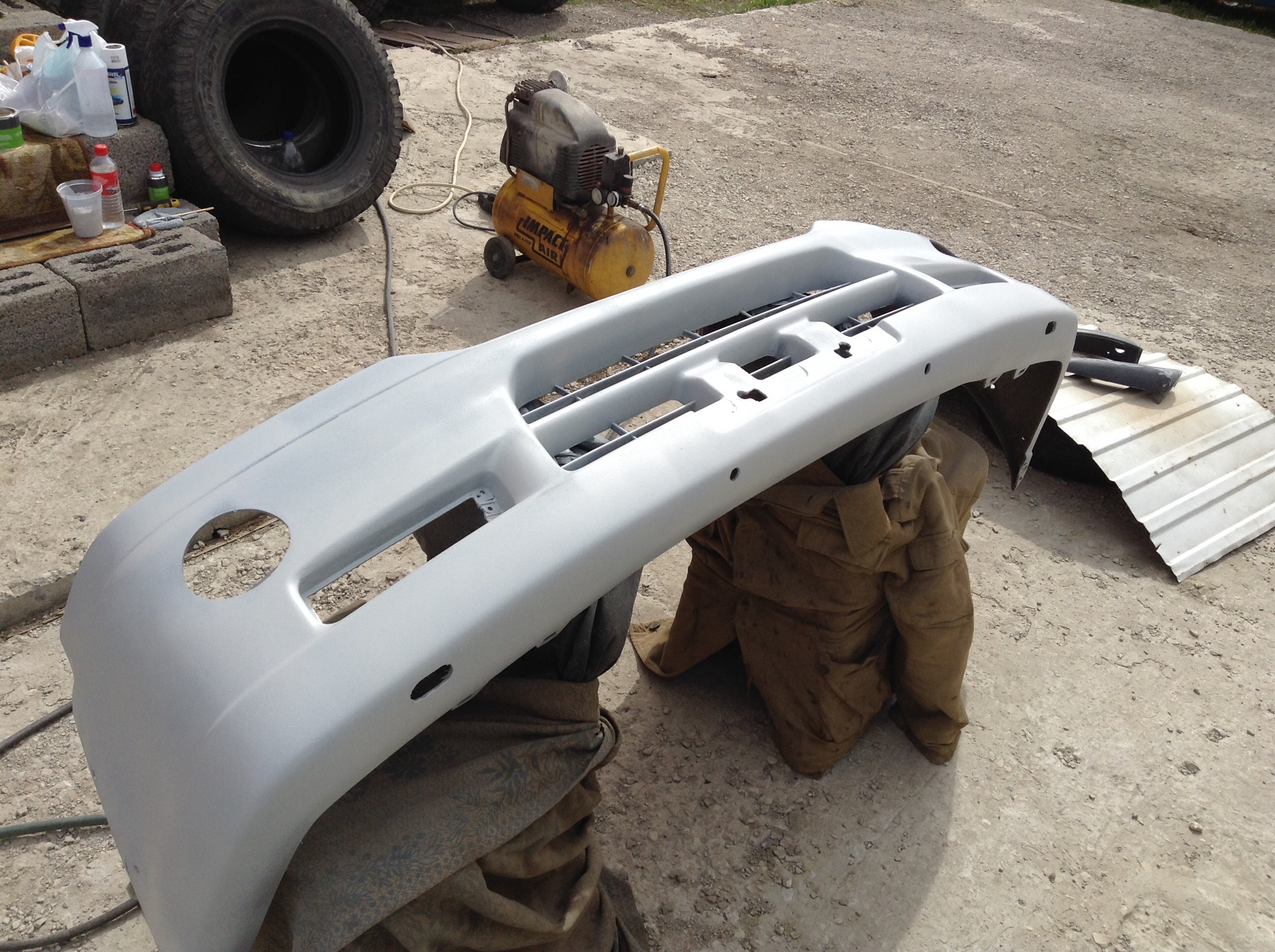 В связи с появившимся свободным временем (в отпуске, ну и праздники) сдвинулся процесс восстановления бампера и капота после наезда на столб. Бампер давно зашпаклеванный и затертвй лежал дома. Капот также зашпаклевал. Делаю все сам (от цен сервисов волосы дыбом встают). Как видят что Паджеро цена вырастает вдвое. Купил пульверизатор. HVLP хороший Китай. Дюза 1,4. У соседа отнял на время компрессор. Компрессор слабоват, но на такие объемы хватает. Пыхтит но справляется. Красить дома негде, ждал погоды. Вчера загрунтовал бампер и зашпаклеванную часть капота. Сегодя если погода позволит нанесу лак и базу.