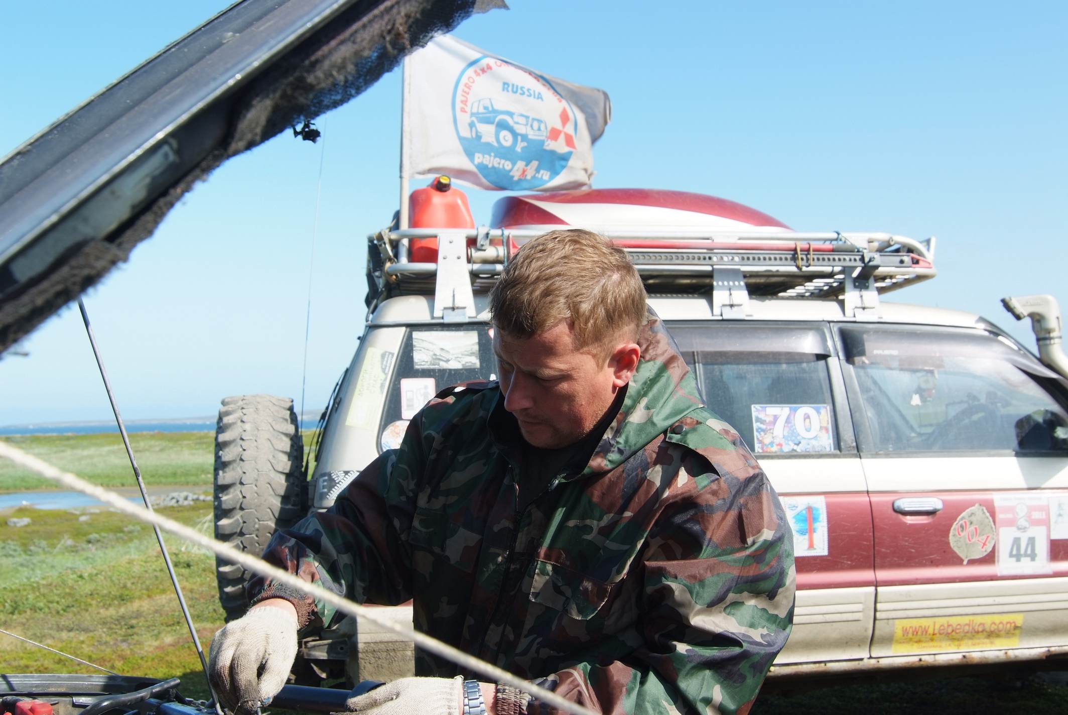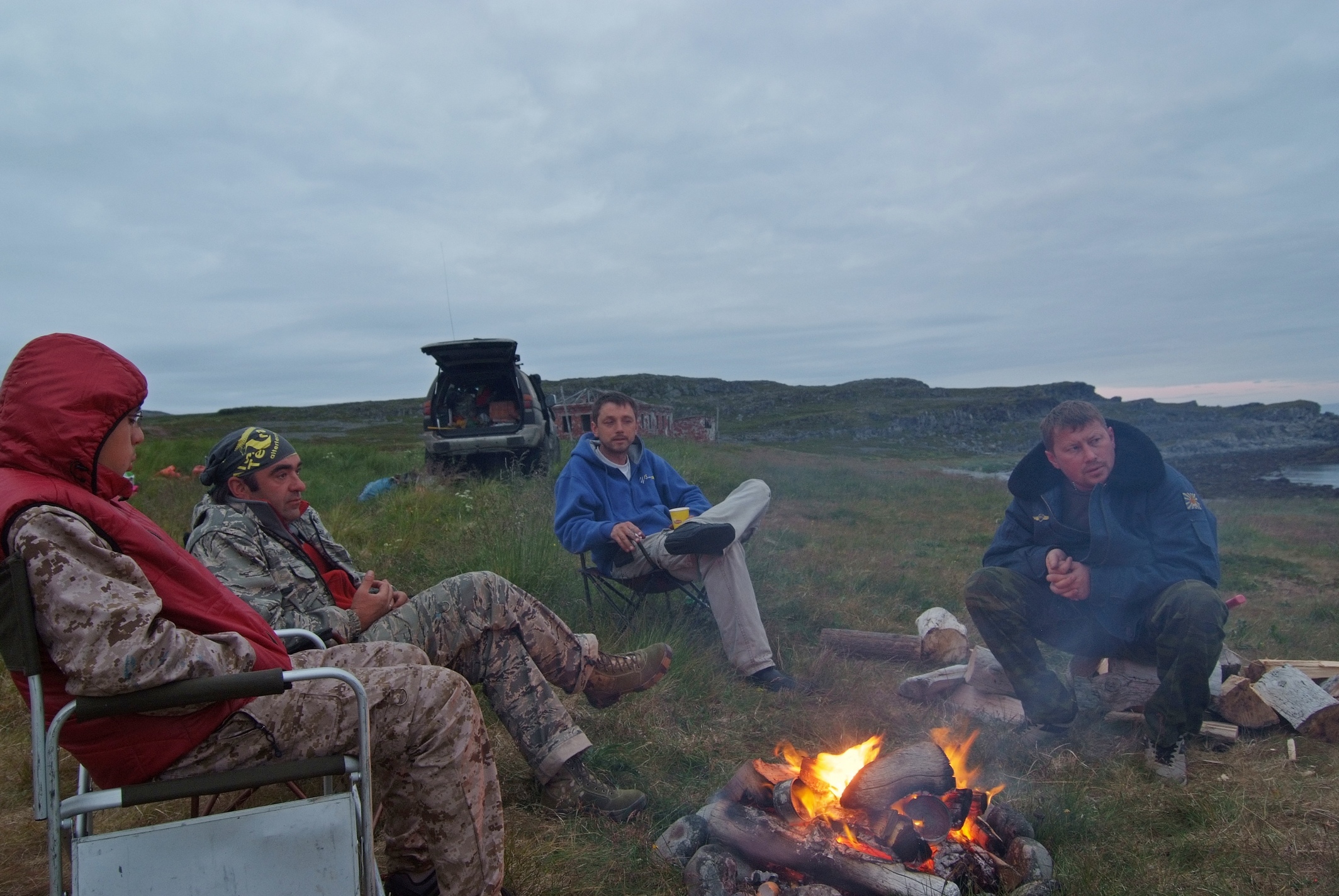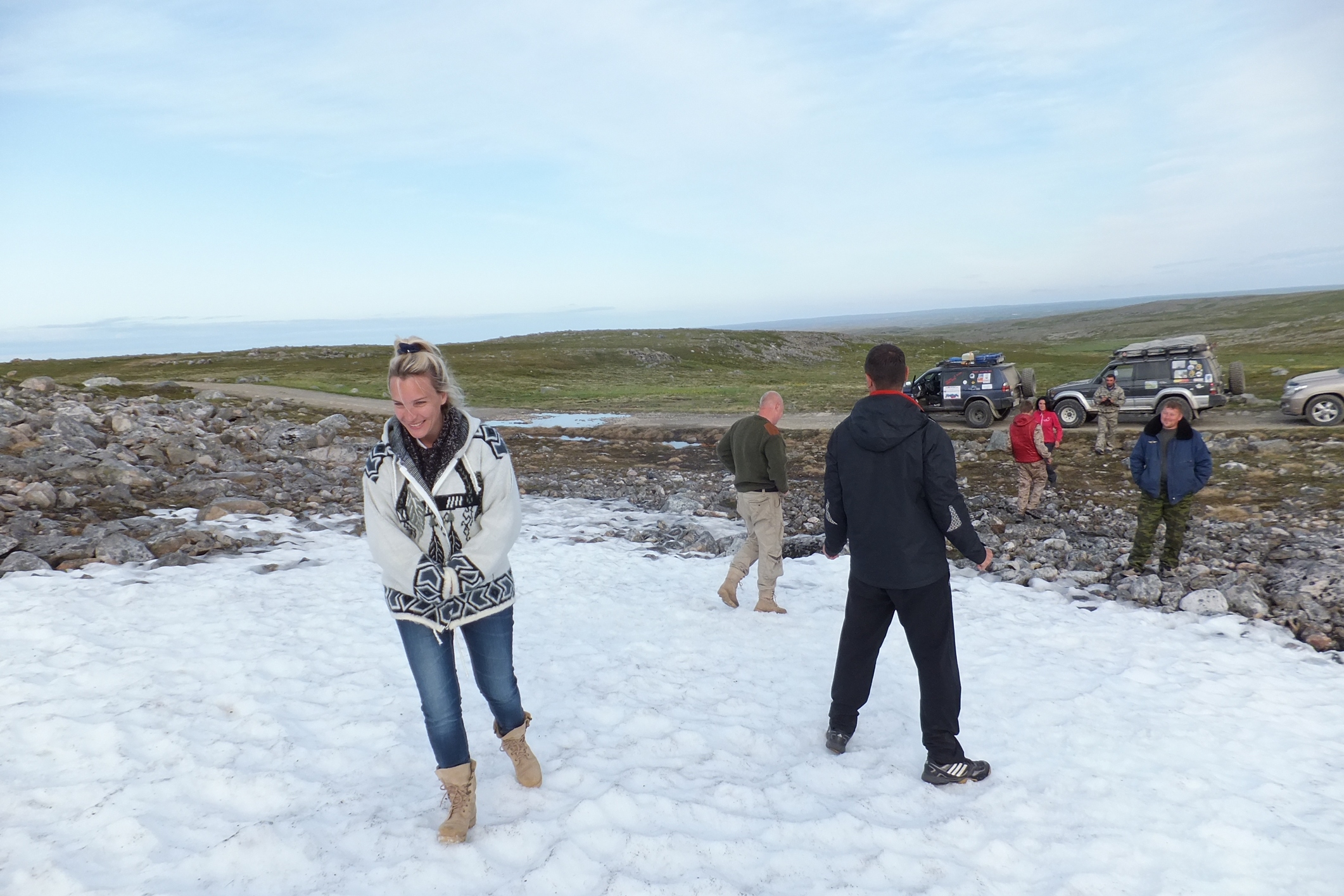 самый примечательный борт экспедиции по дороге к снегу построились.. снег, снег, снег... Место лагеря, ремонта стартера, сдувающего экраны ветра и купания в одежде .. Повар малекулярной кухни.. и страждущие ету кухню отведать Ну и как бы да, с палаткой косяк конечно, вина моя.. поставил наши "норки", свою на солнышко прям на утес, .. ну видимо осознавал заранее вину, так что б с утра выйти и сразу в реку.. а Юлькину вроде как спрятал за двушку тверских. Правда была мысль до ужина что ее неплохо было бы к Саньке привязать.. но, то ли усталость, то ли процесс припаивания щеток генератора к узлу стартера, то ли теплые вещи.. щас не скажу что именно, но палатку привязать я забыл. ...