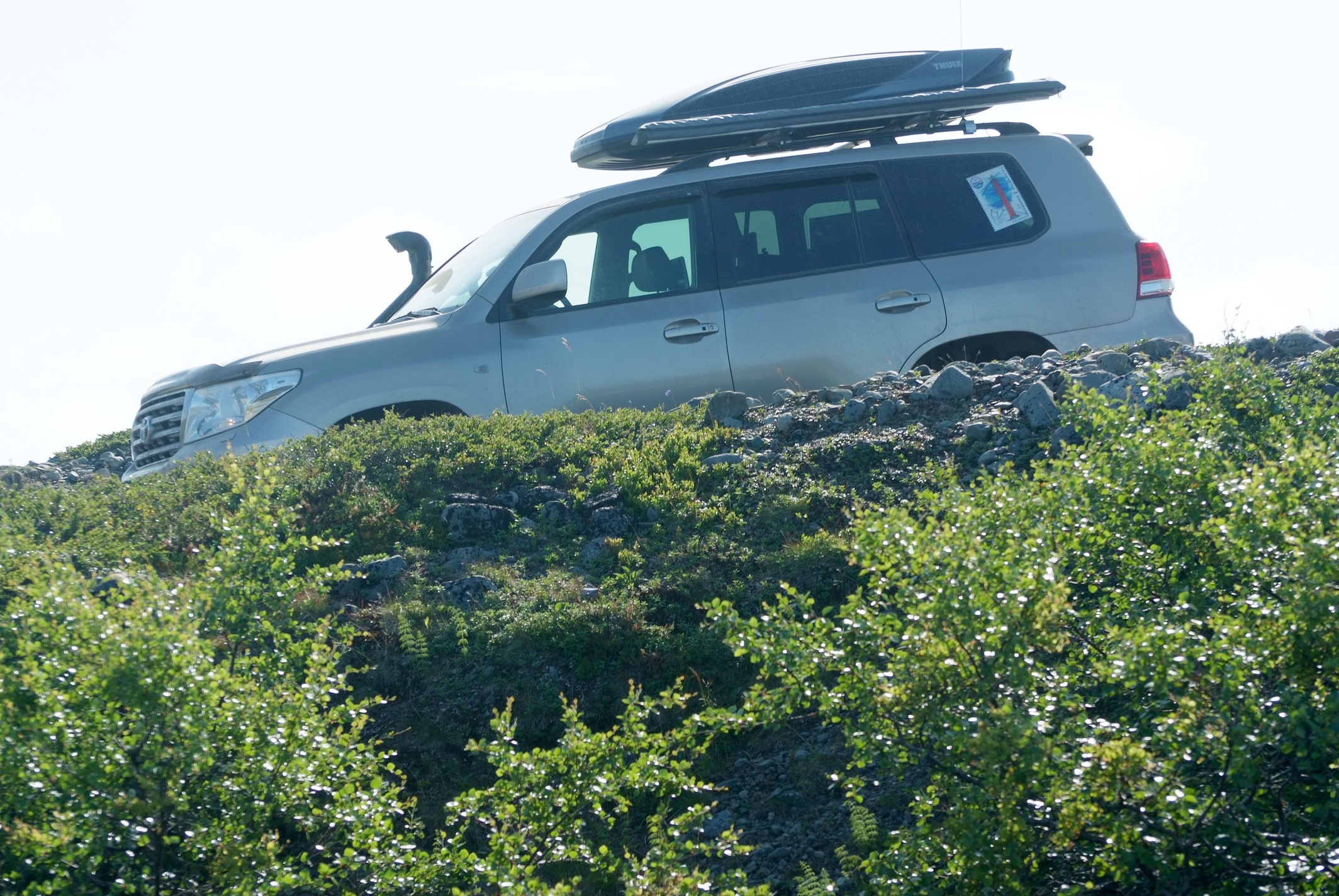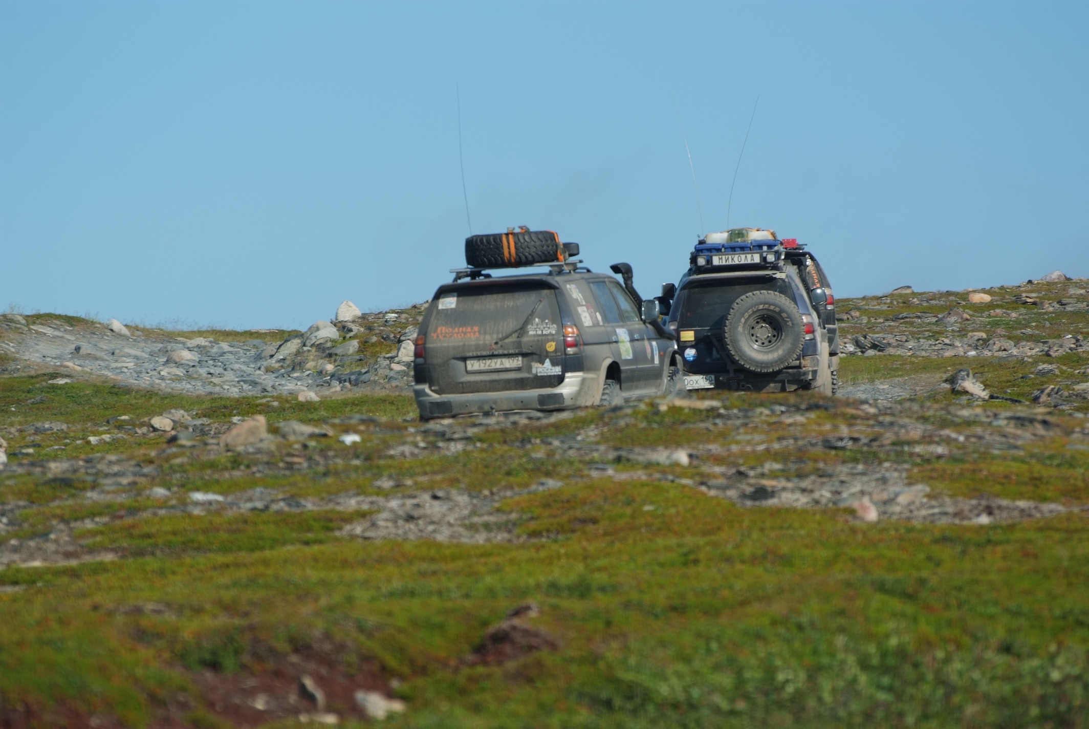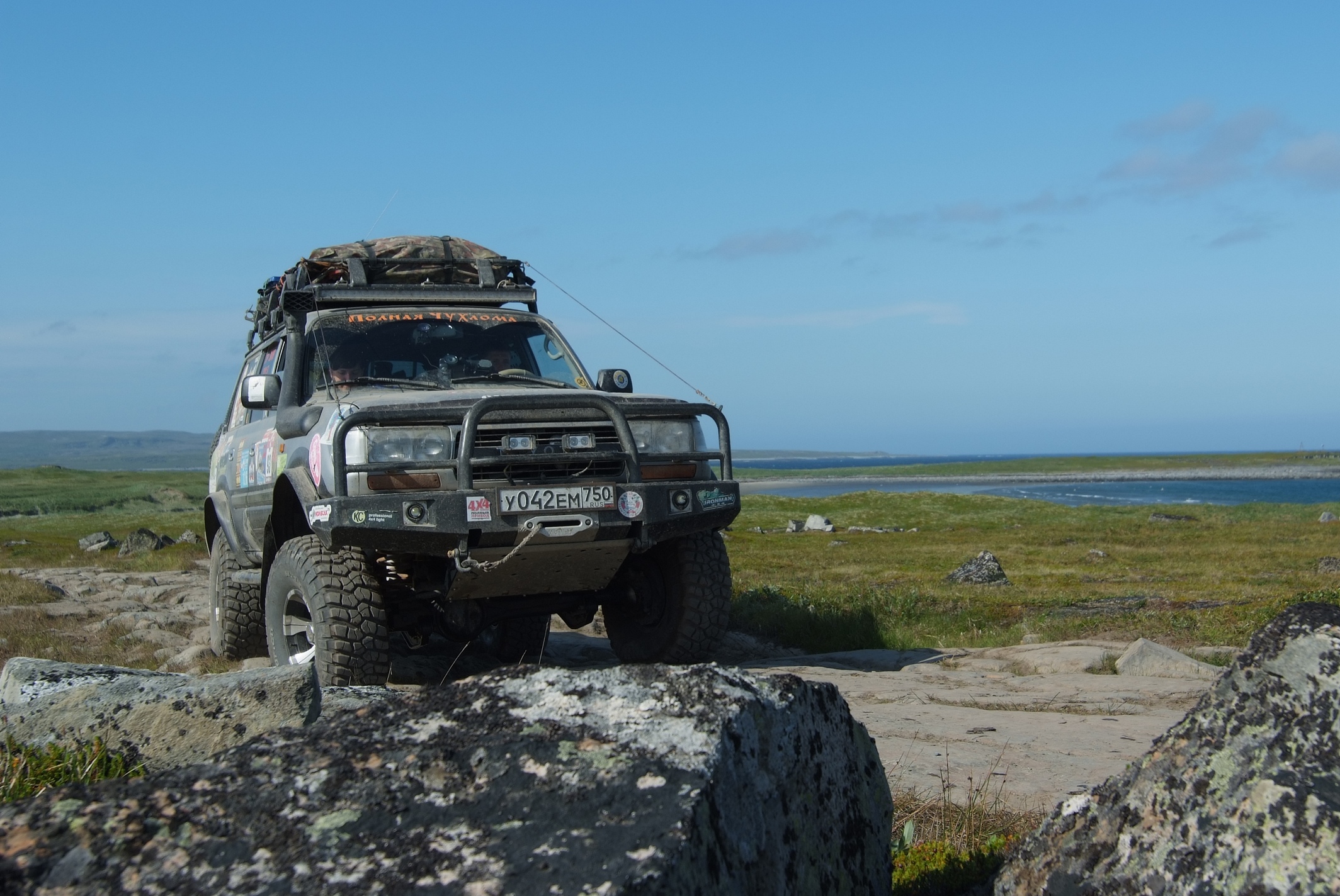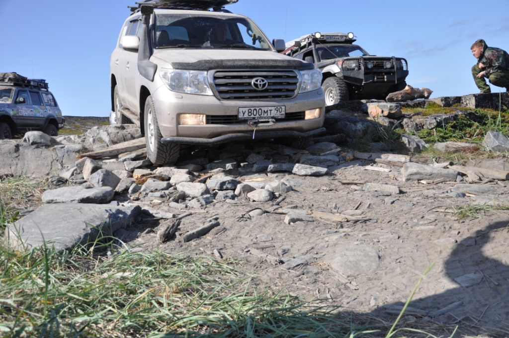 Главное отличие восточного берега в том, что тут почти не наблюдается следов деятельности человеков, ни военных, ни турыстов. Единственное, иногда к дороге подходит старая ЛЭП, часть ее столбов, укрепленных камнями до сих пор стоят, не спаленные турыстами. Дорога хоть и не накатана, но почти всегда просматриваетца, в большинстве своем каменистая, но частенько опускается в долины речушек и ручьев, где встречаются болотинки. нам с погодой повезло, было сухо, лебедились пару раз.