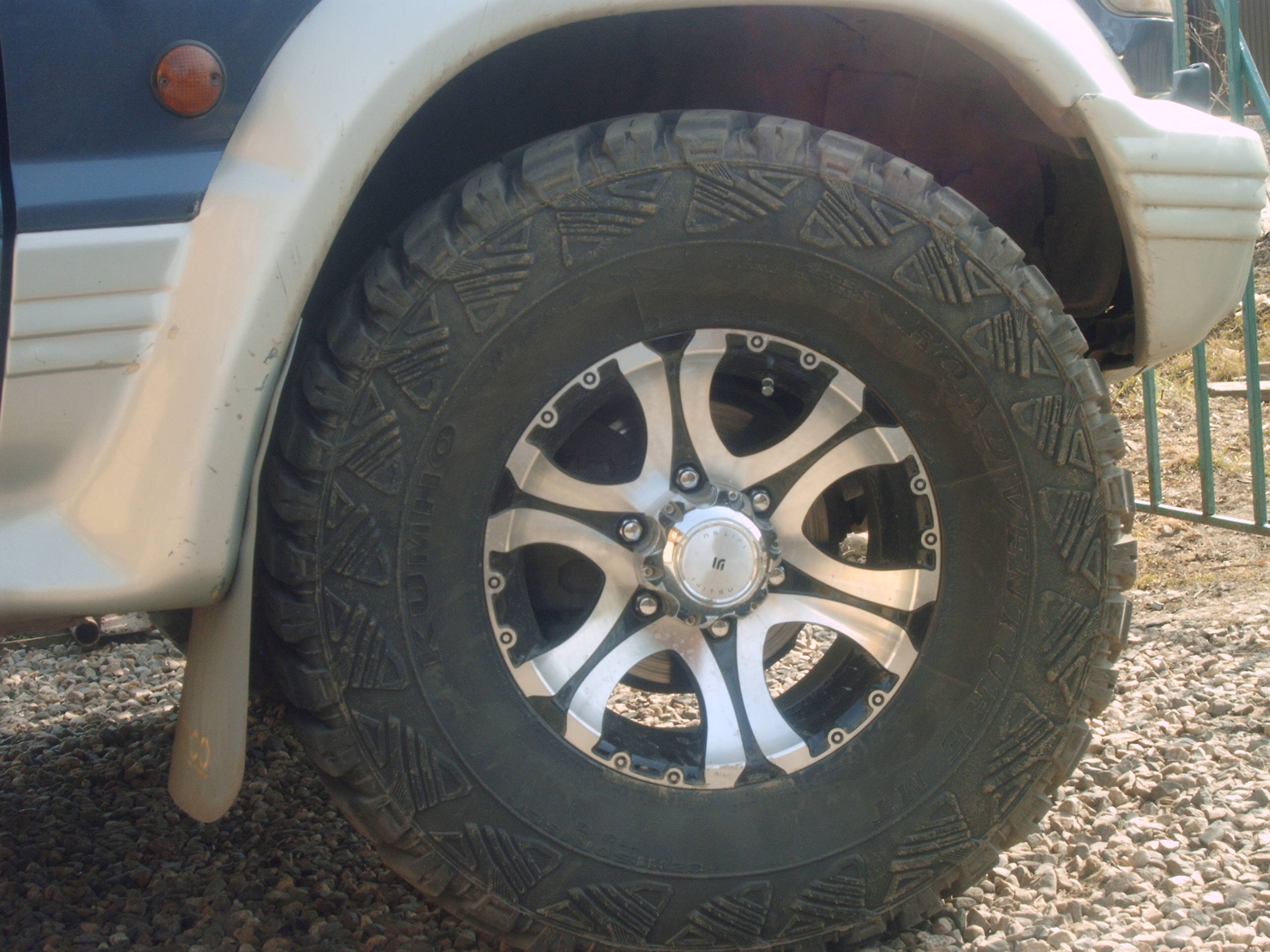 Вот пара фоток: резина 32х11,5 диски R15 ЕТ5. Подвеска штатная,бодика нет, торсионы не накручены.