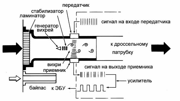 Вихревой датчик расхода воздуха, использует метод подсчета вихрей Кармана, которые образуются в ламинарном воздушном потоке, на пути которого встречается препятствие с острыми кромками. Воздушные вихри срываются с этих кромок с частотой, линейно зависящей от скорости потока. (Поэтому при работе данного двигателя на холостом ходу, то есть при небольшом устойчивом потоке все было более-менее пристойно)