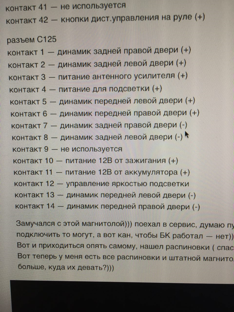 Тем не менее, все таки хочется оставить штатный монитор и его управление. План такой - на место сидюшника поставить магнитолу которая будет подключена параллельно штатной магнитоле, а CD, в случае если при его отключении перестанет работать монитор, будет спрятан под торпедой. Штатный мафон пока не снимал, какие в нем разъемы еще не знаю, но просмотрев кучу информации скорее всего разъем у меня С-125, распиновку к нему нашел, только не могу понять куда цеплять минус - если кто знает подскажите!!!