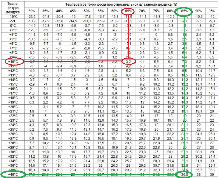 Далее, как выше было правильно замечено, есть понятие "точка росы"( конденсации). Заглянем в таблицу. На практическом примере объясню, как она работает. Любой, кому довелось побывать в тропиках, наверняка замечал, что там постоянно сырой, якобы из-за излишней потливости. Предположим мы попали в страну (Южный Вьетнам, Сингапур и т.д.) с дневной температурой воздуха 40гр и относительной влажностью 85% (отмечено зелёным). Точка росы в этом случае +/- 36гр...т.е. температура нашего тела, которое работает как конденсатор влаги из окружающего воздуха! Именно поэтому, создаётся ложное представление об излишней потливости!