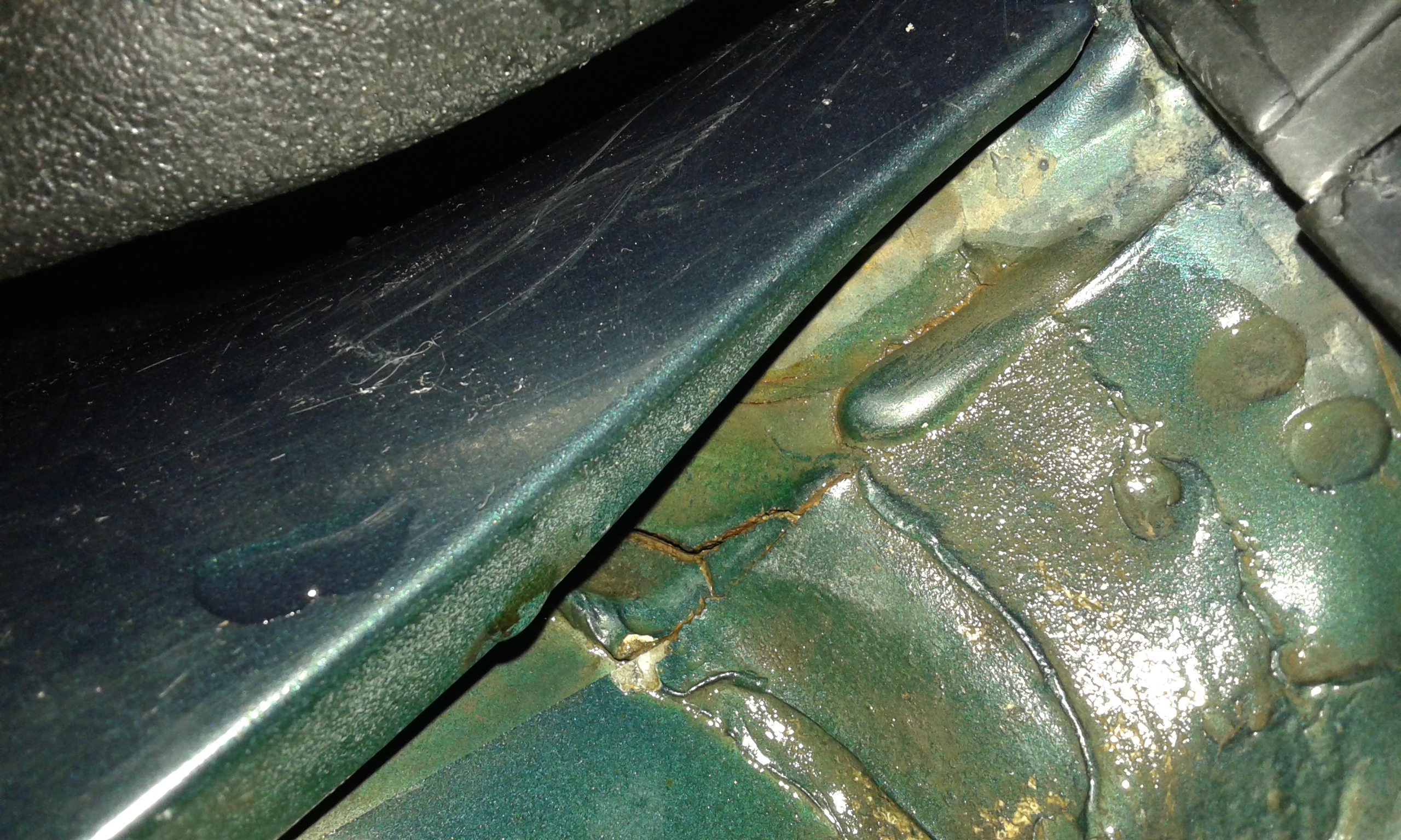 У меня этой трещины тоже не видно было. Вода стекала под крыло в районе передней стойки и текла снаружи кузова, но под крылом. Не знаю как объяснить понятнее. И даже когда снял крыло, мне казалось что там вода попадать не может. Проварил на всякий случай, но именно после этого перестал мокнуть палас