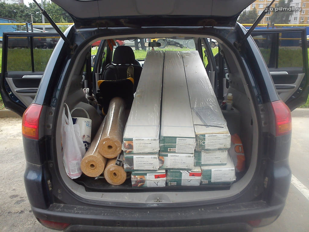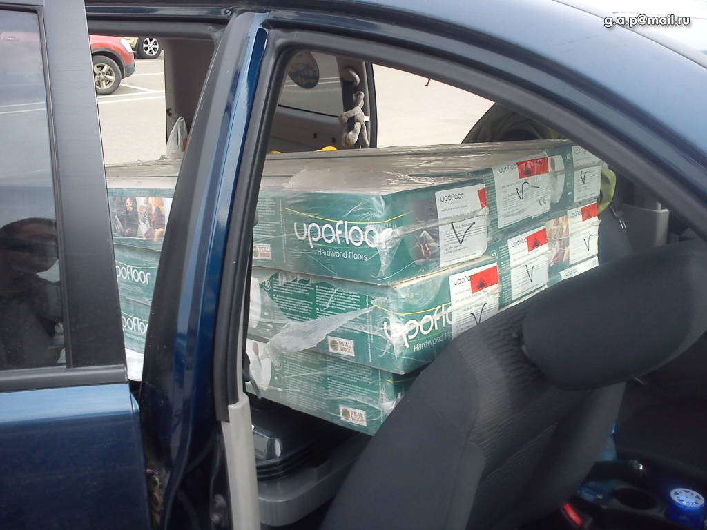 30 м2 паркетной доски - 9 пачек(2266х188 по 26 кг каждая пачка). Переднее сиденье пришлось немного сложить... Это к моему посту почему мне не нравиться что оно не складывается полностью(спинкой с сидушке) - это же банально удобно, и не только как столик