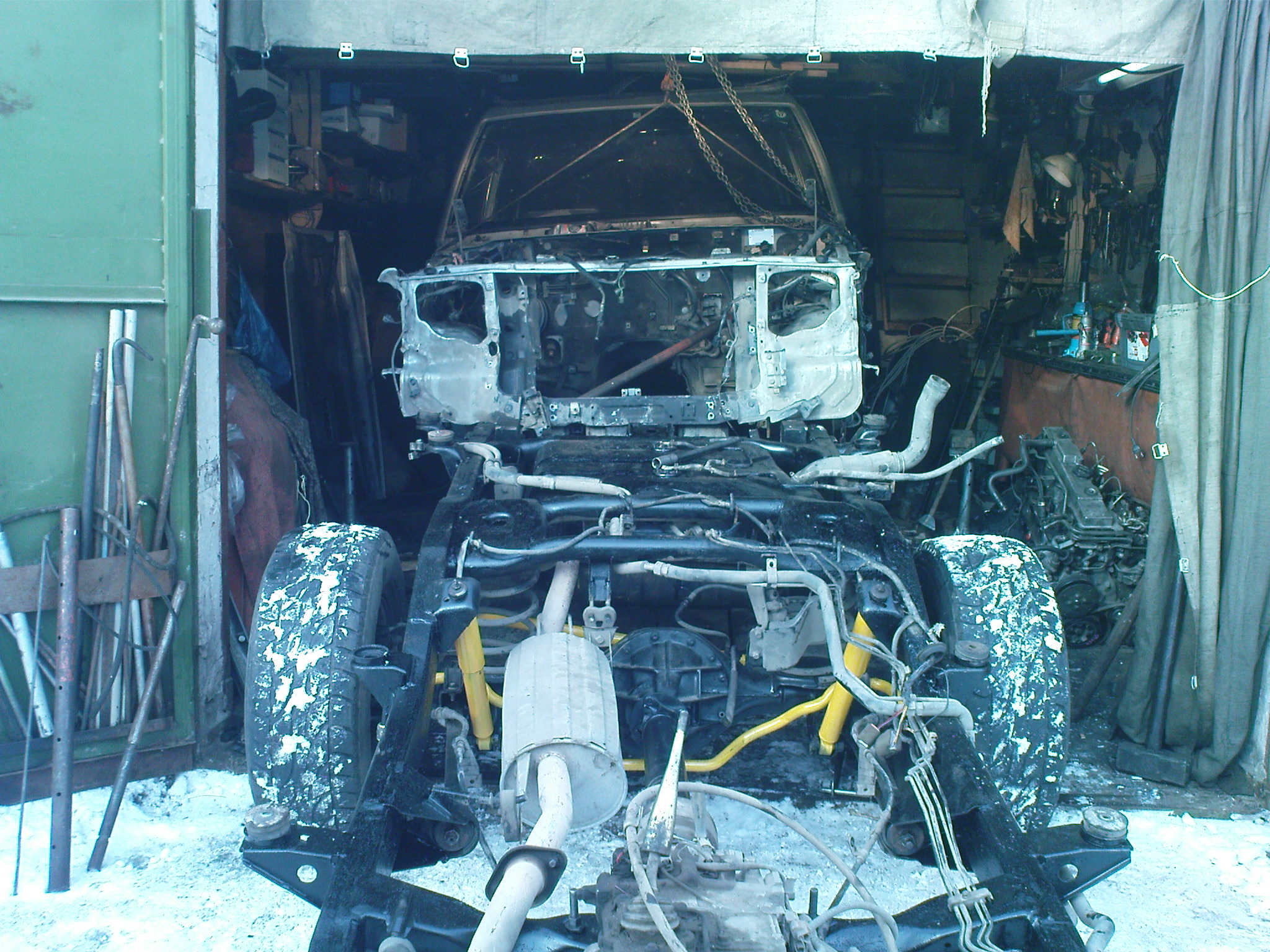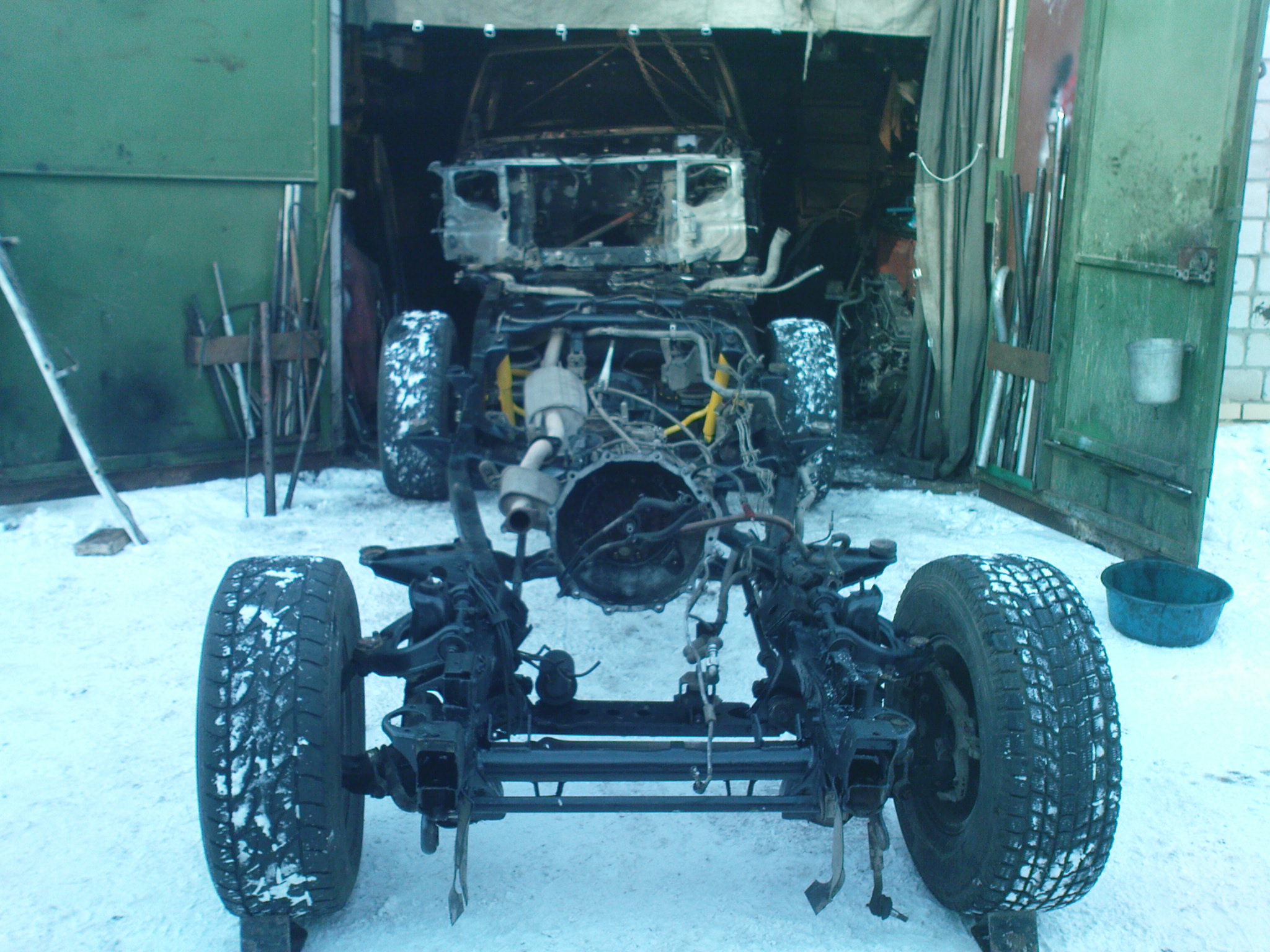 это только попробовали как идет, ща надо вкатить раму, прикрутить опоры до середины 8 штук, затем выставить все проемы дверей, проемы задн. окон, поставить стойки на место, причем как оказалось все 8, задн. стойки надо назад и наружу, средние наружу и вперед, переднюю левую вперед, правую переднюю вниз и вперед, поправить крышу не много, проколотить пол под педалями, раздвинуть туннель на 1,5 см, и после выправлять морду, закинуть движку, разварить все стойки по периметру, по диагоналям, по внутрянке, и потом менять крышу.