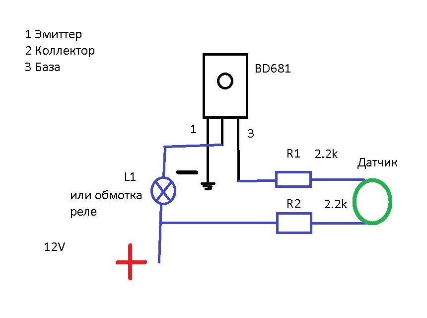 Принцип понятен, сопротивление ограничивает ток, при замыкании контактов ток попадает на базу транзистора (ему хватает несколько десятков сотен миллиампер) на коллекторе транзистора появляется минус, реле или лампа срабатывает.) А почему светодиод будет гореть постоянно? Предположить, что ток утечки транзистора равен или больше порогу зажигания светодиода, или светодиод может был 3 вольтовый? Это контакты надо выводить как можно ближе к нижней части колбы, у меня кстати обогрев так же подключен, через отверстия в колбе. За схемку спасибоSNOOPER писал(а):Да легко.kompail писал(а):Можно мне подкинуть, про датчик как то не задумывался...SNOOPER писал(а):ПС Если с жабой всё же договоришся, схему датчика воды подкину, чтоб не покупать за 3200
