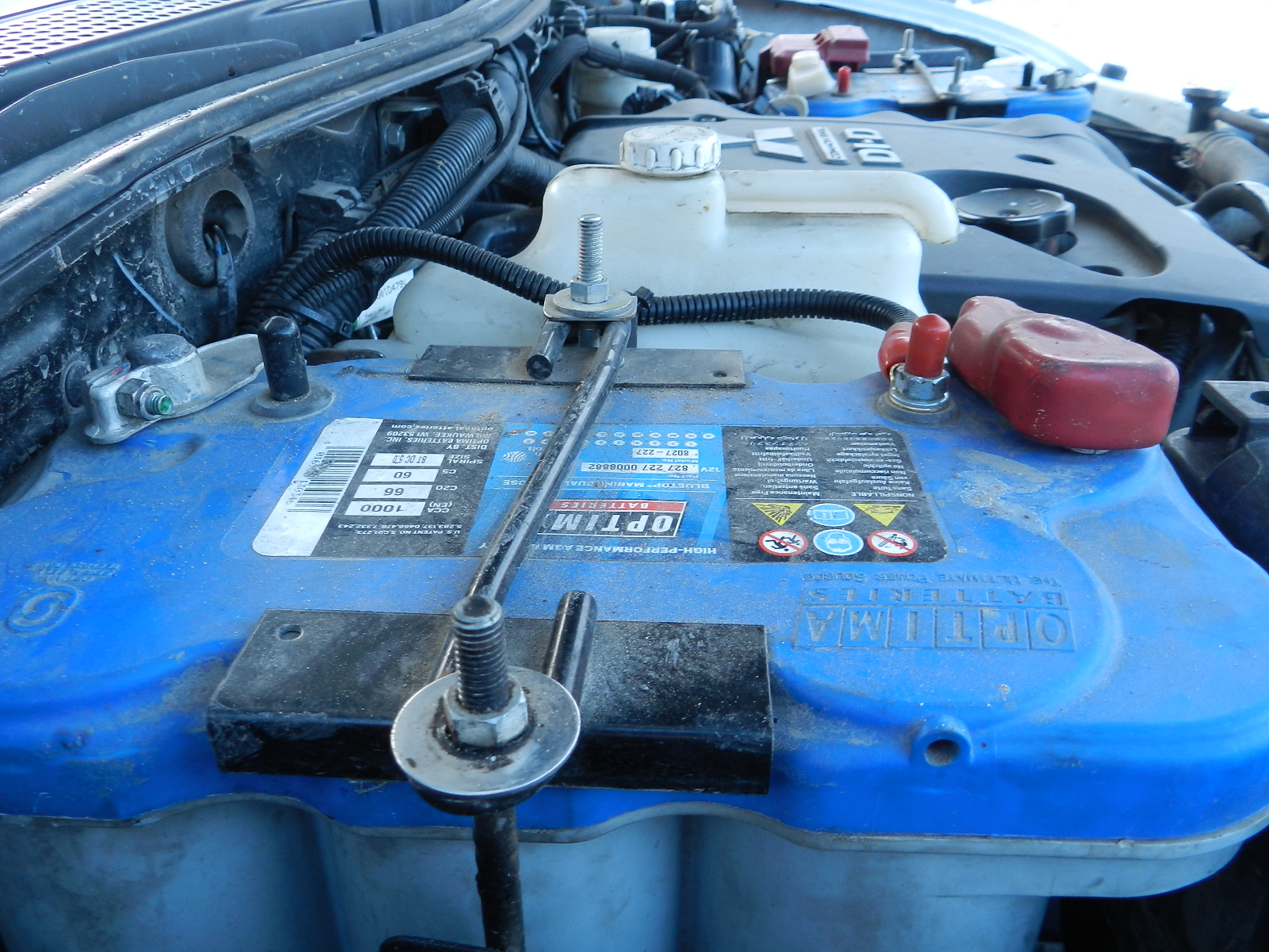 Аккумуляторы 66 Ач Optima Bluetop (ВTDC- 5,0) п/п синий. Остались в наследство от двойки. Хотел продать, полярность разная на двойке и ньюхе. Брать по нормальной цене не захотели, да и я не захотел дарить хорошие вещи. Итог: Прямая полярность в место обратной. Правый просто так не встанет надо корыто подпилить. Левому надо шину наростить. Длины родных проводов хватает.