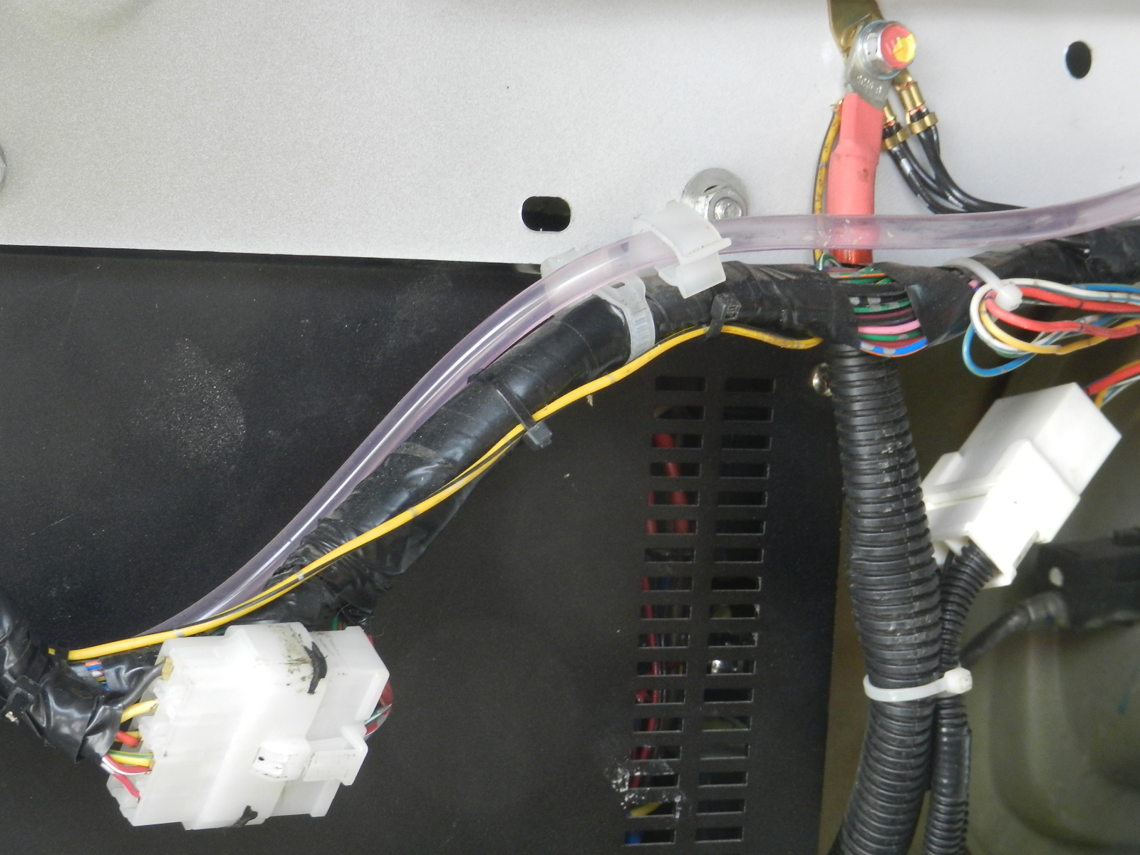 На старике несколько раз протягивал провода от моторного отсека в салон, не очень приятное занятие. Здесь сделал все сразу (управление лебедкой, сигнал, подогревы топлива и.т.д.) и силовой провод на инвертор и компрессор. Уплотнительную резинку просверлил восьмеркой, что бы провода залезли обработал WDшкой.
