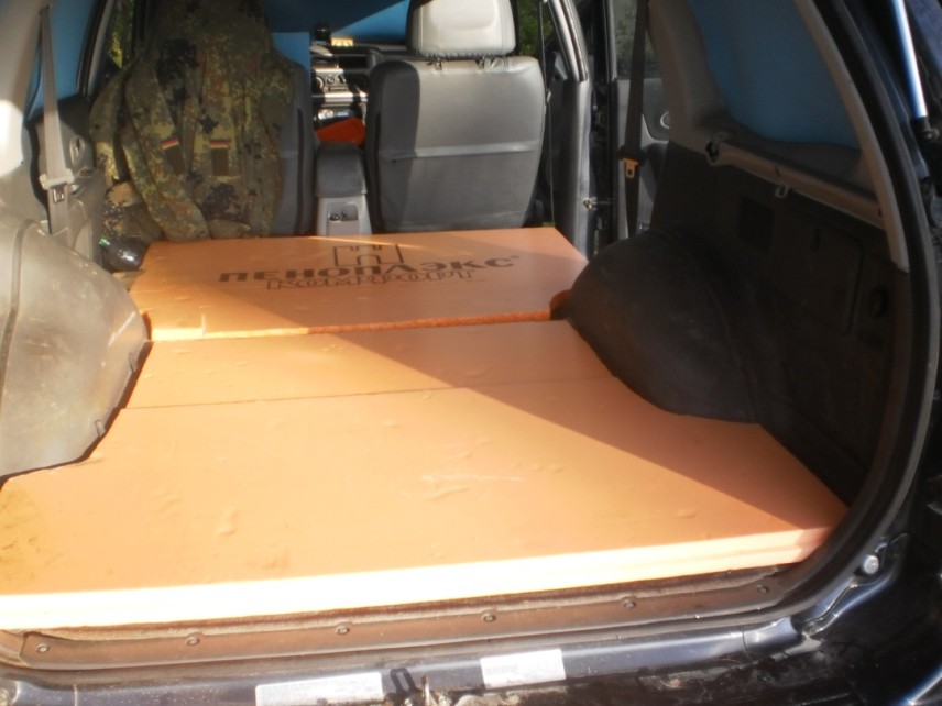 по рецепту уважаемого форумчанина ака Подземщик. Для принятия горизонтального положения, задние седухи были заблаговременно удалены как класс (на время осенне-зимних рыбалок), а три порезанных листа пеноплэкса скрыли ребро, чтобы сон двух рыбаков за 180 см был более-менее комфортным