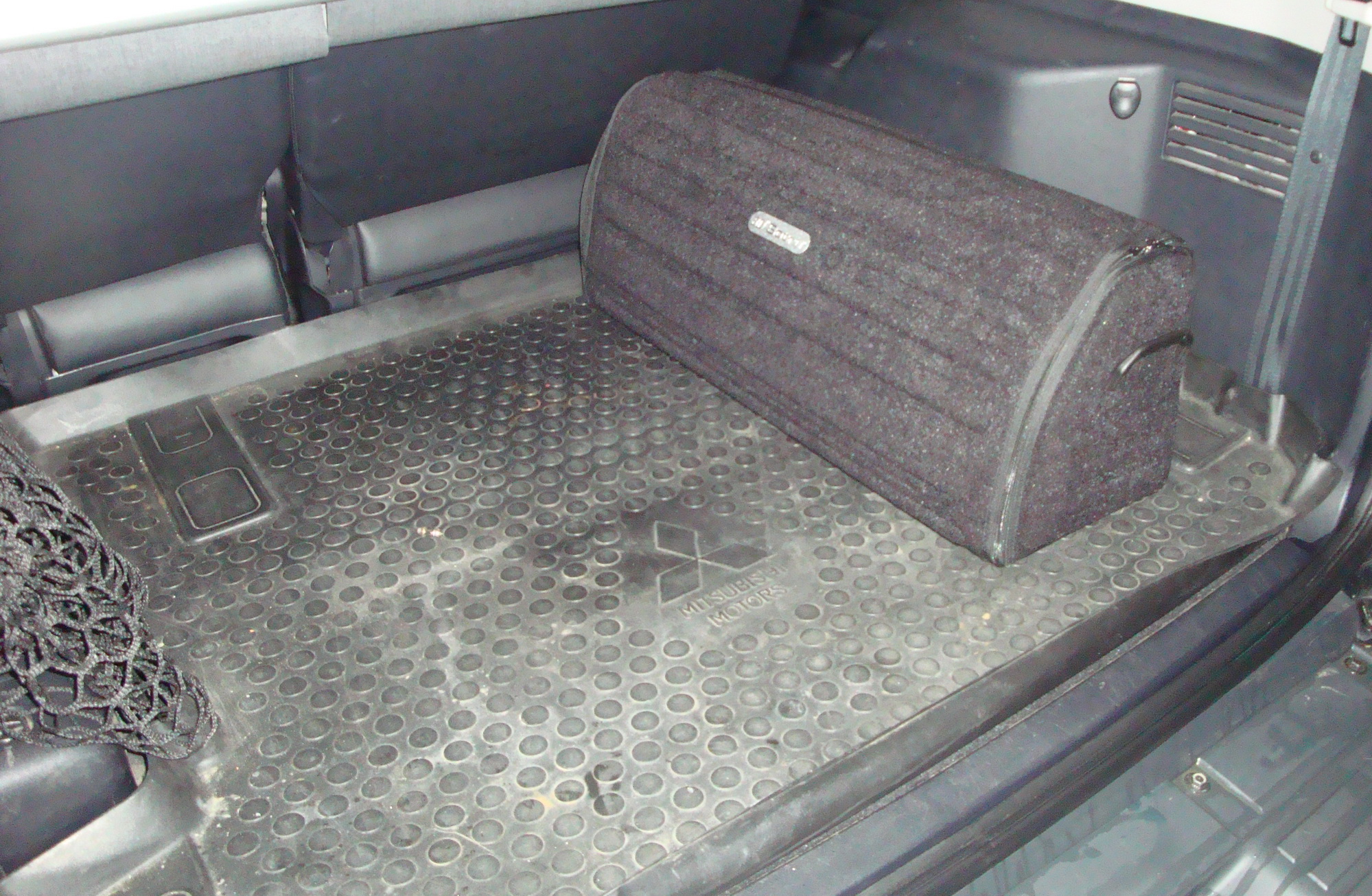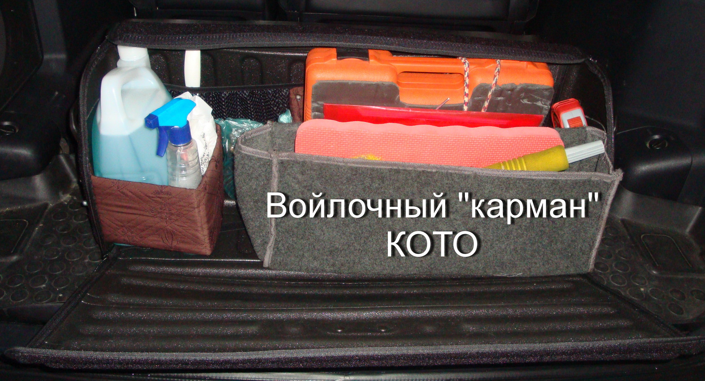 К бортам органайзера «переборки» крепил болтами М6 с декоративными (закрытыми) гайками ч/з шайбы, по длине отрезал-чтоб не торчали.Заполнен органайзер практически свободно, при необходимости допихать можно еще много чего.В багажнике теперь все радикально-черного цвета,