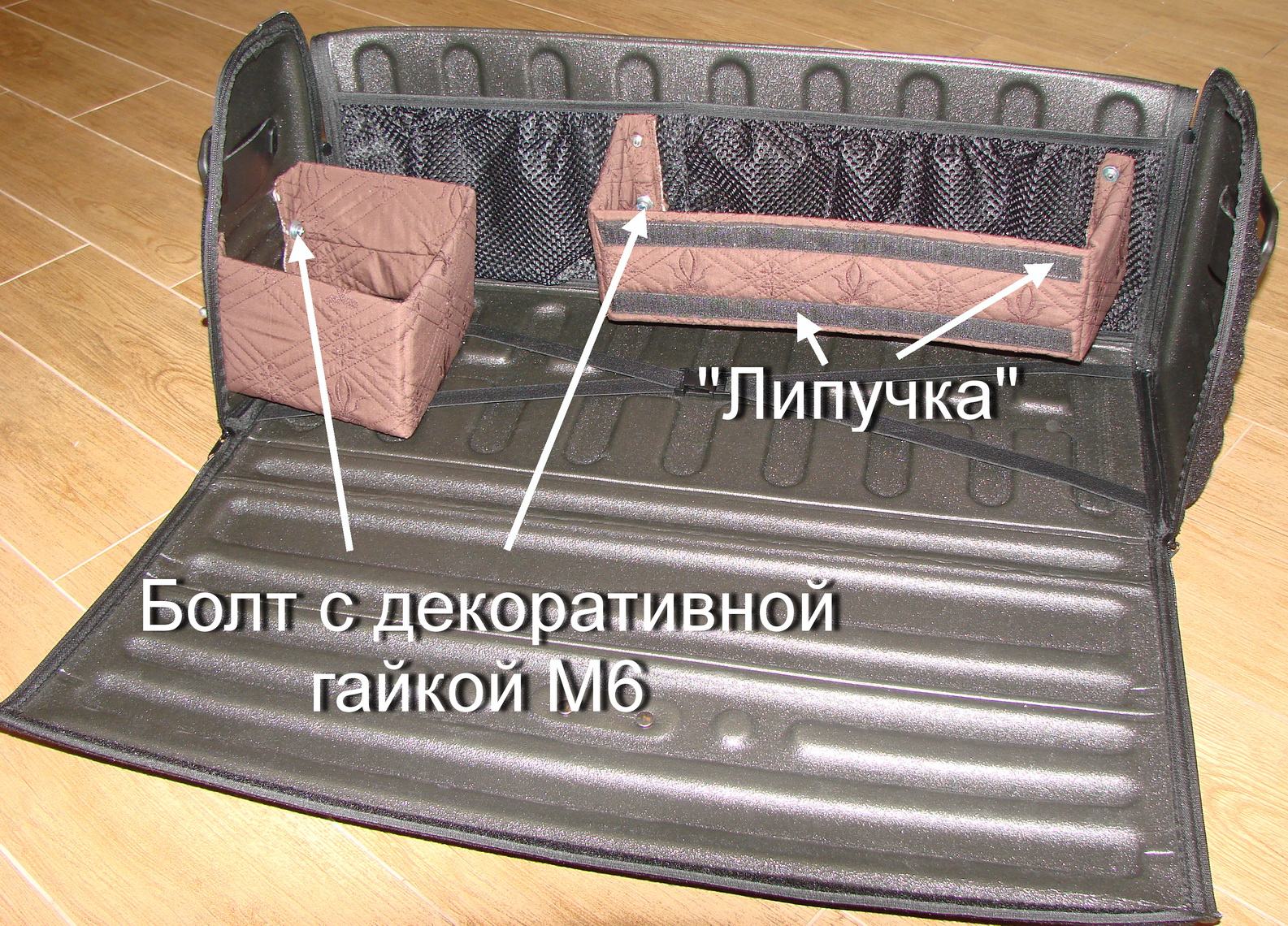 К бортам органайзера «переборки» крепил болтами М6 с декоративными (закрытыми) гайками ч/з шайбы, по длине отрезал-чтоб не торчали.