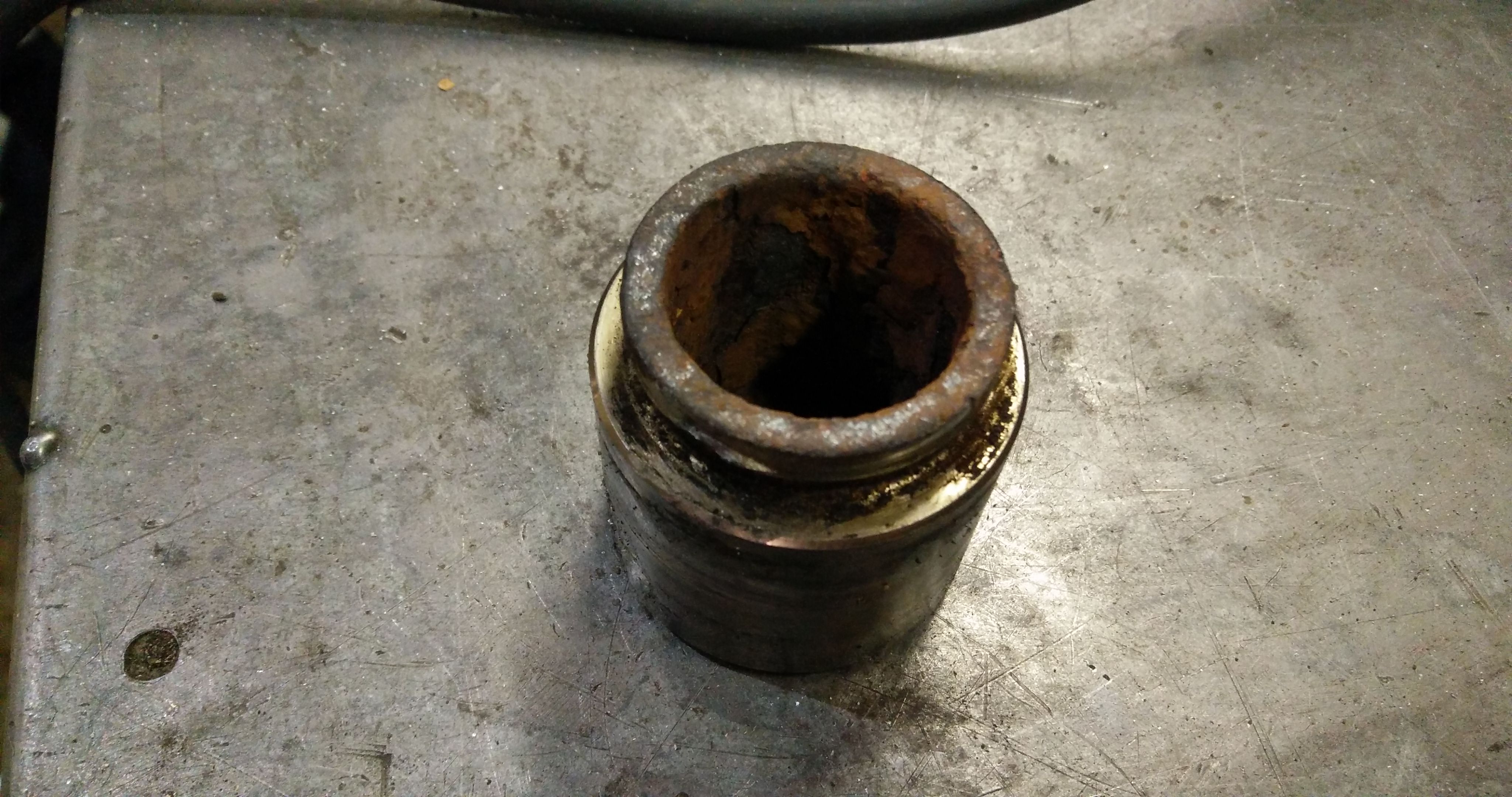 А мне кажется что это клинивший механизм, так как супорт был закисший все шло на излом, и суды по тому что пластинка изогнута под размер выемки это случилось давно, а хозяин только заметил.