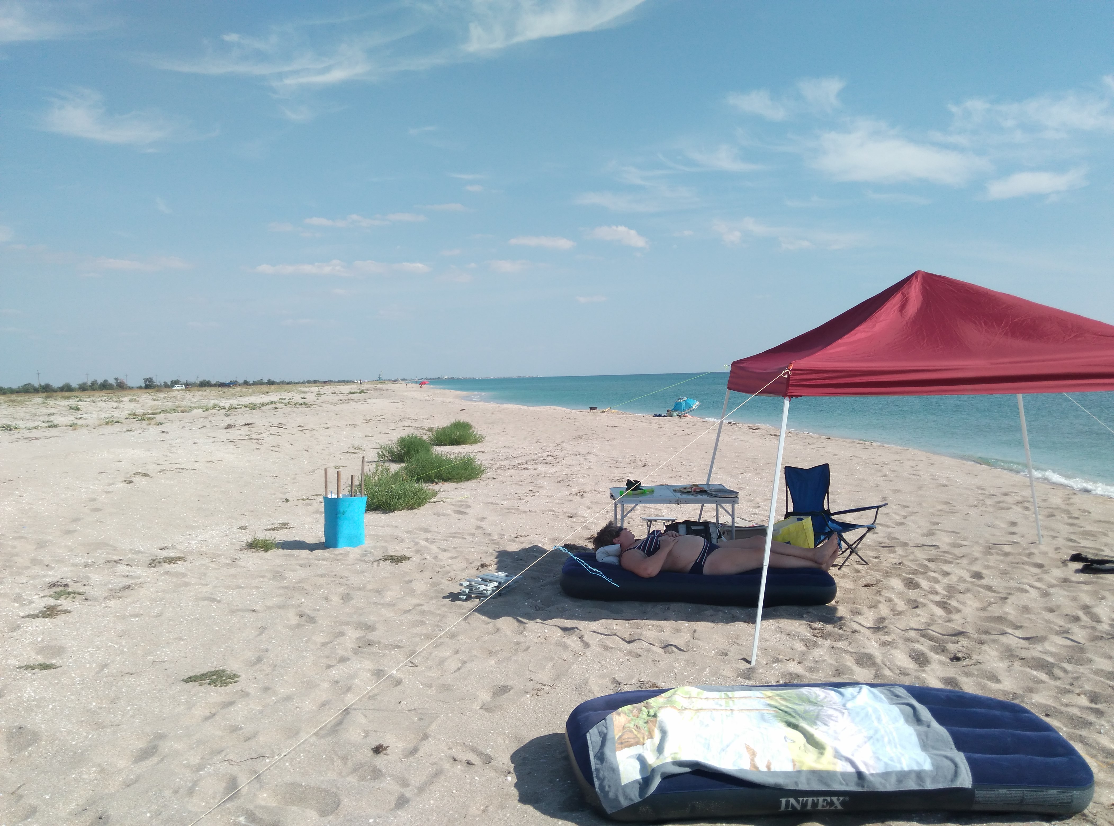 Сегодня суббота разгар дня. На Беляусе людно. Два матраса и бордовый тент наши, а дальше местные на выходной понаехали.