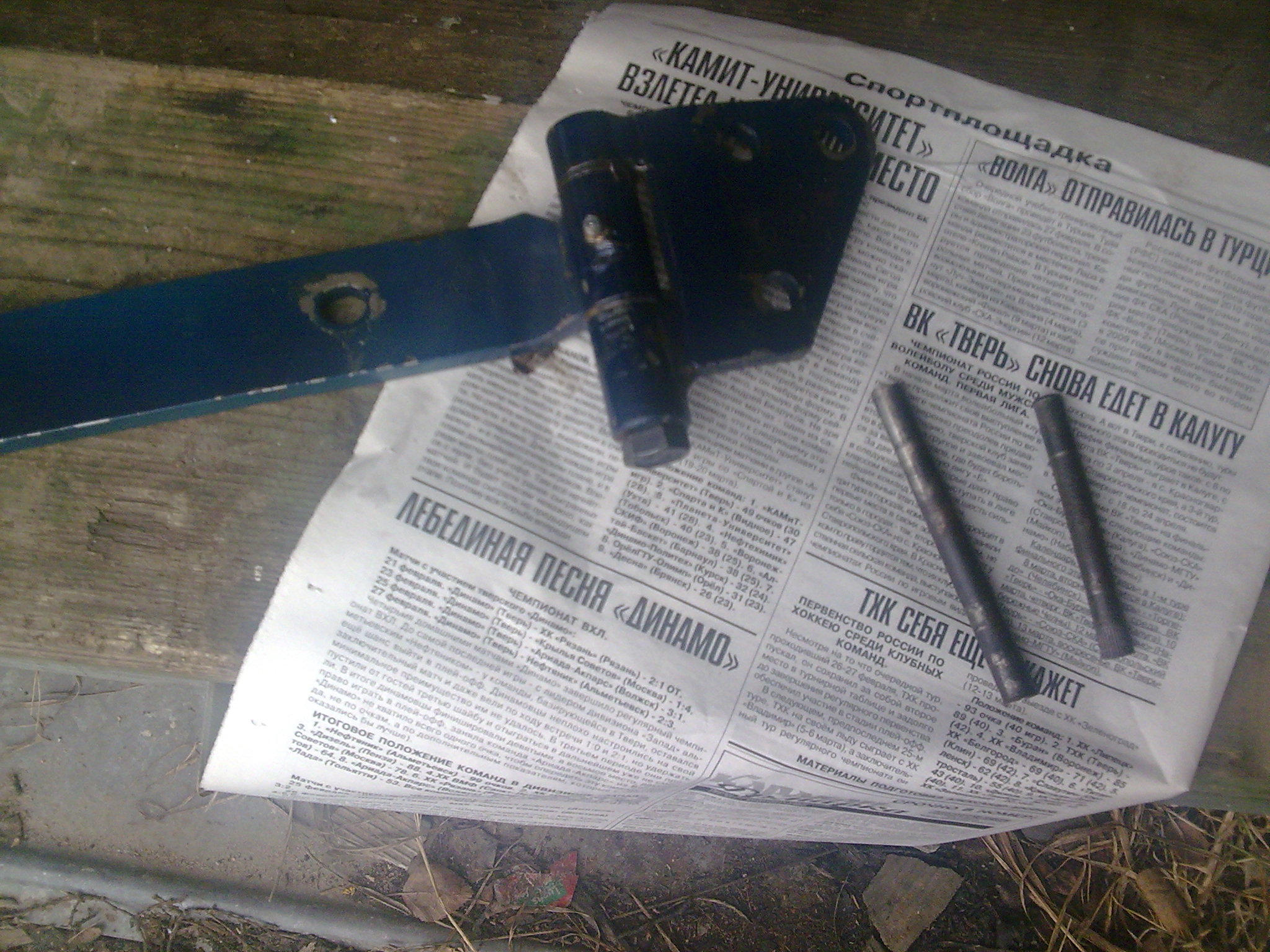 старую верхнюю петлю, цвет тёмно-синий. Требует реанимации. Необходимо выбить изношенный штифт, рассверлить под больший диаметр и вставить новый штифт.