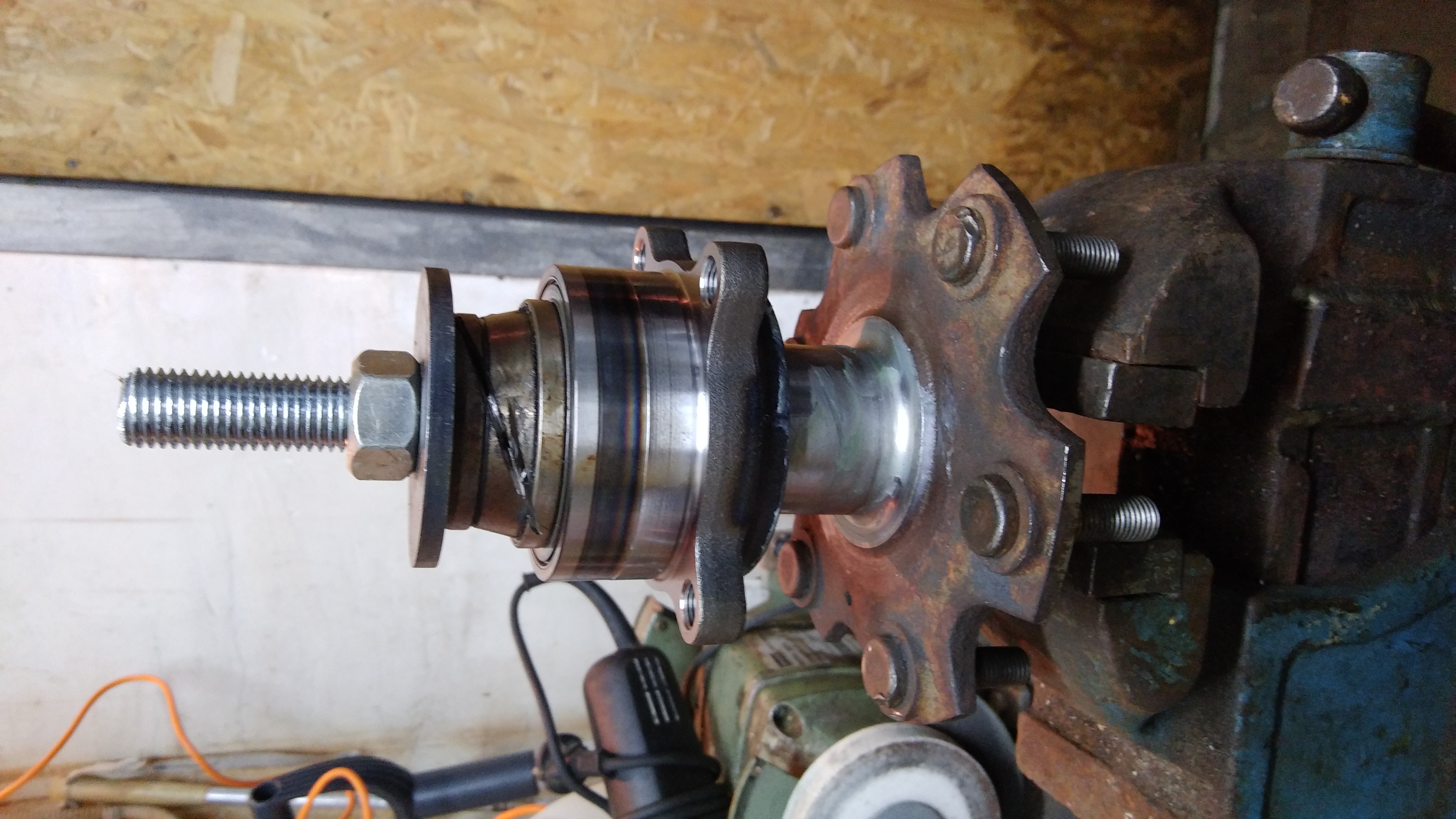 6. выбил шпильку крепления колеса и в отверстие закрепил "обратный молоток в 5-ть кило" ... поворачивая ступицу аккуратно выбил сиим приспособлением собственно ступицу из кулака .