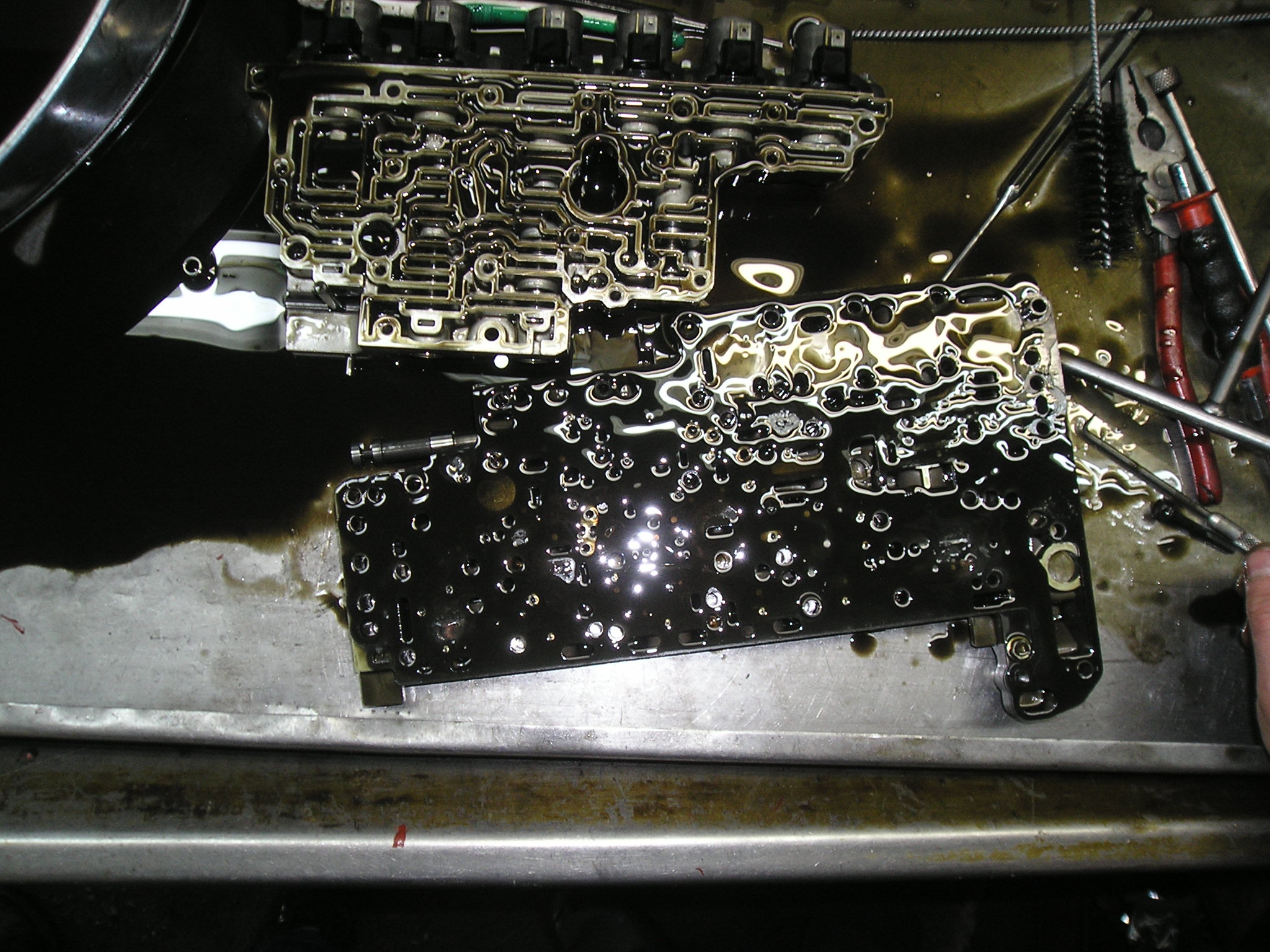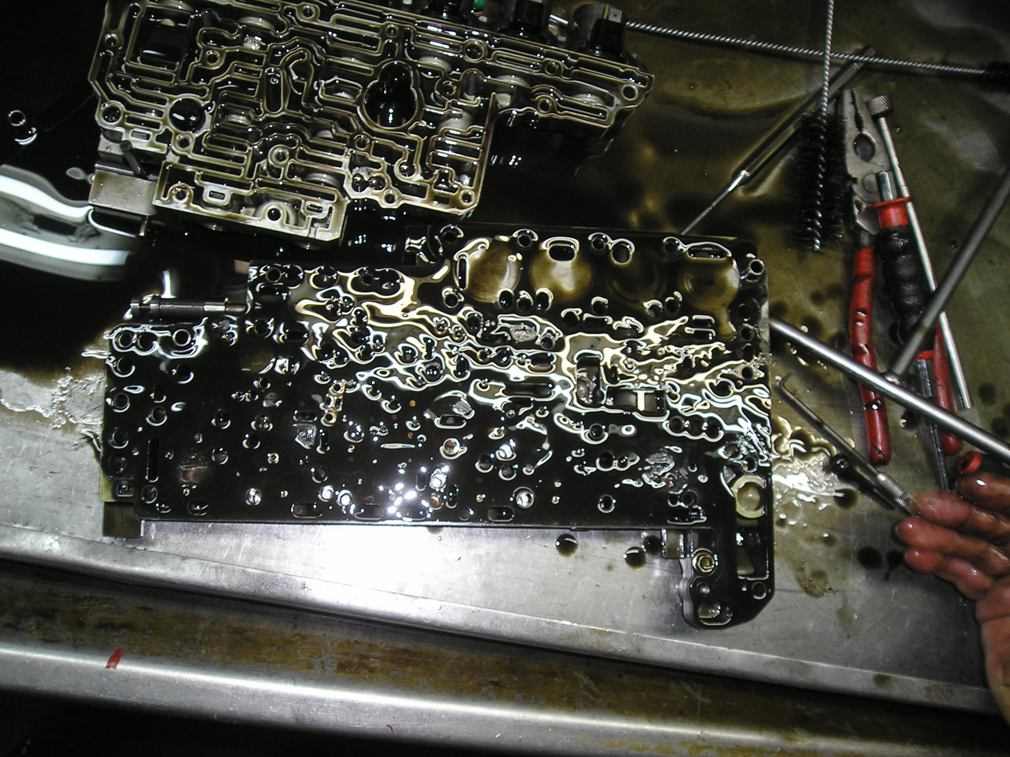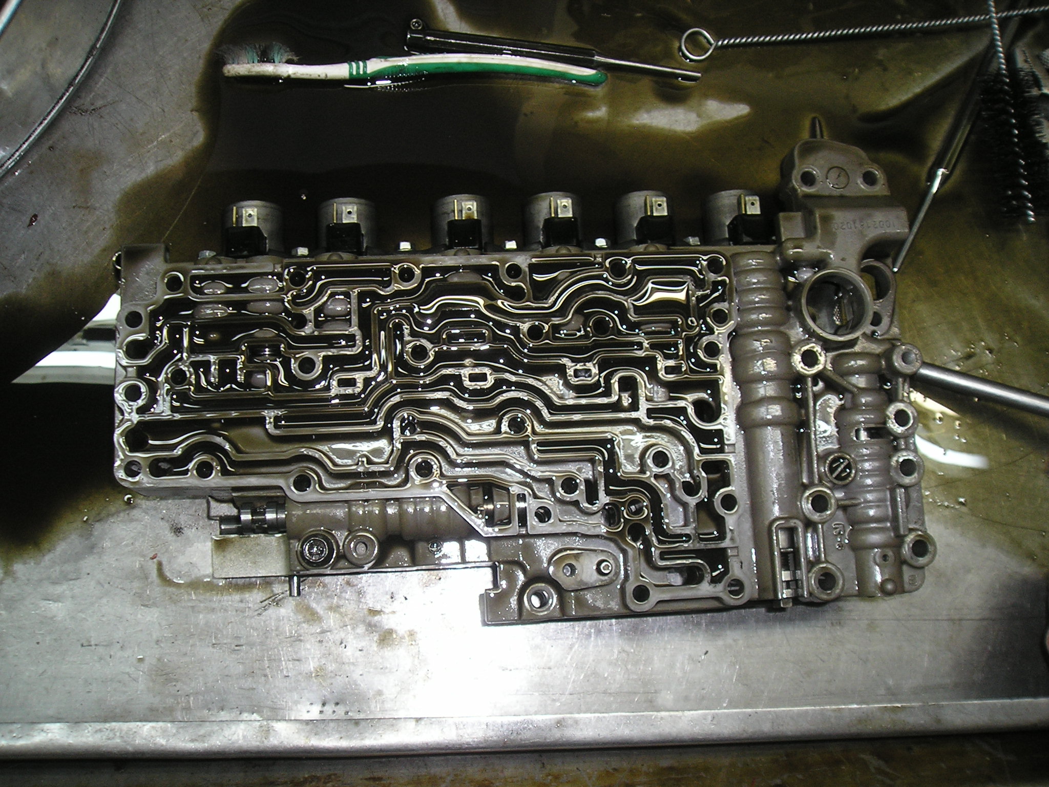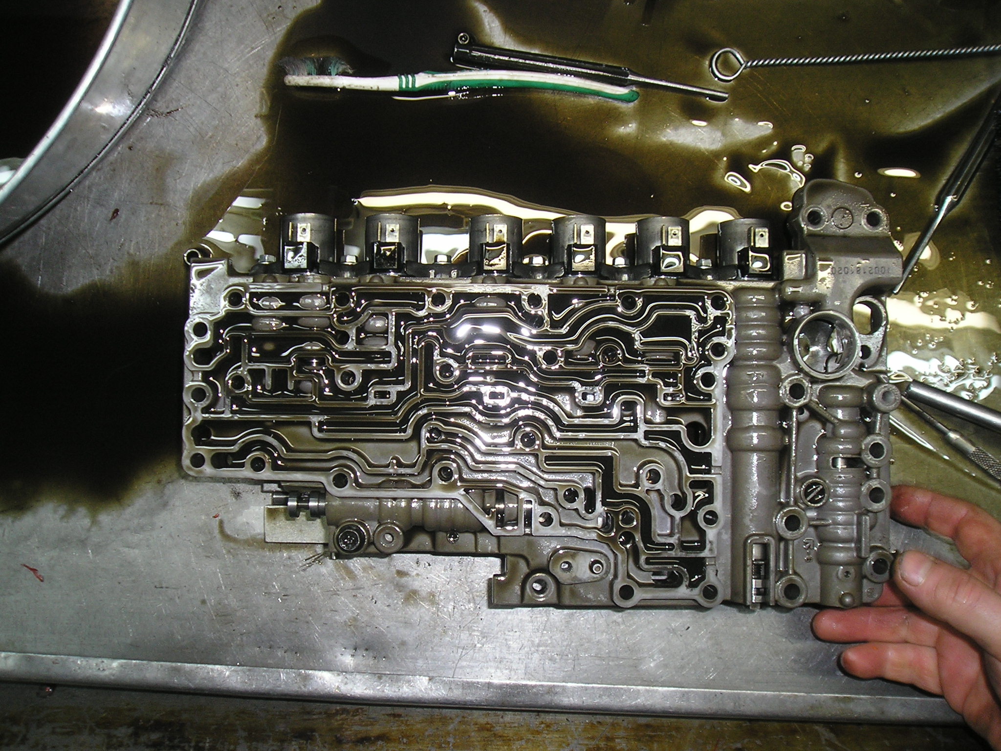 Внутри поддона было довольно чисто. На фото это не очень хорошо видно, масло довольно прозрачное, НО!!!! имело странный зеленоватый оттенок. Ни стружки, ни металлической пудры не видно. Сам гидроблок внутри довольно чистый. Прокладки не вспученные, не разбухшие, но поставил новые - благо стоят по 5!!! рублей (не шутка). Плунжера не зависали, но один хрен все вытащил и промыл. На фото видно специальные ёршики для очистки отверстий под плунжера. Собрал, поставили на место. Поставили дешёвый фильтр (250руб). Прихватили на несколько болтов поддон, залили петроканадовское масло D3M - http://petro-canada.petrolube.ru/upload ... SSPORT.pdf