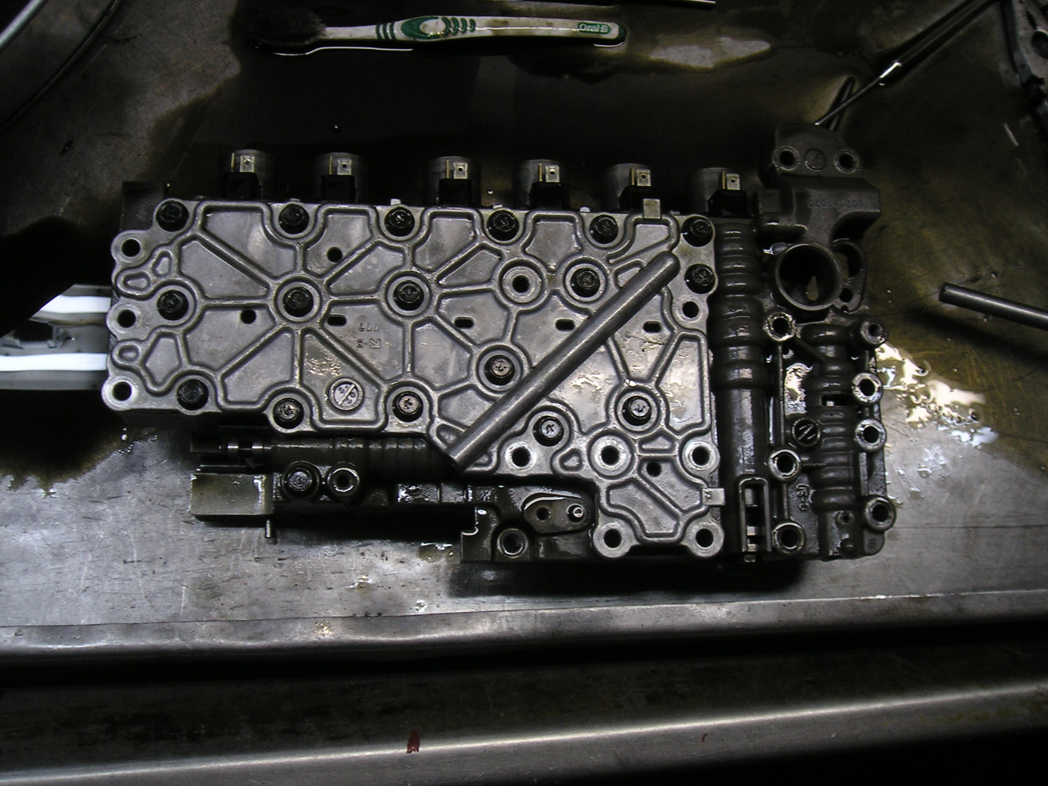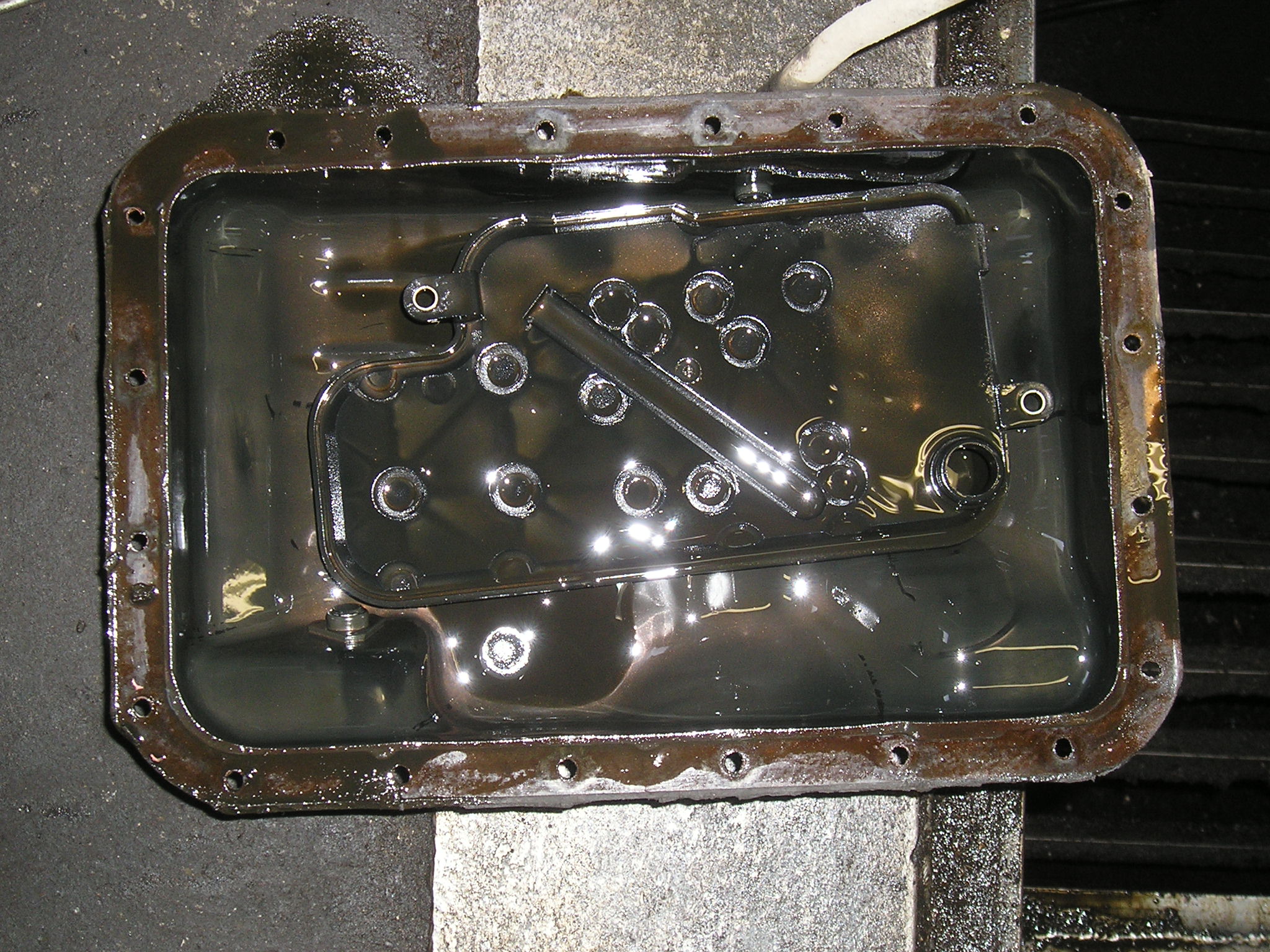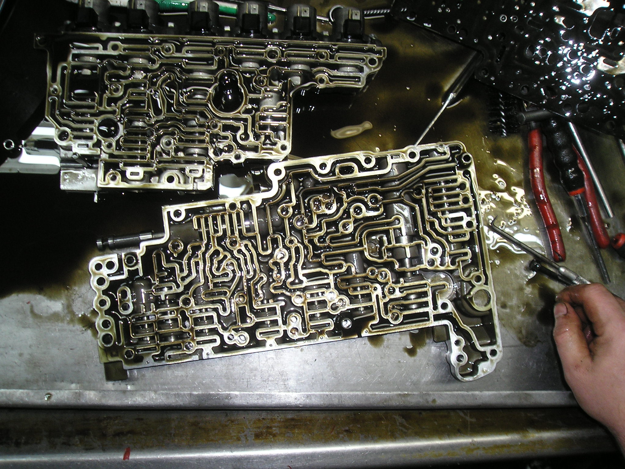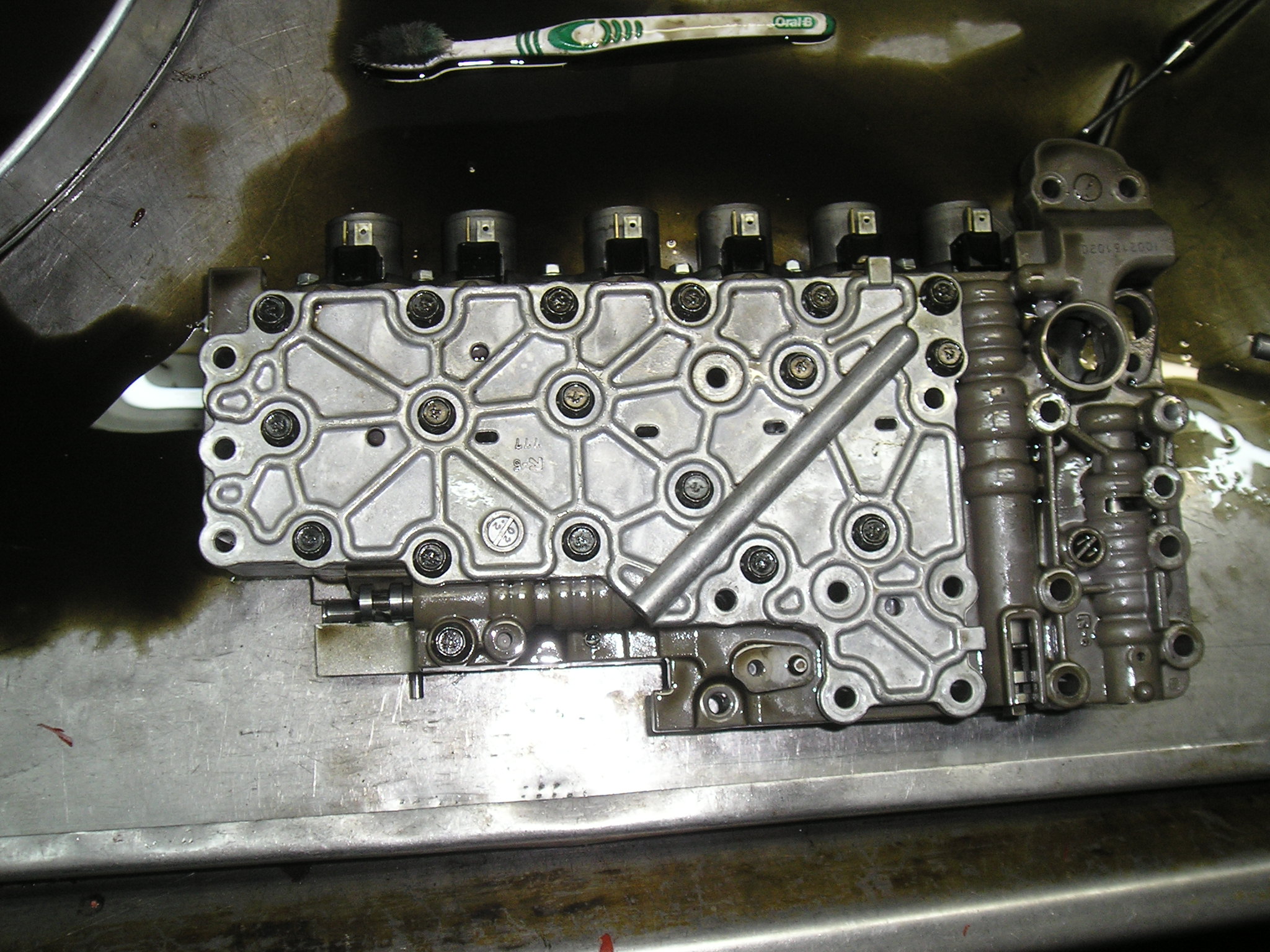 Внутри поддона было довольно чисто. На фото это не очень хорошо видно, масло довольно прозрачное, НО!!!! имело странный зеленоватый оттенок. Ни стружки, ни металлической пудры не видно. Сам гидроблок внутри довольно чистый. Прокладки не вспученные, не разбухшие, но поставил новые - благо стоят по 5!!! рублей (не шутка). Плунжера не зависали, но один хрен все вытащил и промыл. На фото видно специальные ёршики для очистки отверстий под плунжера. Собрал, поставили на место. Поставили дешёвый фильтр (250руб). Прихватили на несколько болтов поддон, залили петроканадовское масло D3M - http://petro-canada.petrolube.ru/upload ... SSPORT.pdf