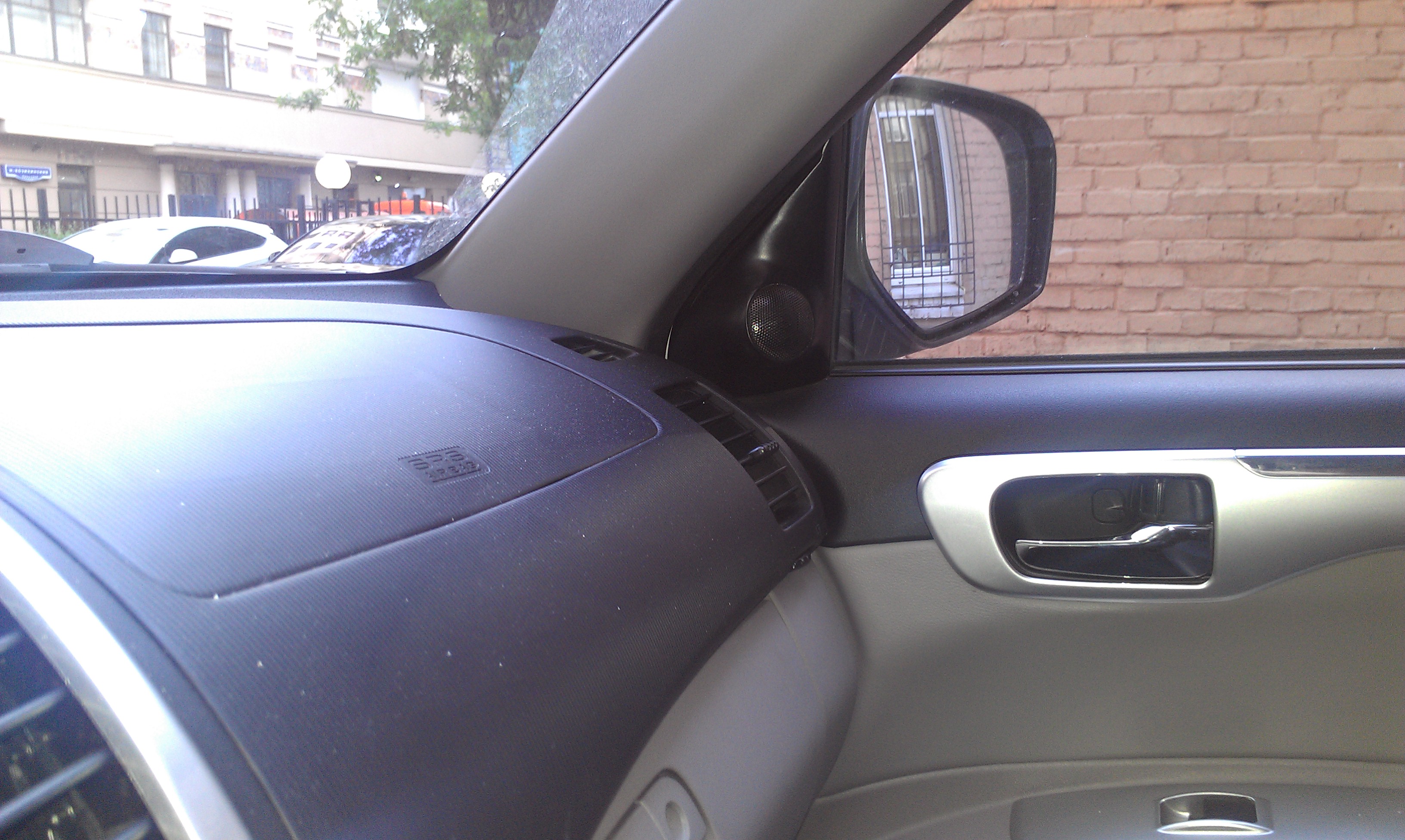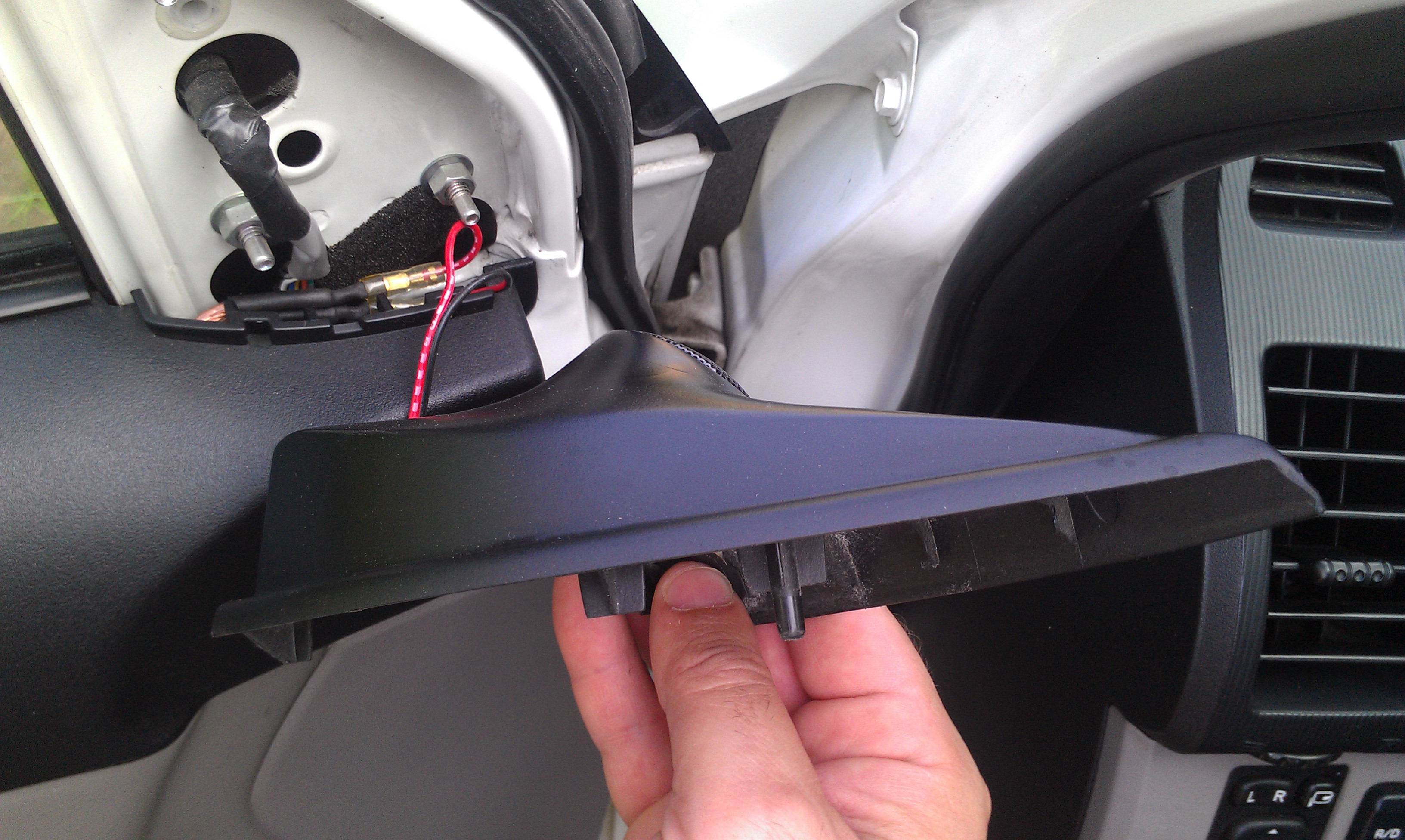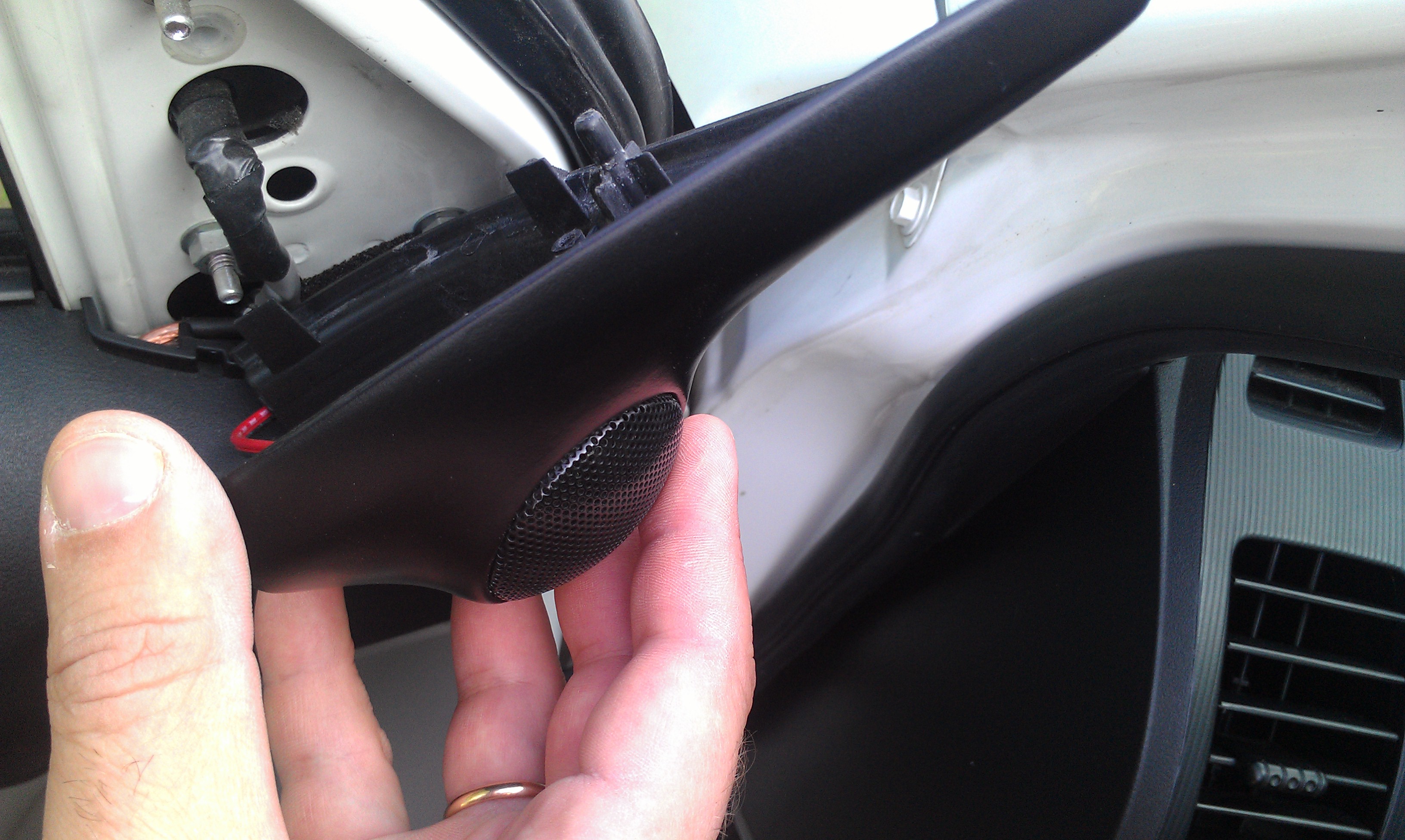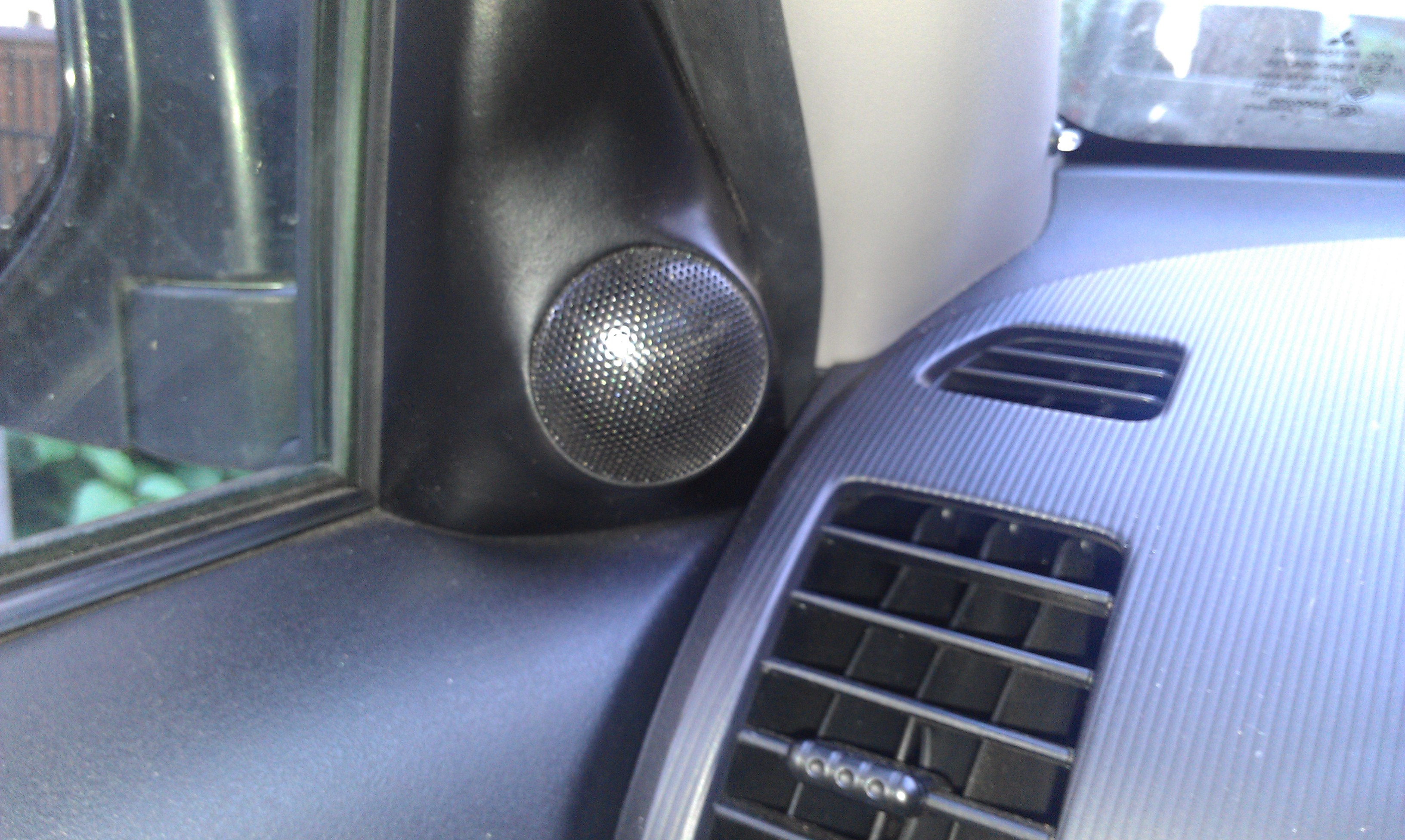 Однако это не самое лучшее место для пищалок, особенно в данном авто. Если ставил бы сейчас, однозначно поставил бы в стойки лобового стекла, примерно на уровне верхнего угла треугольника. По теории ВЧ динамик должен стоять на 5-10 см. ниже уровня уха.