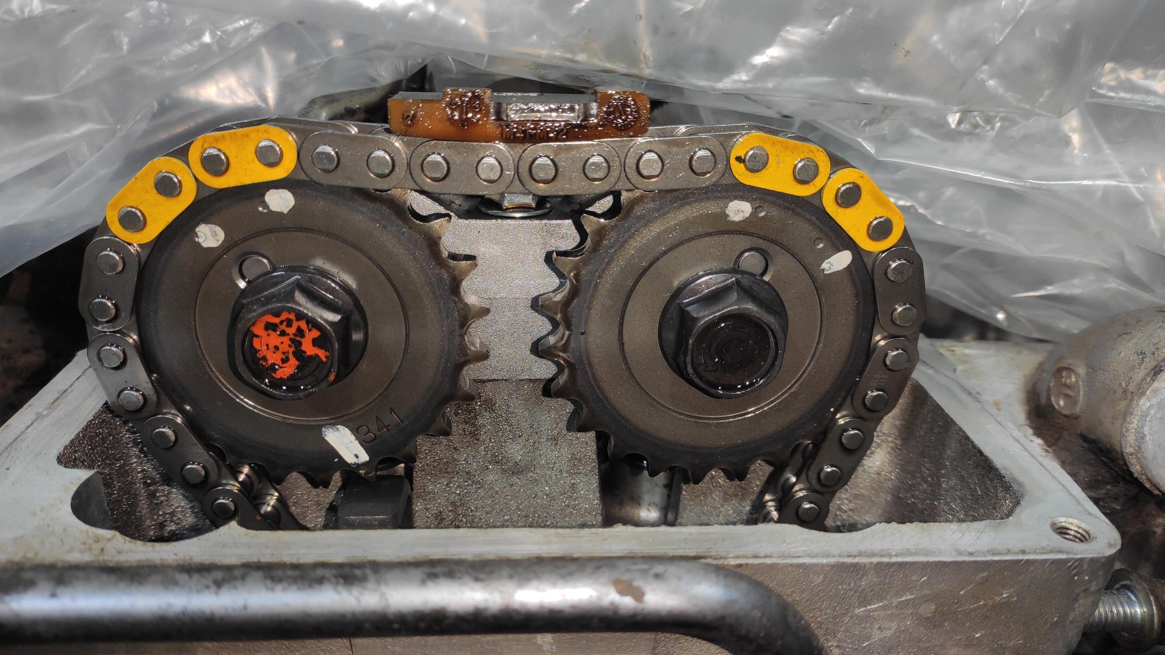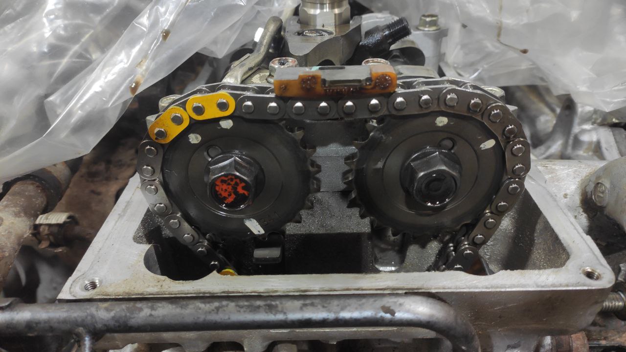 Что делать? Крутить дальше еще несколько часов или в таком положении можно уже снимать цепь и выставлять ее желтыми звеньями уже на распредвалах и смотровом окне?