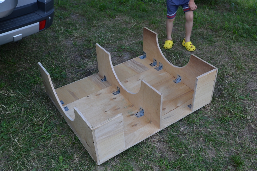Средняя стойка у меня следствие экономии материала, ее можно было и не делать если использовать единый лист для полки. Что касается ниши, то, с полкой я езжу только когда в лесу ночую, можно и потерпеть, остальное время она в гараже валяется. Велик вожу на крыше, он грязный как правило и места много занимает, в салон его не кладу. Я думаю, что если так нужно в нишу лазить всегда и всюду, то можно сделать каркас из металла, обходя места открывания люка. Я просто не парился на эту тему.
