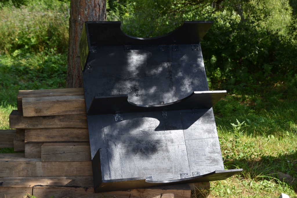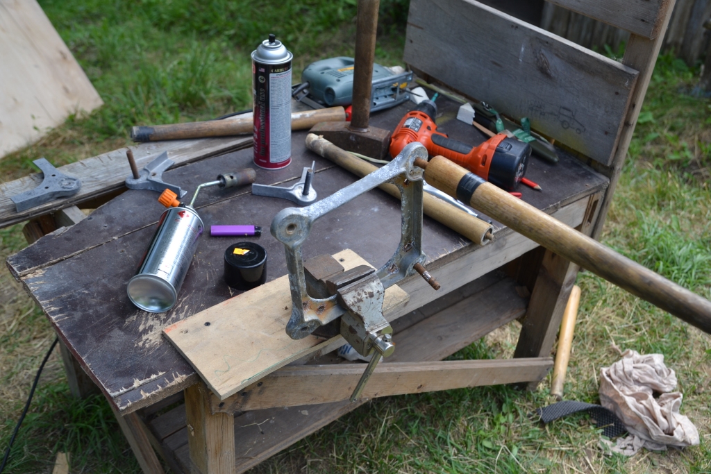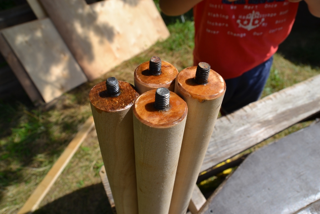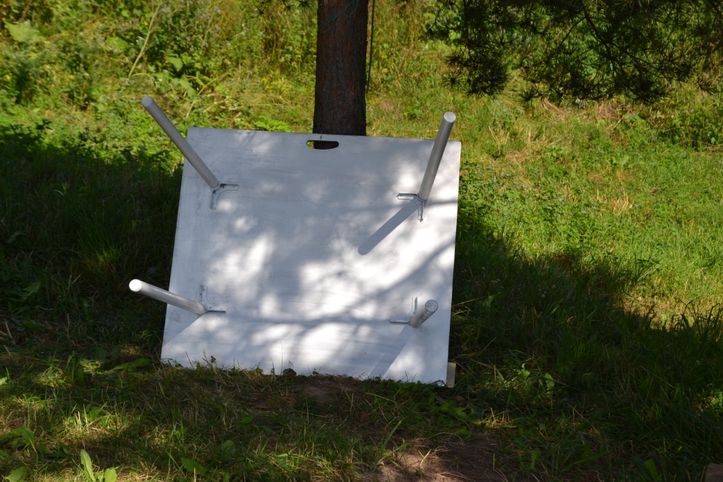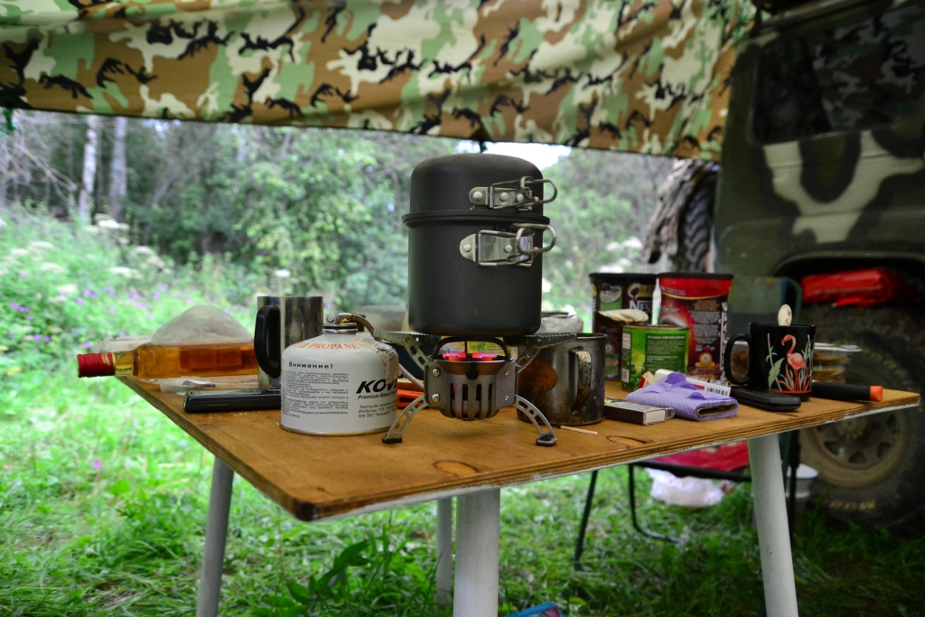 В догонку к спальнику столик. 90Х110 (примерно) лист фанеры, пилим остов от старой табуретки, ножки из черенков в них на клей болты, красим. Трудозатрат 4 часа. Главное столик в походном положении кладется на полку (он как раз с нее размером) и фактически только поднимает уровень на толщину листа. Более места не занимает. Ножки под полку. Крайне компактно даже в сравнении с раскладными магазинными столами.