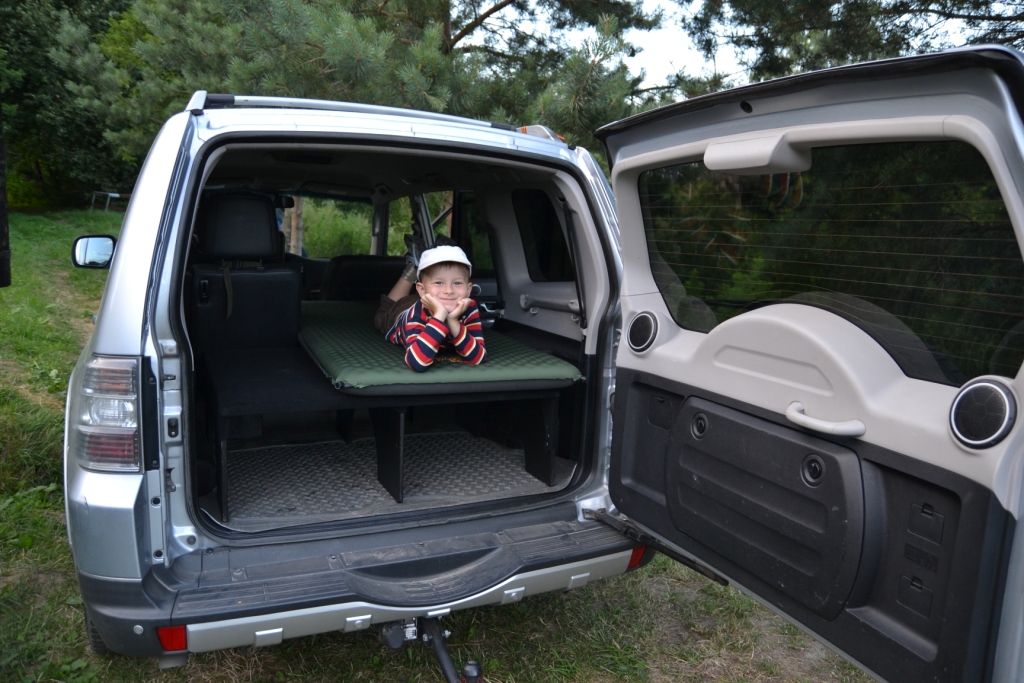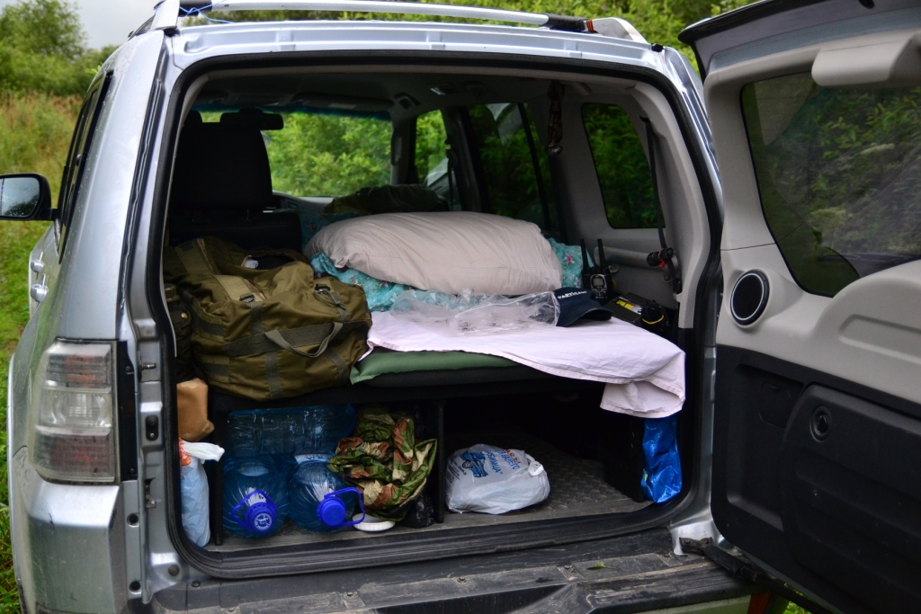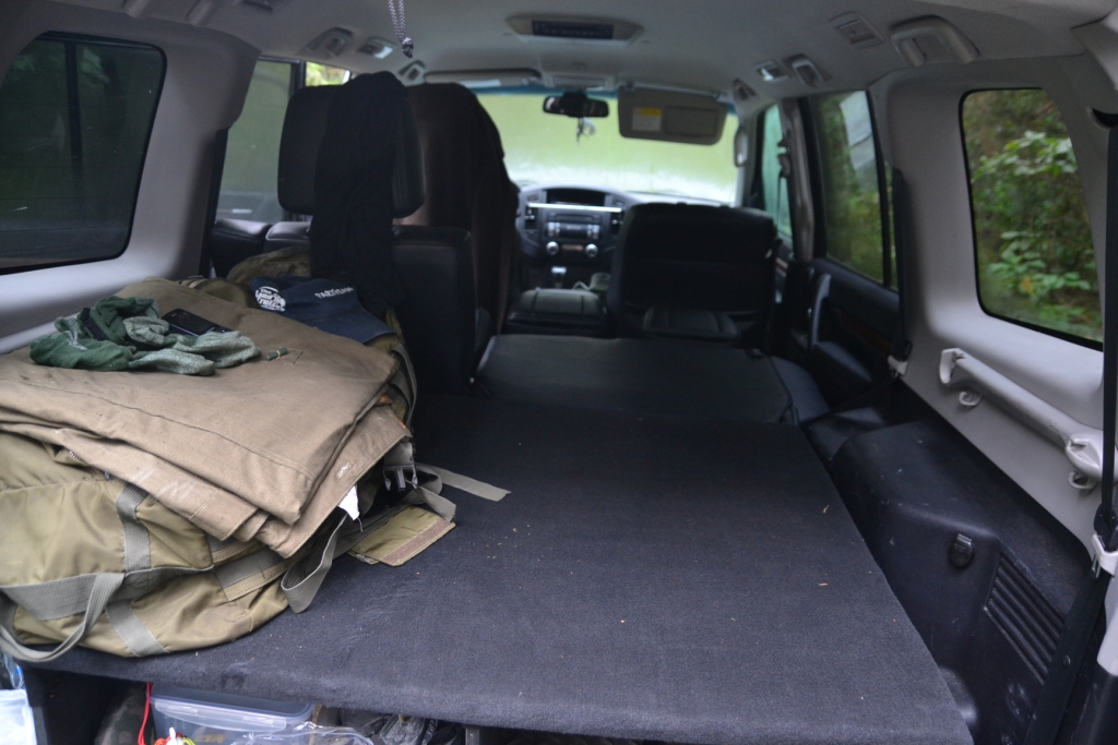Бог не дал Паджерику ровный пол для сна его пассажиров. Но, это поправимо. Трудозатрат на день, денег до 2000 рублей. Далее см. фото. Спальное место 2м ширину уже не помню, двое мужиков ложатся вполне комфортно. Лучше применять надувной коврик, он отлично сглаживает все неровности, но можно и без него. Обратите внимание на фокус с подголовниками.