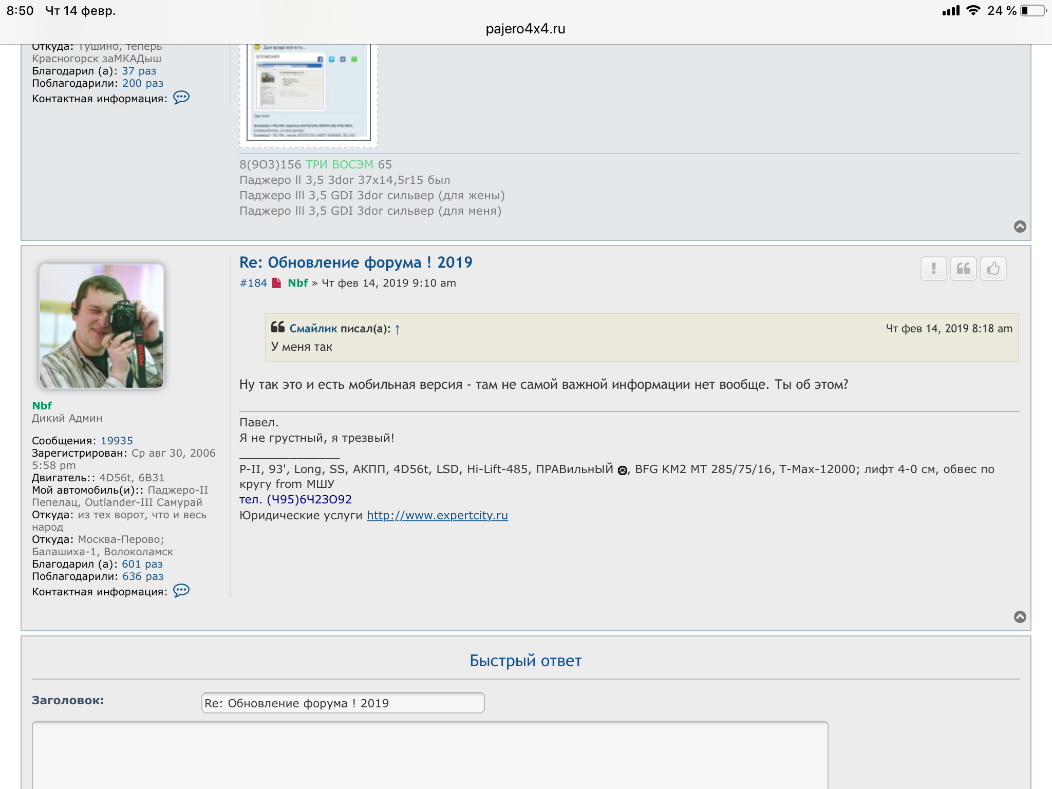 А где включить полную версию?Nbf писал(а): ↑14 фев 2019, 08:58 Смотри у Смайлика - у него нормальная. А у тебя устройство может как десктоп распознаваться- тебе полную показывают. Кроме того, судя по скрину у тобе вапче планшет, а не труба. Если Смайлик на странице поставит галочку "Полная версия" - он увидит тоже самое, что и ты.