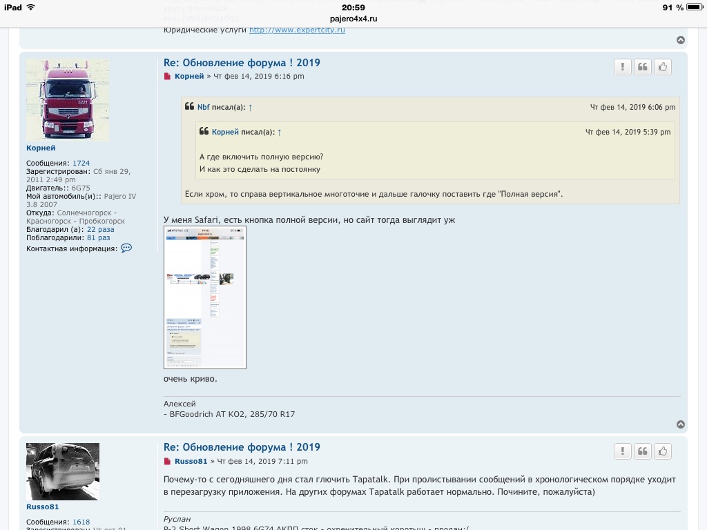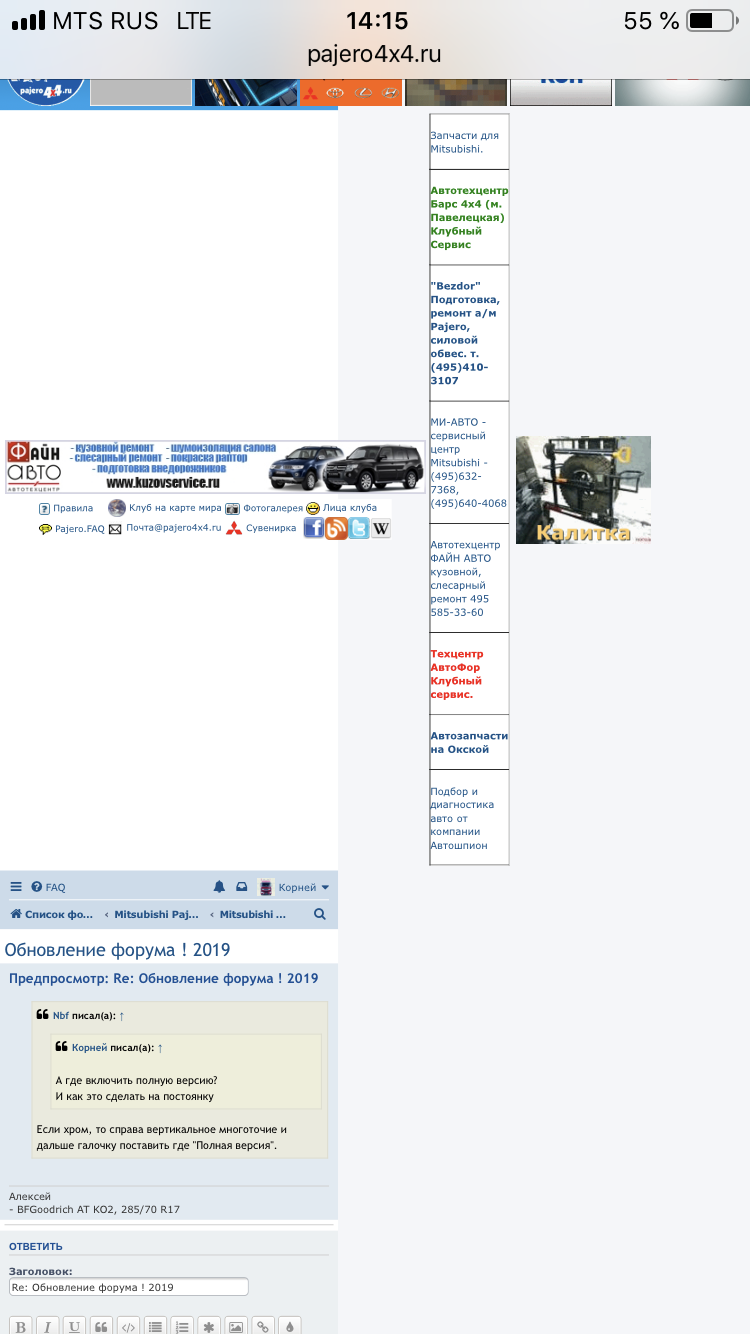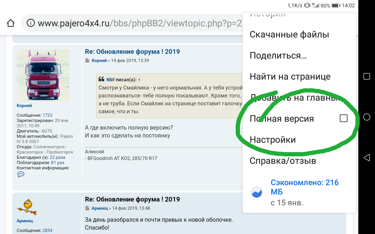 Если хром, то справа вертикальное многоточие и дальше галочку поставить где "Полная версия".Корней писал(а): ↑14 фев 2019, 13:39А где включить полную версию?Nbf писал(а): ↑14 фев 2019, 08:58 Смотри у Смайлика - у него нормальная. А у тебя устройство может как десктоп распознаваться- тебе полную показывают. Кроме того, судя по скрину у тобе вапче планшет, а не труба. Если Смайлик на странице поставит галочку "Полная версия" - он увидит тоже самое, что и ты.