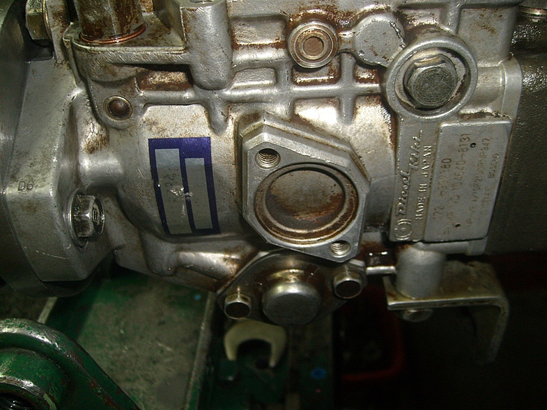 "В варианте с автоматом прогрева здесь ставится узел (терморегулятор), который в зависимости от температуры ОЖ смещает рычаг управления подачей, и через отверстие в корпусе сдвигает обойму роликов, изменяя угол впрыска (в раннюю сторону на холодном моторе)." Фото.