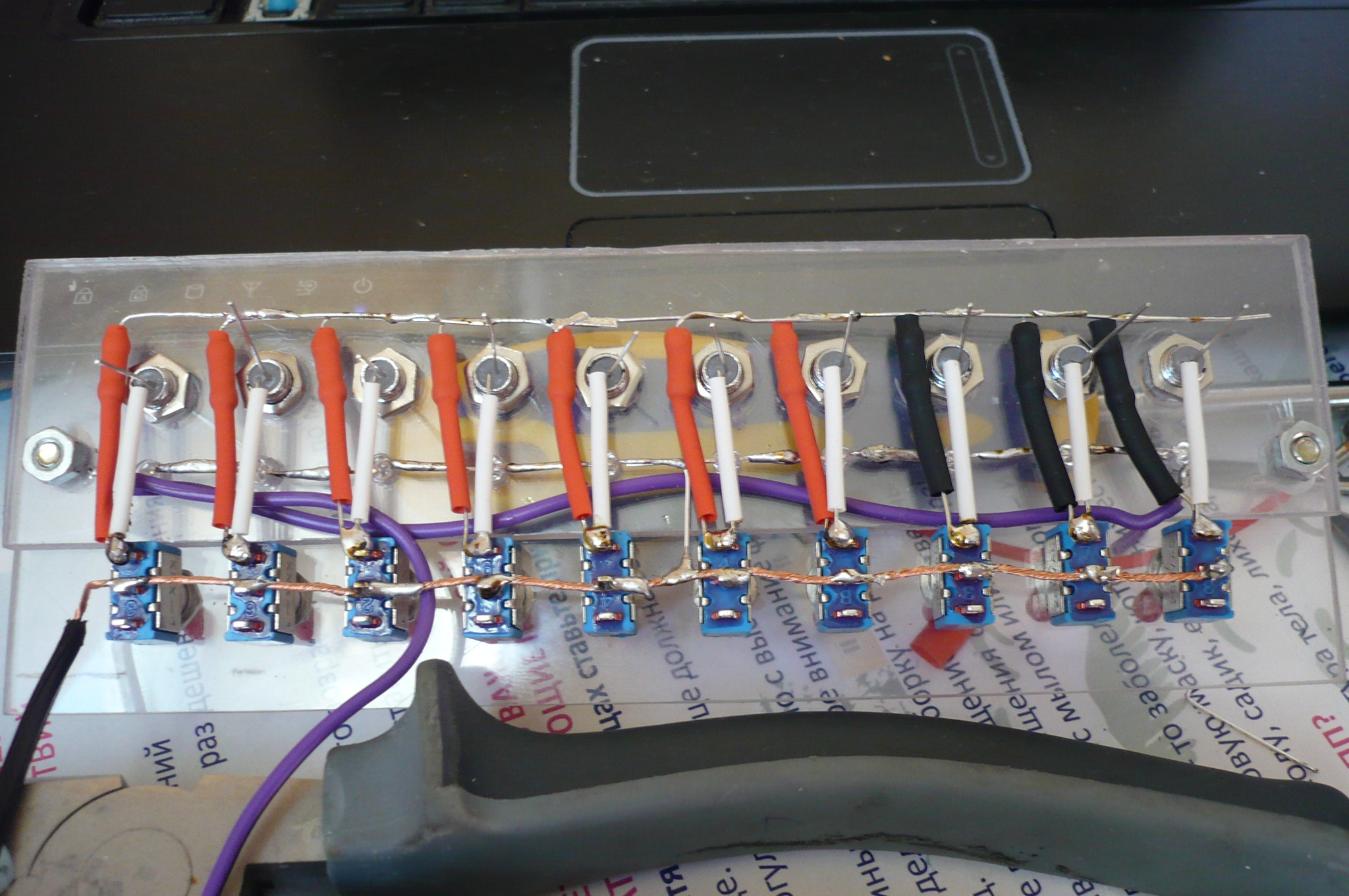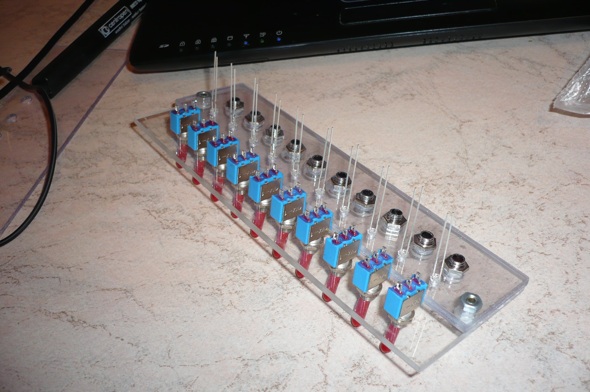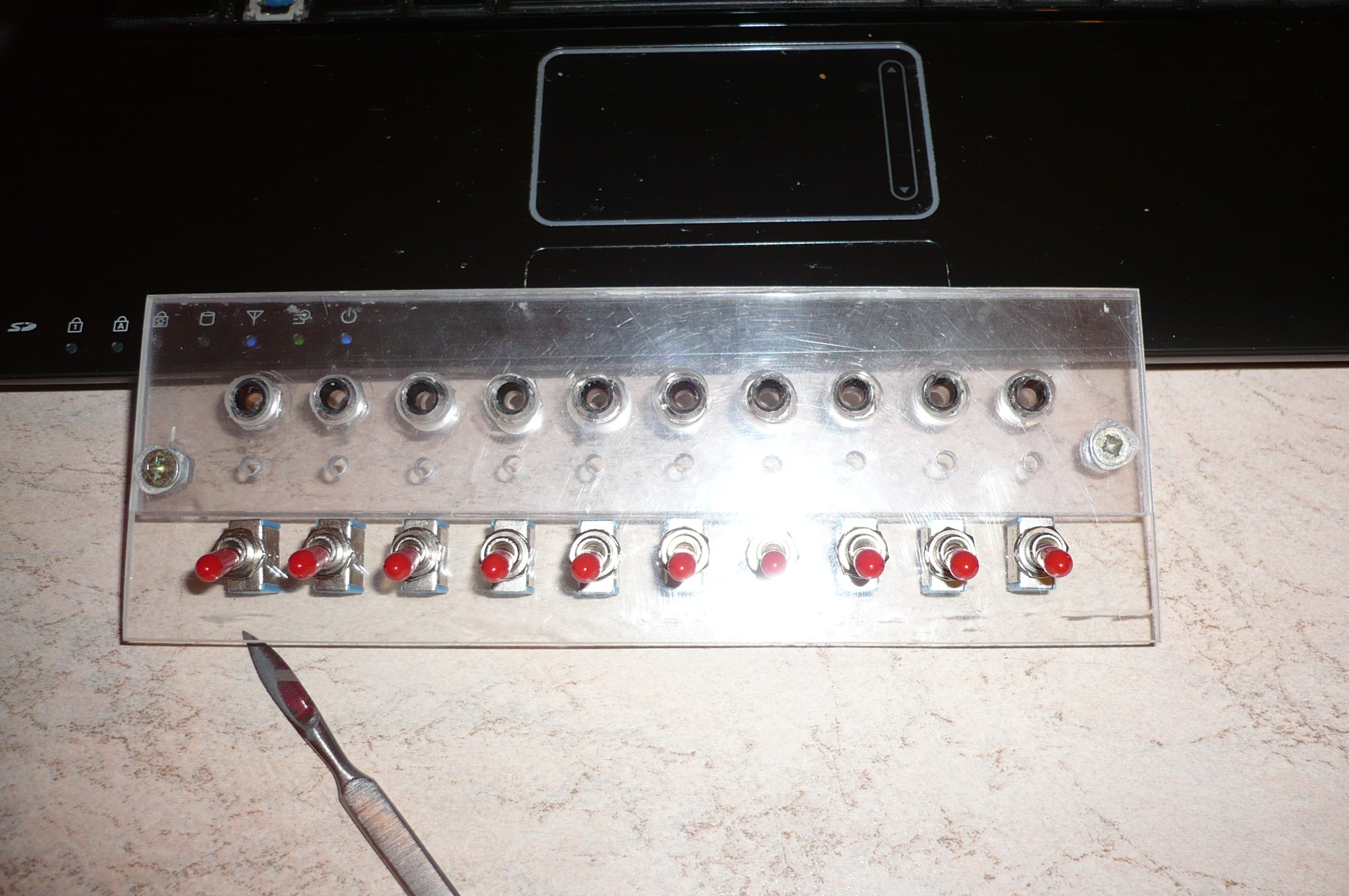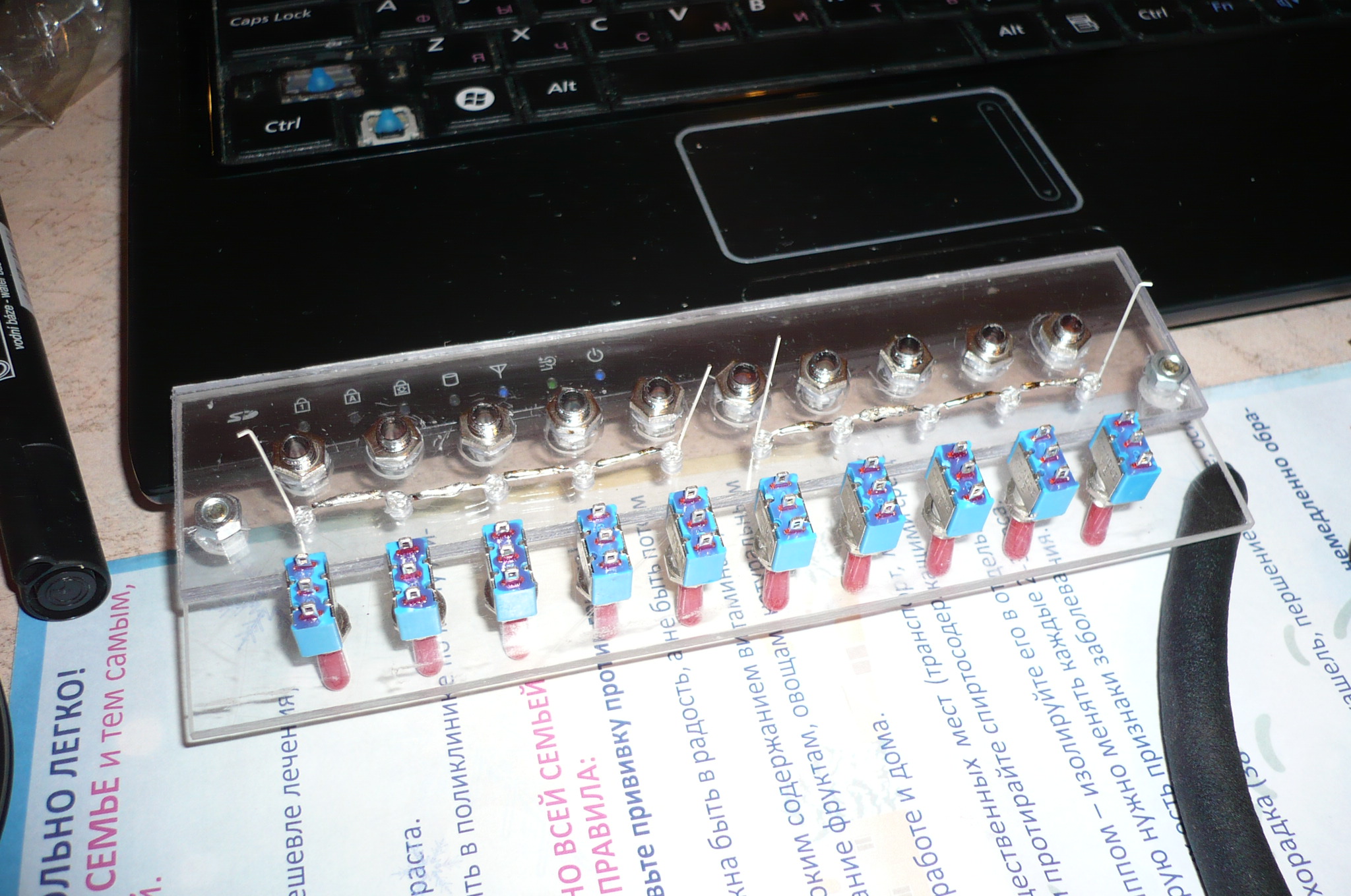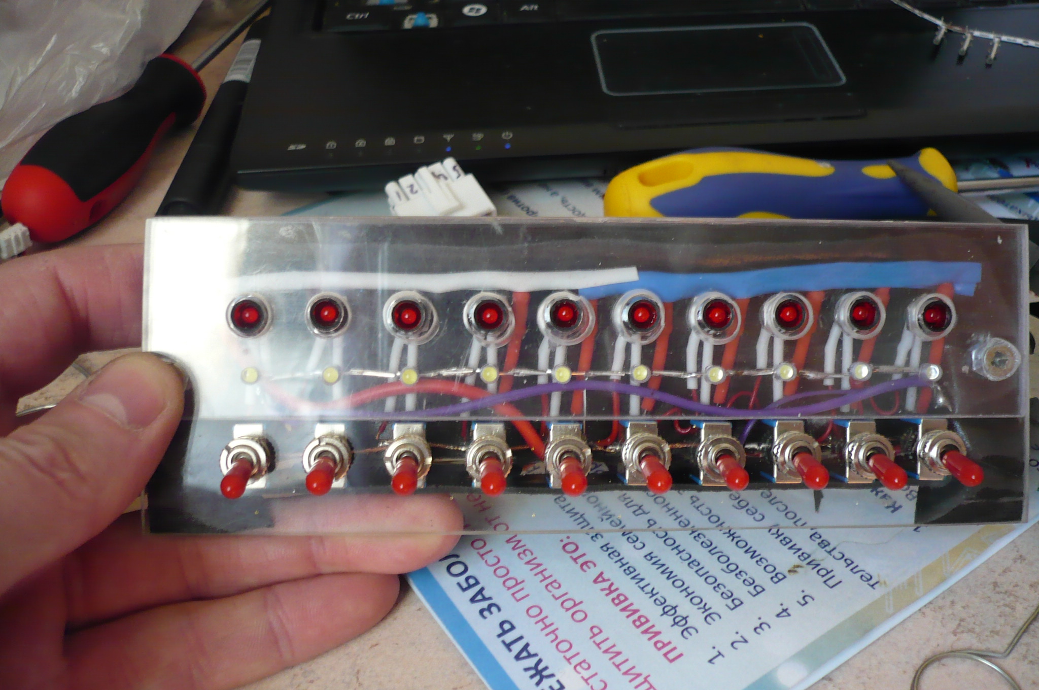 По поводу индикации мысля была (тумблера специально пониже сделал, оставив место под подсветку), только хо4у пустить 4ерез обозна4ение кнопок с подсветкой. Как обозна4ение и подсветку сделать можно сказать уже придумал а вот с индикацией туговато.
