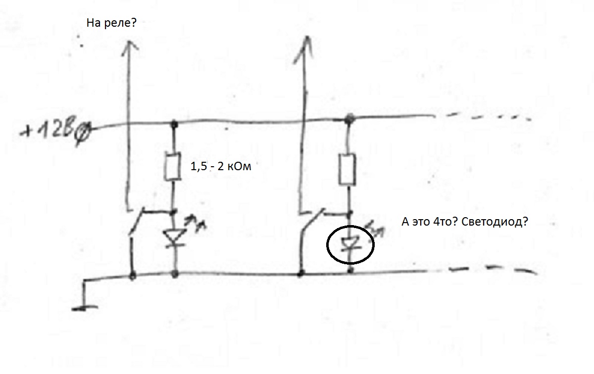 Да, стрелочки на реле, а то что ты обвёл, это и есть светодиод, правильно понимаешь. Только когда будешь светодиоды покупать, обязательно уточни, чтоб у них внутри резисторов не было. Тебе нужны просто отдельно светодиоды и отдельно резисторы. Номинал резисторов любой от 1,5 до 2 килоом, можно даже чуть больше. Мощность резисторов любая от 0,125 до 0,5 Вт (можно и мощнее, но они уже по габаритам будут великоваты).